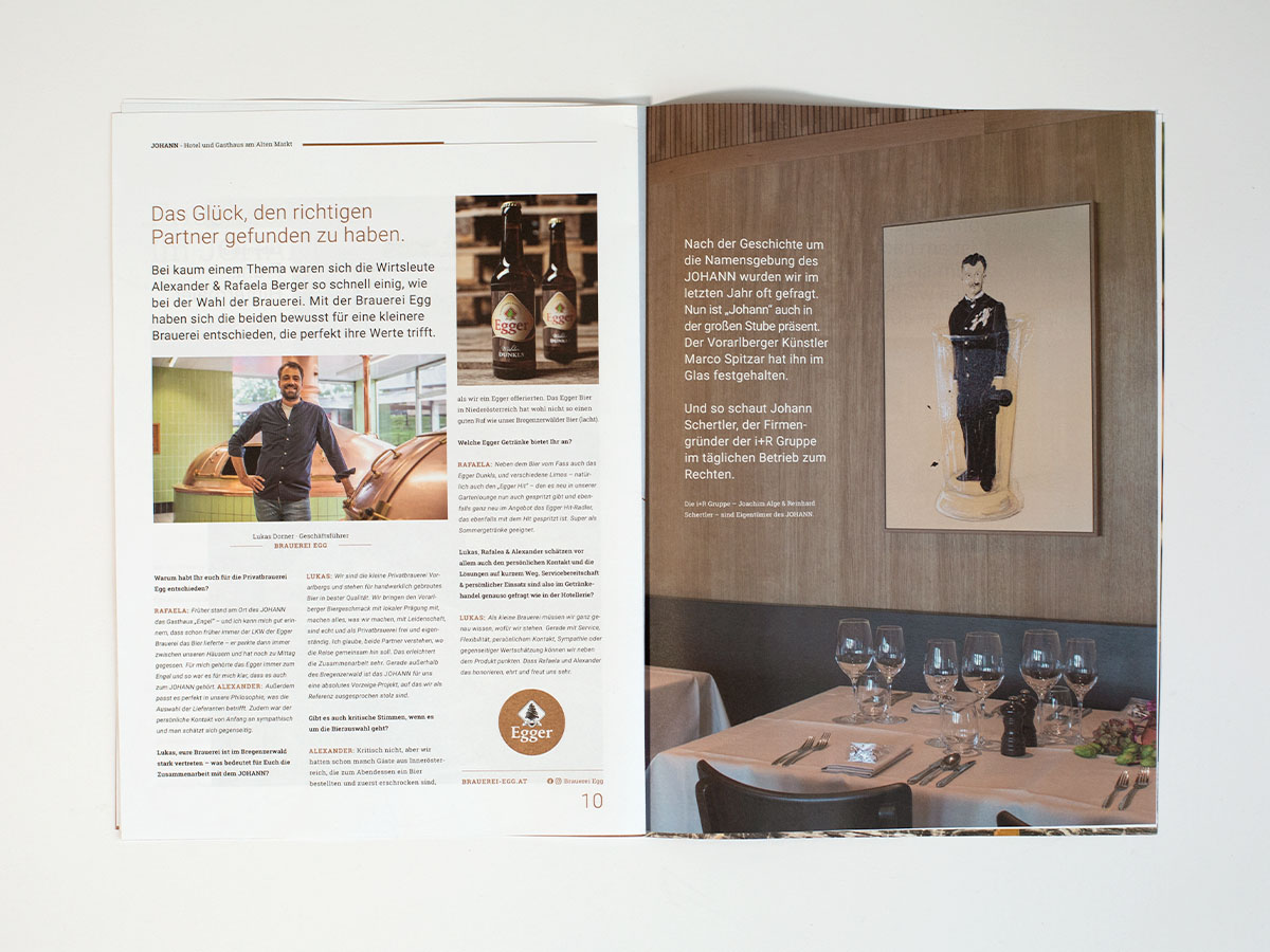 Im gastronomischen Rahmen des Johann wurden Teile der Werkserien Herren im Glas, Gurkengläser und der Brownie ausgestellt. Die Auswahl wurde von den Betreibern Rafaela und Alexander Berger persönlich getroffen und um den Namensgeber des Gasthauses, Johann Schertler, im Glas kongenial ergänzt.