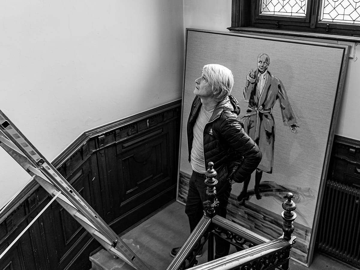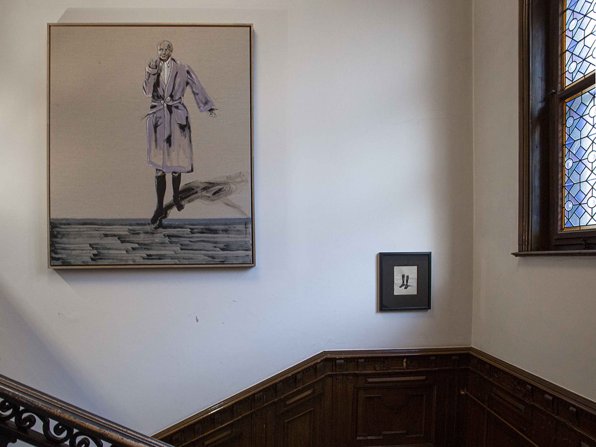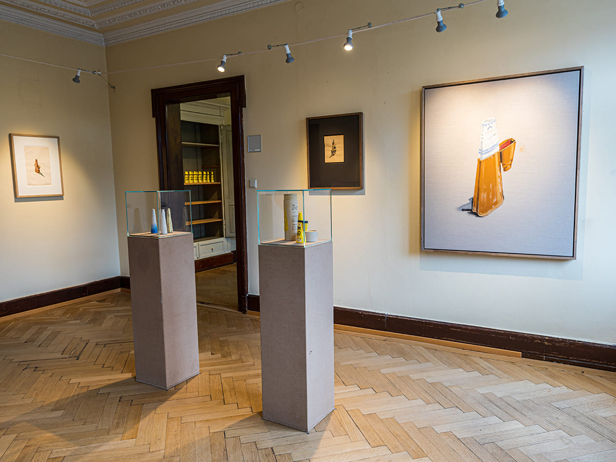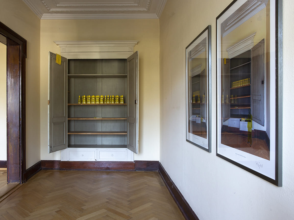 Die Jugendstilvilla bietet eine wunderschöne Kulisse für die oft historisch anmutenden Zeichnungen und Gemälde von Marco Spitzar. Die archaischen Themen der Fußbäder könnten schon immer im grandiosen Stiegenhaus gehangen sein. Und der vorgefundene historische Einbauschrank ermöglichte eine gelungene Inszenierung der Vorratshaltung der UHU flinken Flasche. Fotografie: Jasmin Fischbacher.