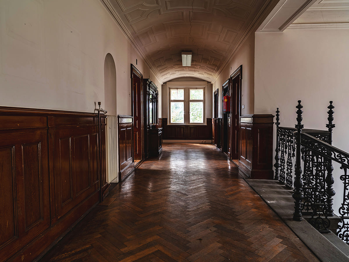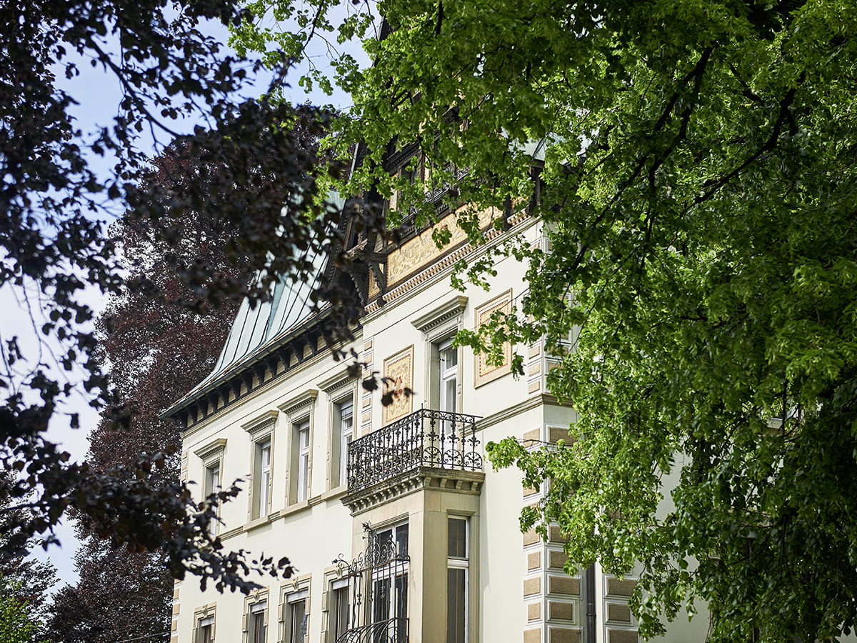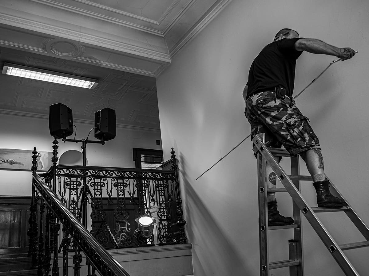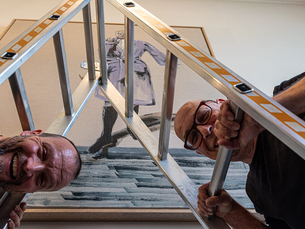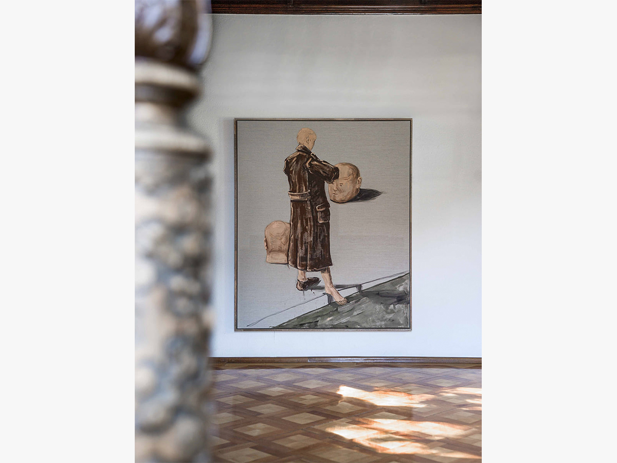 Die Jugendstilvilla bietet eine wunderschöne Kulisse für die oft historisch anmutenden Zeichnungen und Gemälde von Marco Spitzar. Die archaischen Themen der Fußbäder könnten schon immer im grandiosen Stiegenhaus gehangen sein. Und der vorgefundene historische Einbauschrank ermöglichte eine gelungene Inszenierung der Vorratshaltung der UHU flinken Flasche. Fotografie: Jasmin Fischbacher.