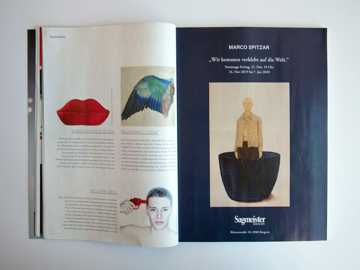 Dieser Frage geht Marco Spitzar in seiner Ausstellung in den Sagmeister-Shops in Bregenz nach. Medien, Mode und Interieurmagazine sind für Marco Spitzar wichtige Grundlagen zur Erforschung von kleidsamen Situationen mit gesichtslosen Körpern. Verdichtete Stofflichkeiten entwickeln eine eigene Welt, die nicht nur an der Oberfläche fasziniert, sondern den Betrachter in Fragen über Fragen über Fragen verstrickt.