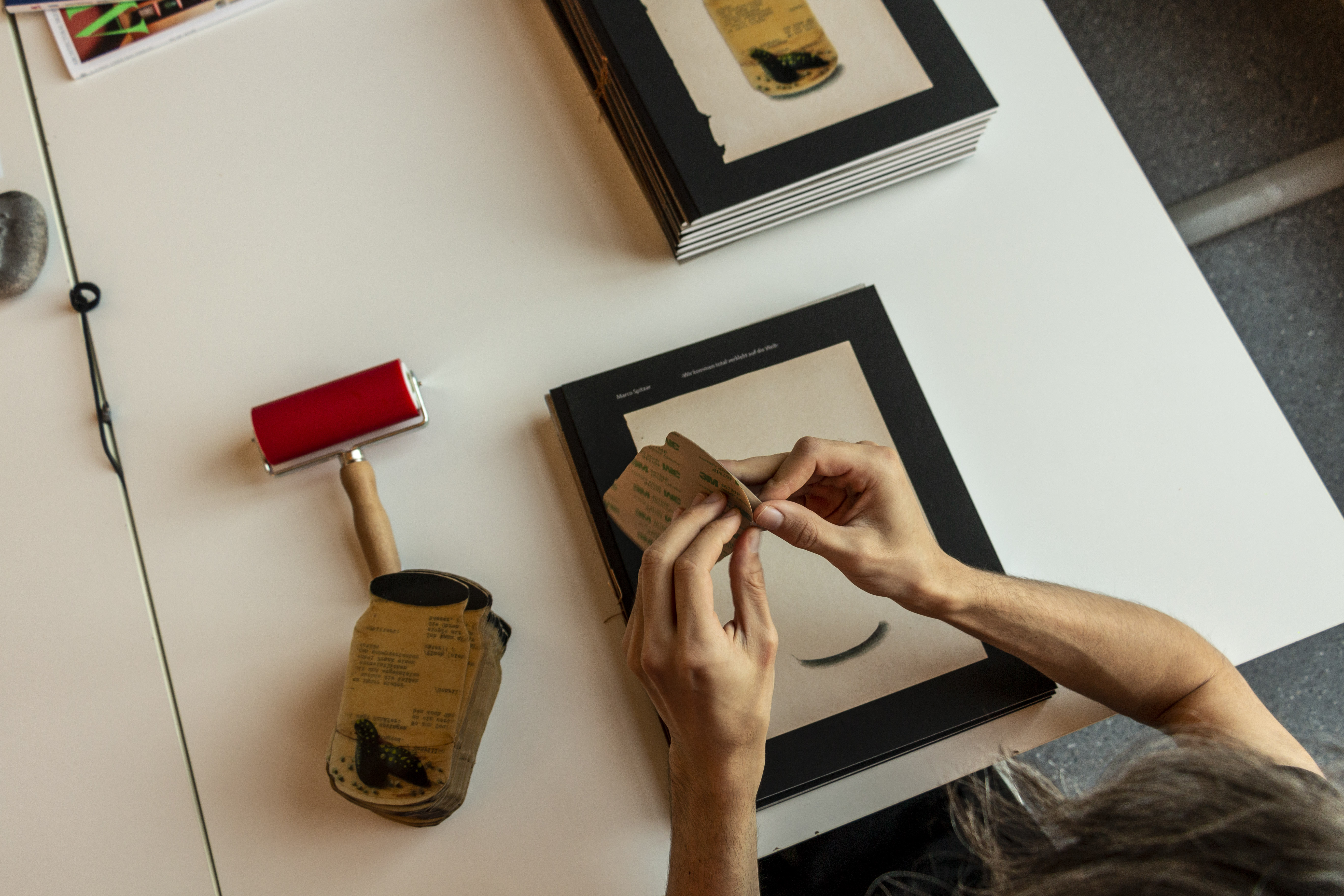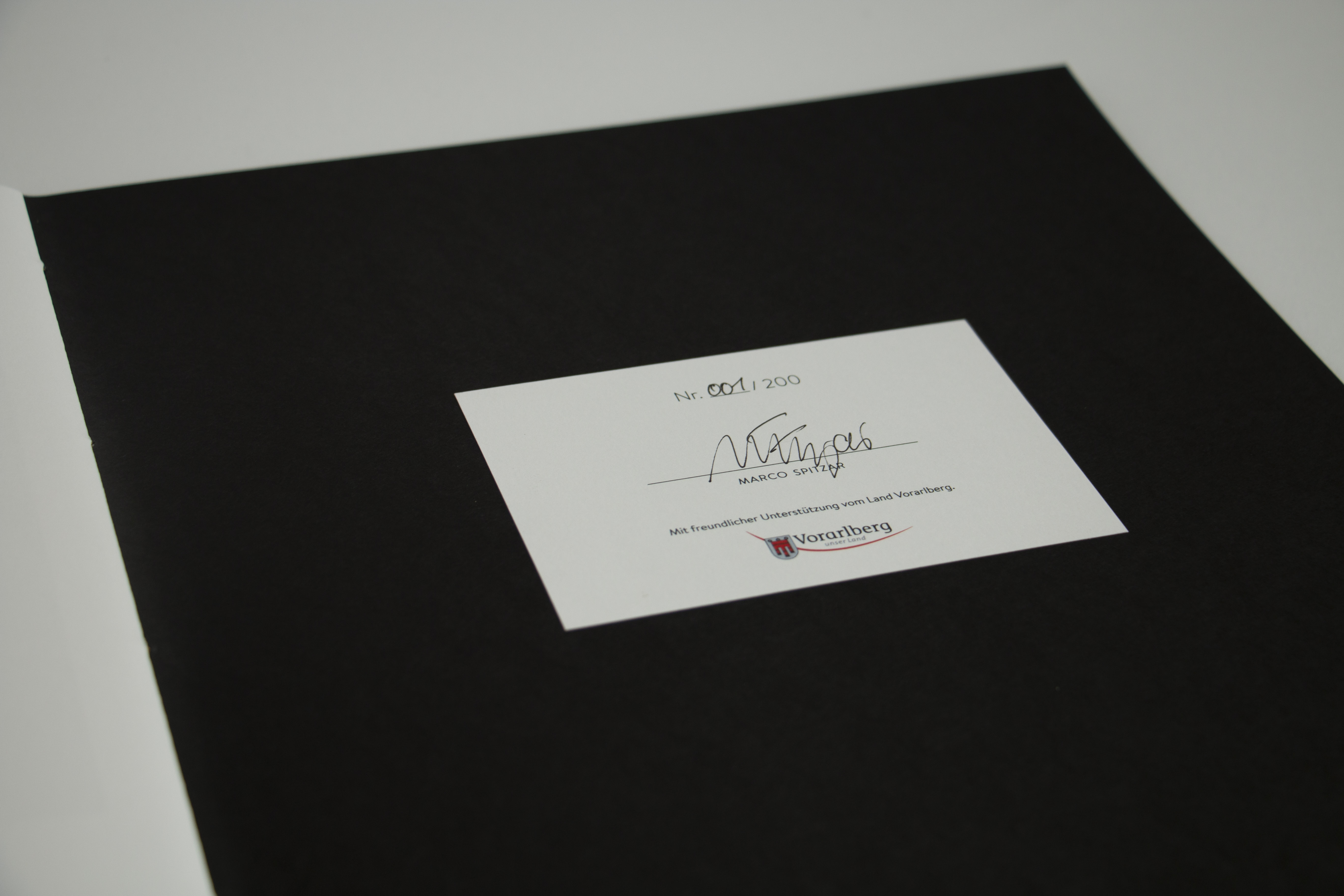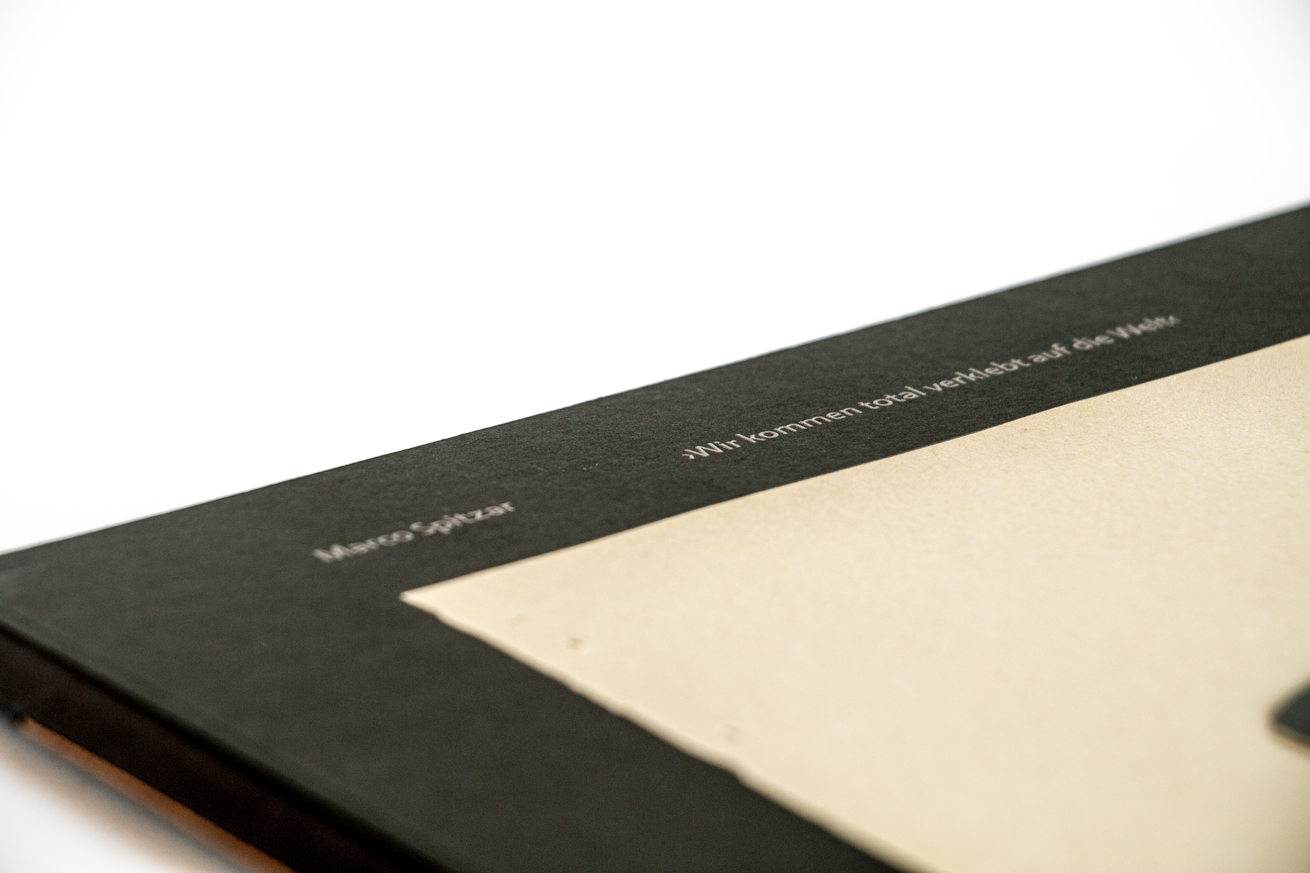 Der »UHU« steht im Zentrum des Werkkataloges »Wir kommen total verklebt auf die Welt« des Vorarlberger Künstlers Marco Spitzar. Dem Künstler geht es jedoch weniger um die verbindende Eigenschaft des bekannten gelben Klebstoffes, denn um seine haptische und visuelle Wirkung die einer partiellen UV-Lackierung ähnelt. Dieser Effekt wurde auf dem Cover nachgestellt und gibt den Leser:innen die Möglichkeit die skulpturalen Eigenschaften der Zeichnungen zu erfahren. Ein schwerer und stabiler Karton legt sich schützend um den Inhalt und umso überraschender ist es, dass dieses Buch eigentlich ein Heft ist, das auf einer einfacher Fadenheftung basiert. Diese Bindetechnik ist jedoch nicht pragmatisch eingesetzt, sondern verhält sich harmonisch zum Inhalt und führt dazu, dass sich die Seiten wunderbar öffnen und blättern lassen. Hier wird der Raum geschaffen für ein Bildlayout, das von briefmarkengroßen bis zu fast seitenfüllenden Abbildungen changiert. Die schwere und stabile Hülle des Covers erzeugt im Zusammenspiel mit dem spannenden Bildlayout und der Fadenheftung eine konsistente Form, welche das künstlerische Werk vielschichtig erfahrbar macht.