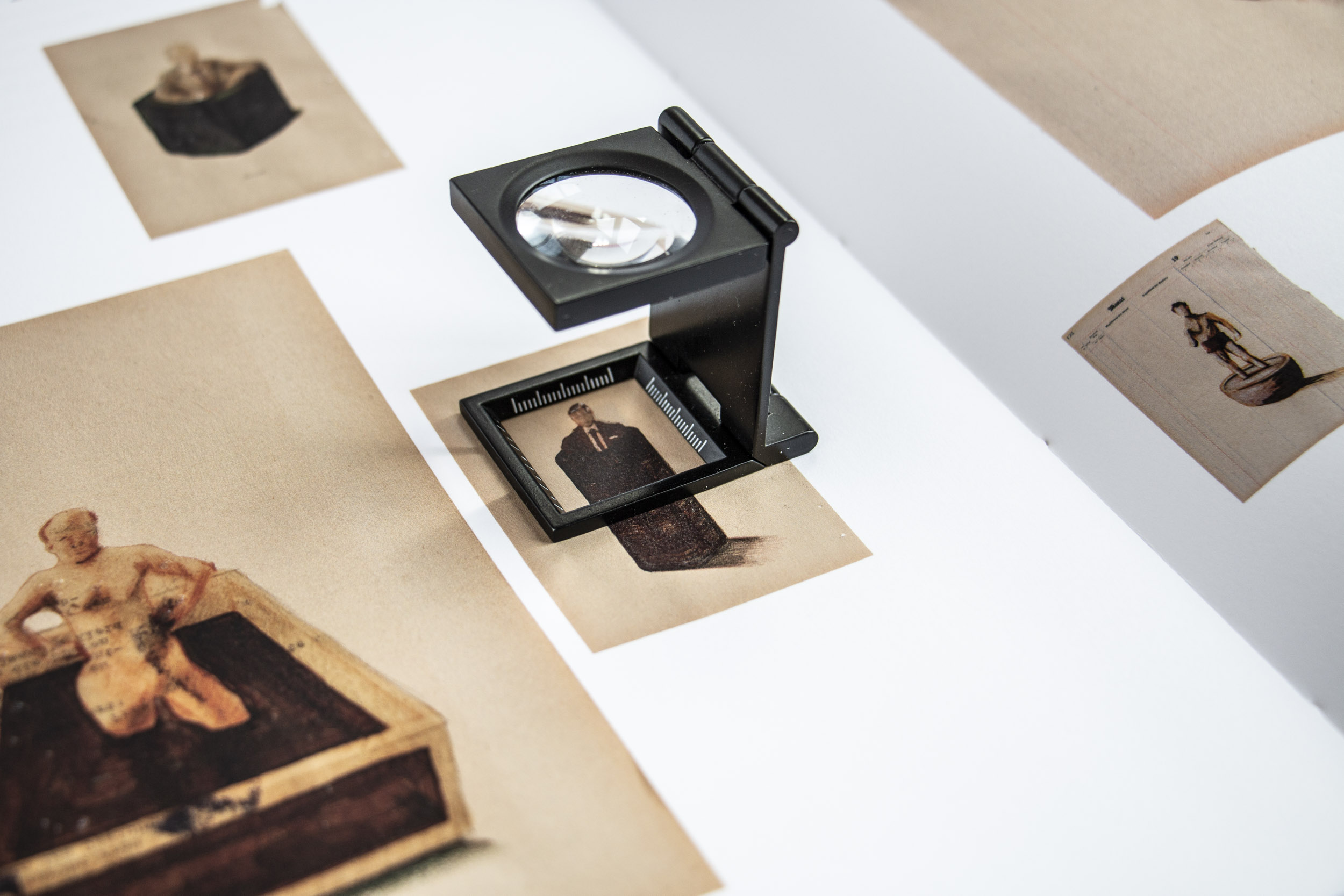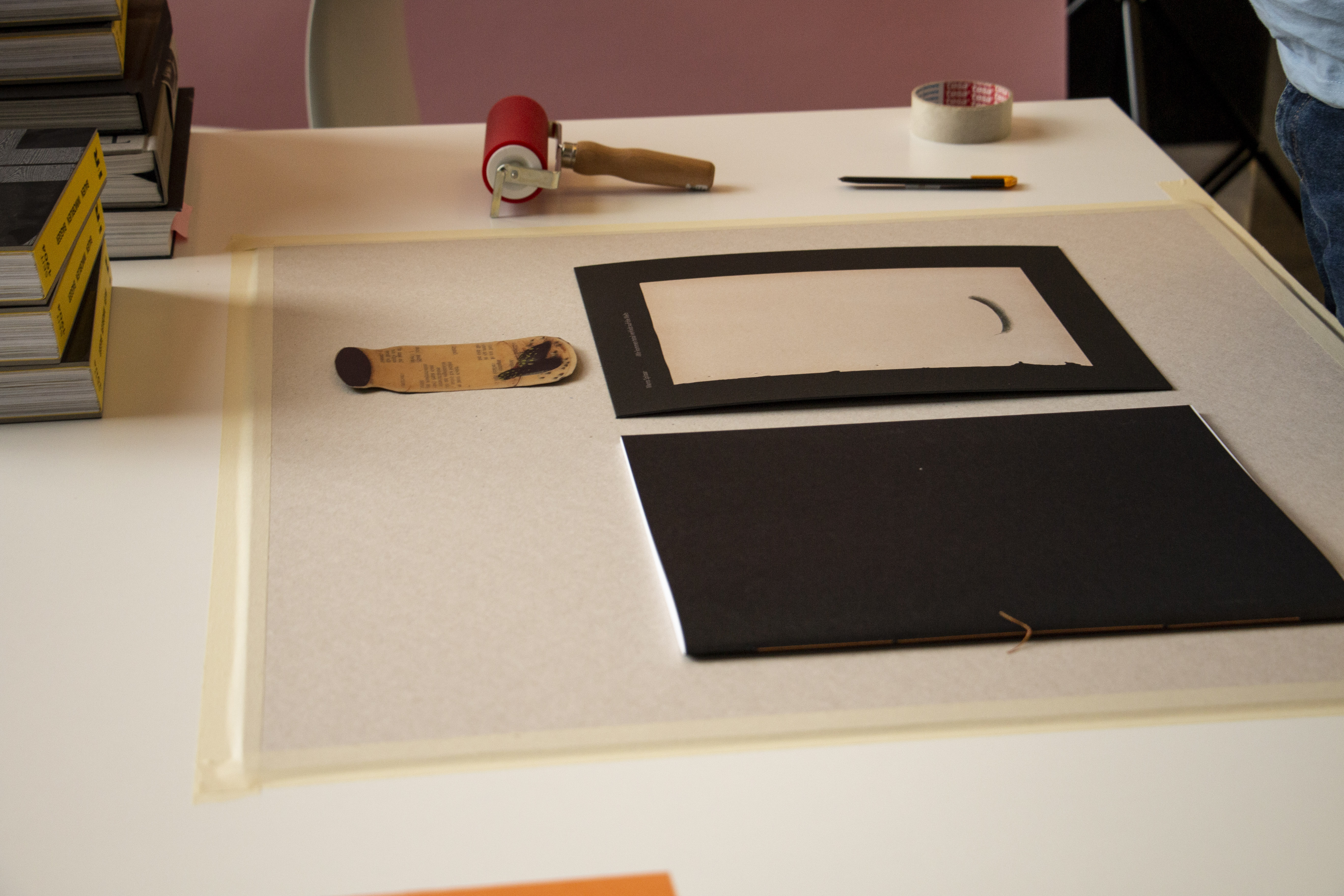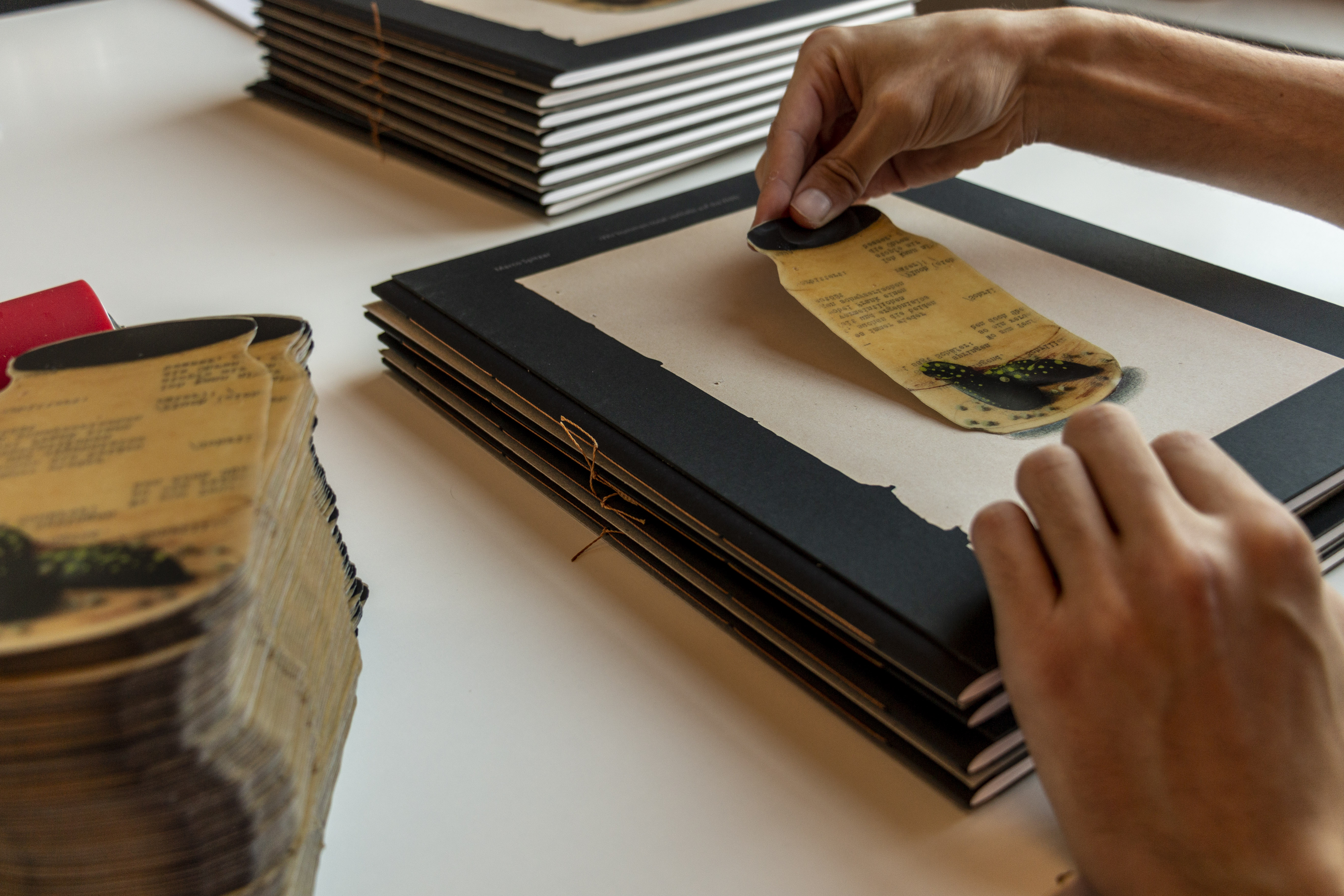 Der »UHU« steht im Zentrum des Werkkataloges »Wir kommen total verklebt auf die Welt« des Vorarlberger Künstlers Marco Spitzar. Dem Künstler geht es jedoch weniger um die verbindende Eigenschaft des bekannten gelben Klebstoffes, denn um seine haptische und visuelle Wirkung die einer partiellen UV-Lackierung ähnelt. Dieser Effekt wurde auf dem Cover nachgestellt und gibt den Leser:innen die Möglichkeit die skulpturalen Eigenschaften der Zeichnungen zu erfahren. Ein schwerer und stabiler Karton legt sich schützend um den Inhalt und umso überraschender ist es, dass dieses Buch eigentlich ein Heft ist, das auf einer einfacher Fadenheftung basiert. Diese Bindetechnik ist jedoch nicht pragmatisch eingesetzt, sondern verhält sich harmonisch zum Inhalt und führt dazu, dass sich die Seiten wunderbar öffnen und blättern lassen. Hier wird der Raum geschaffen für ein Bildlayout, das von briefmarkengroßen bis zu fast seitenfüllenden Abbildungen changiert. Die schwere und stabile Hülle des Covers erzeugt im Zusammenspiel mit dem spannenden Bildlayout und der Fadenheftung eine konsistente Form, welche das künstlerische Werk vielschichtig erfahrbar macht.