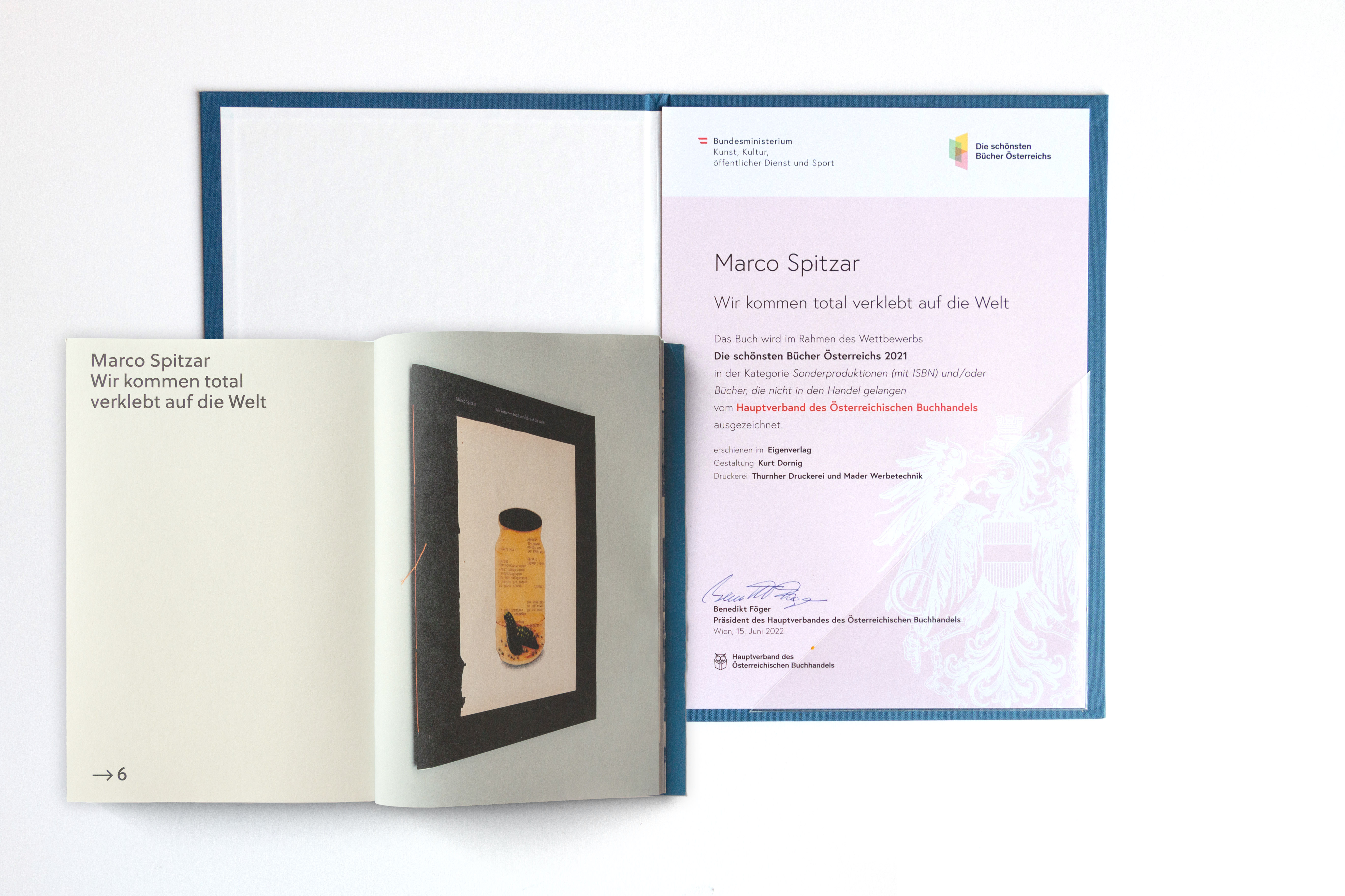 Am 15. Juni 2022 überreichten der Leiter der Kunst- und Kultursektion im Bundesministerium für Kunst, Kultur, öffentlichen Dienst und Sport (BMKÖS) Jürgen Meindl und Benedikt Föger, Präsident des Hauptverbandes des Österreichischen Buchhandels (HVB) die Ehrenurkunden an die Gewinner:innen des Wettbewerbs „Die schönsten Bücher Österreichs 2021“. Die von Kurt Dornig gestaltete Publikation von Marco Spitzar „Wir kommen total verklebt auf die Welt “ wurde zu einem der schönsten Bücher prämiert. Die Verleihung fand im Palais Niederösterreich in Wien statt.