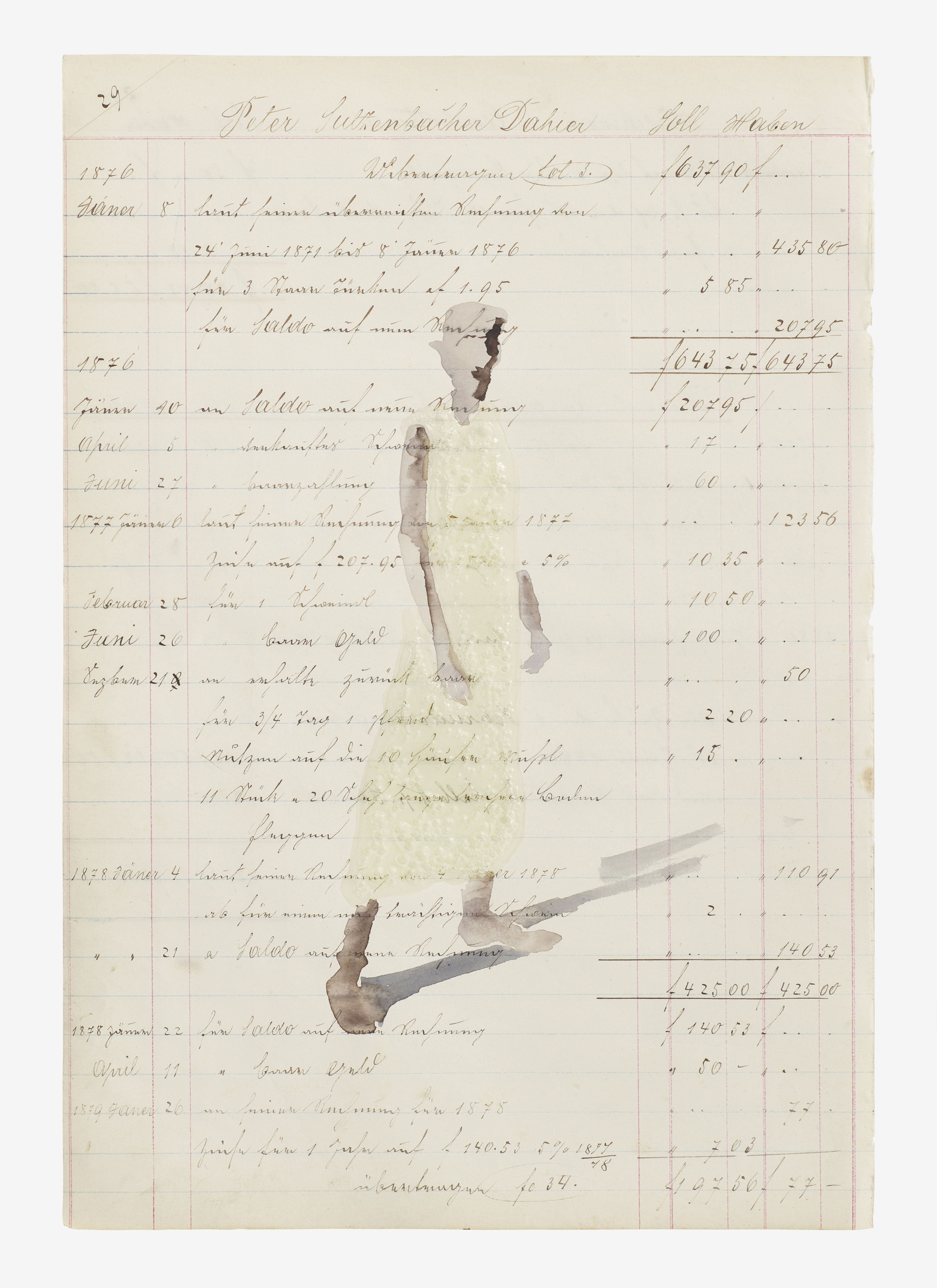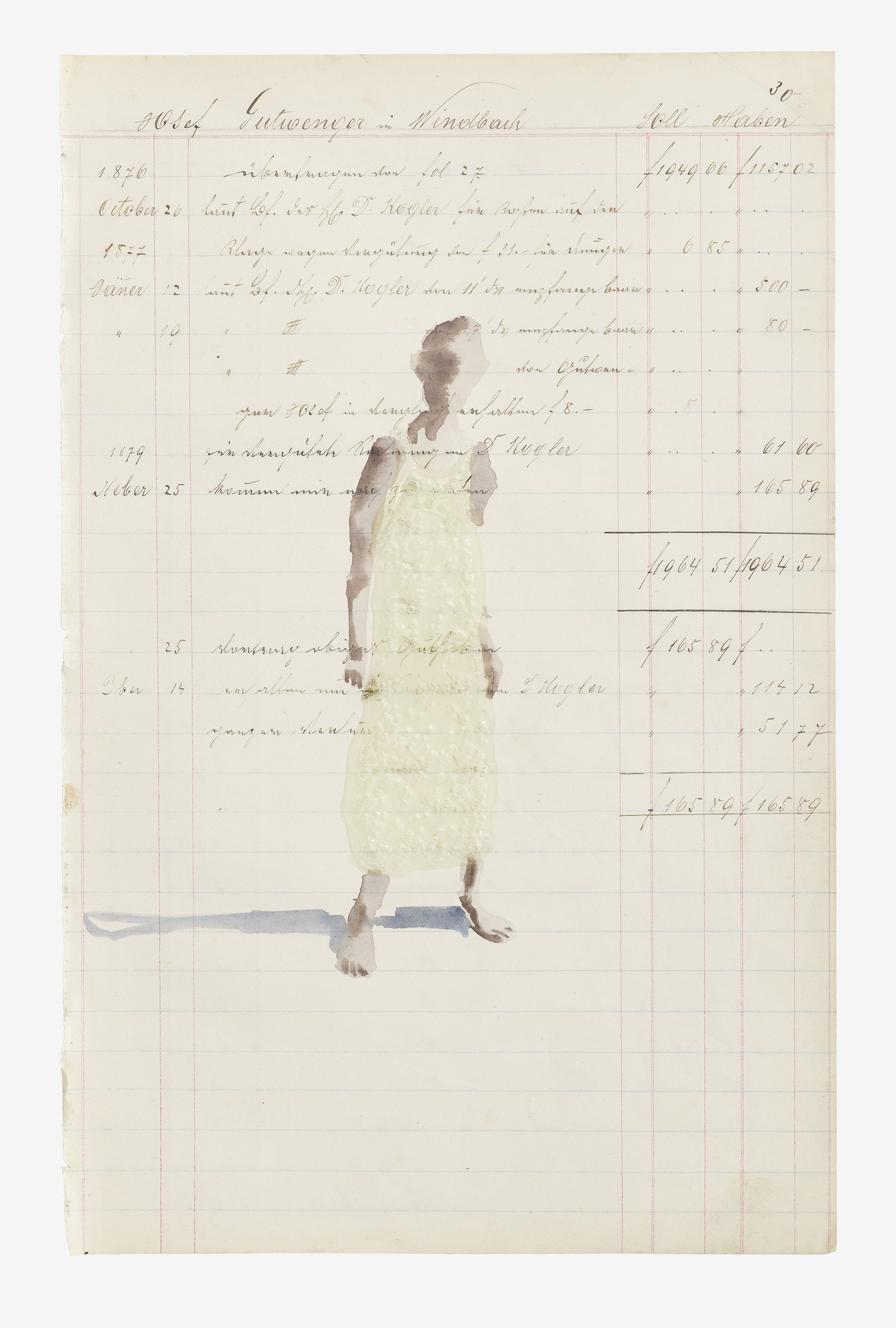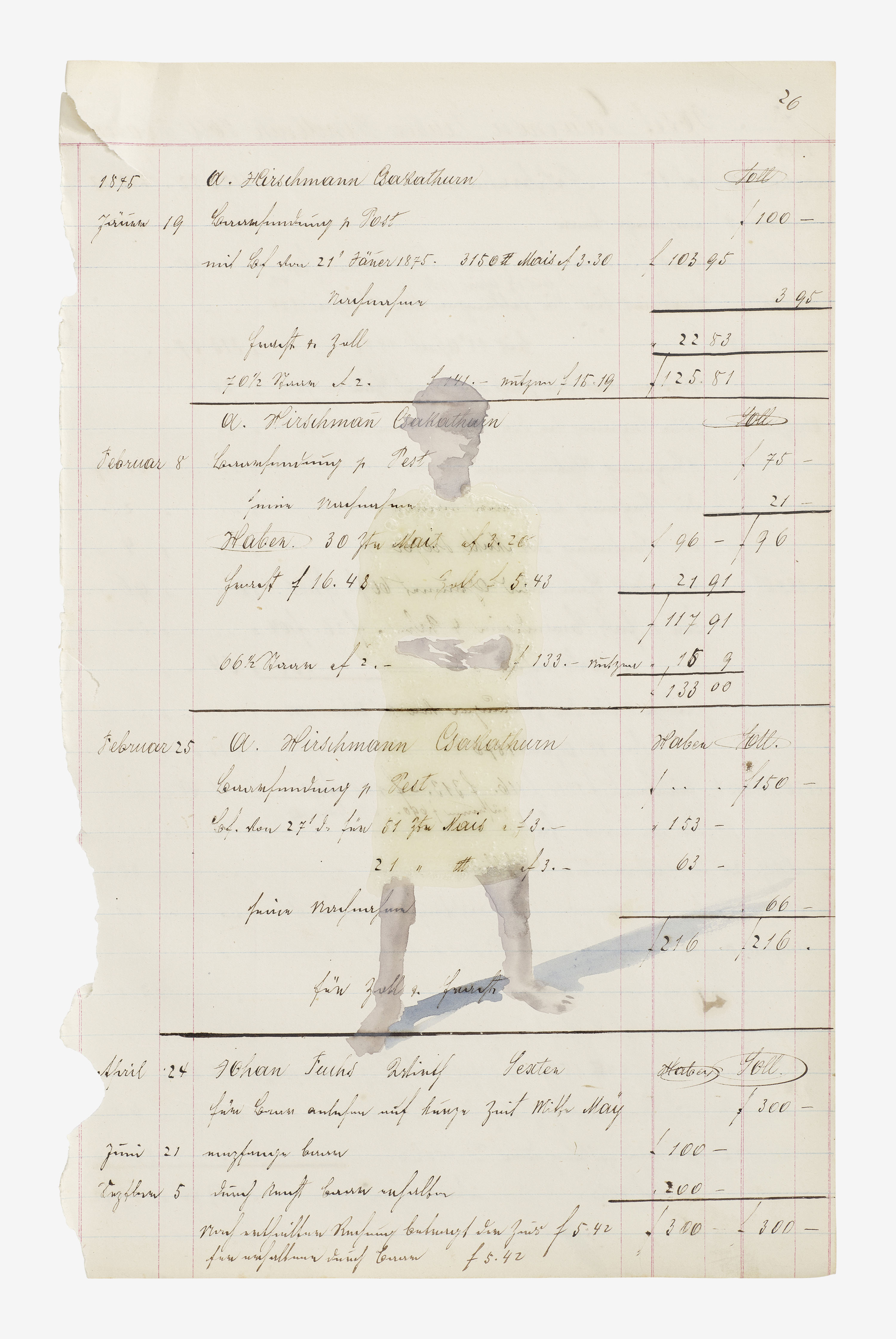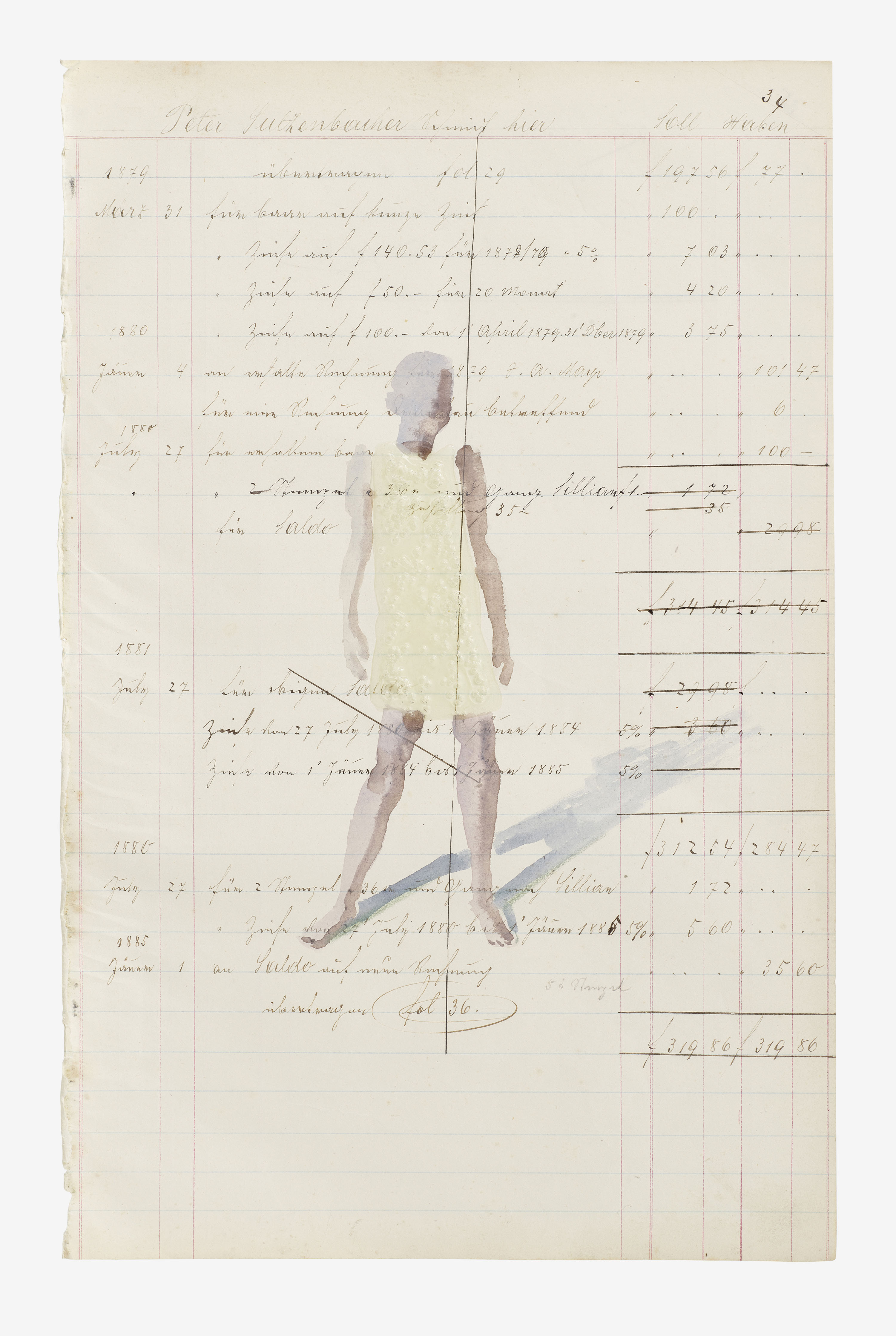 Material: Aquarell und Buntstift mit UHU auf historischem Kontorpapier