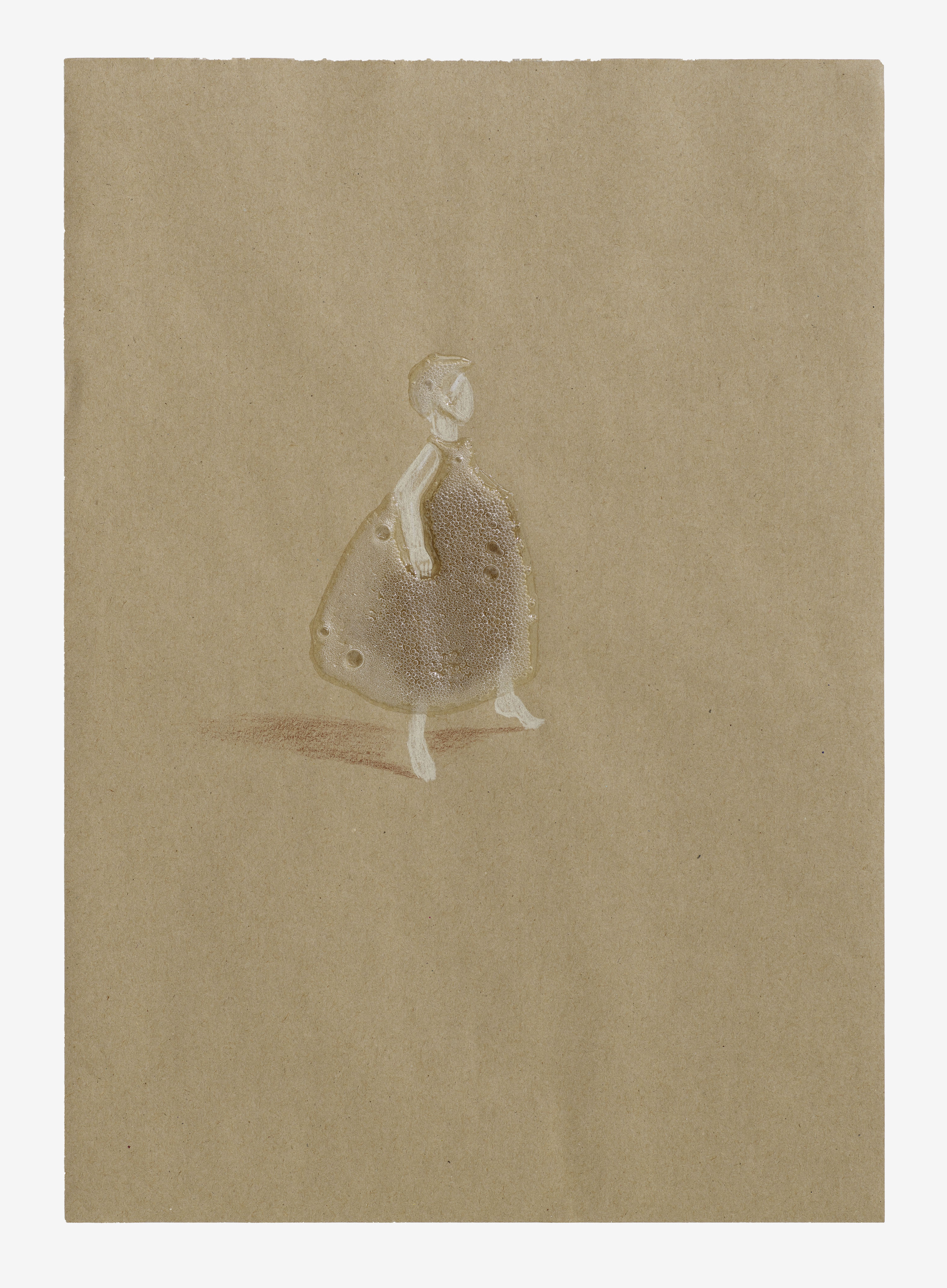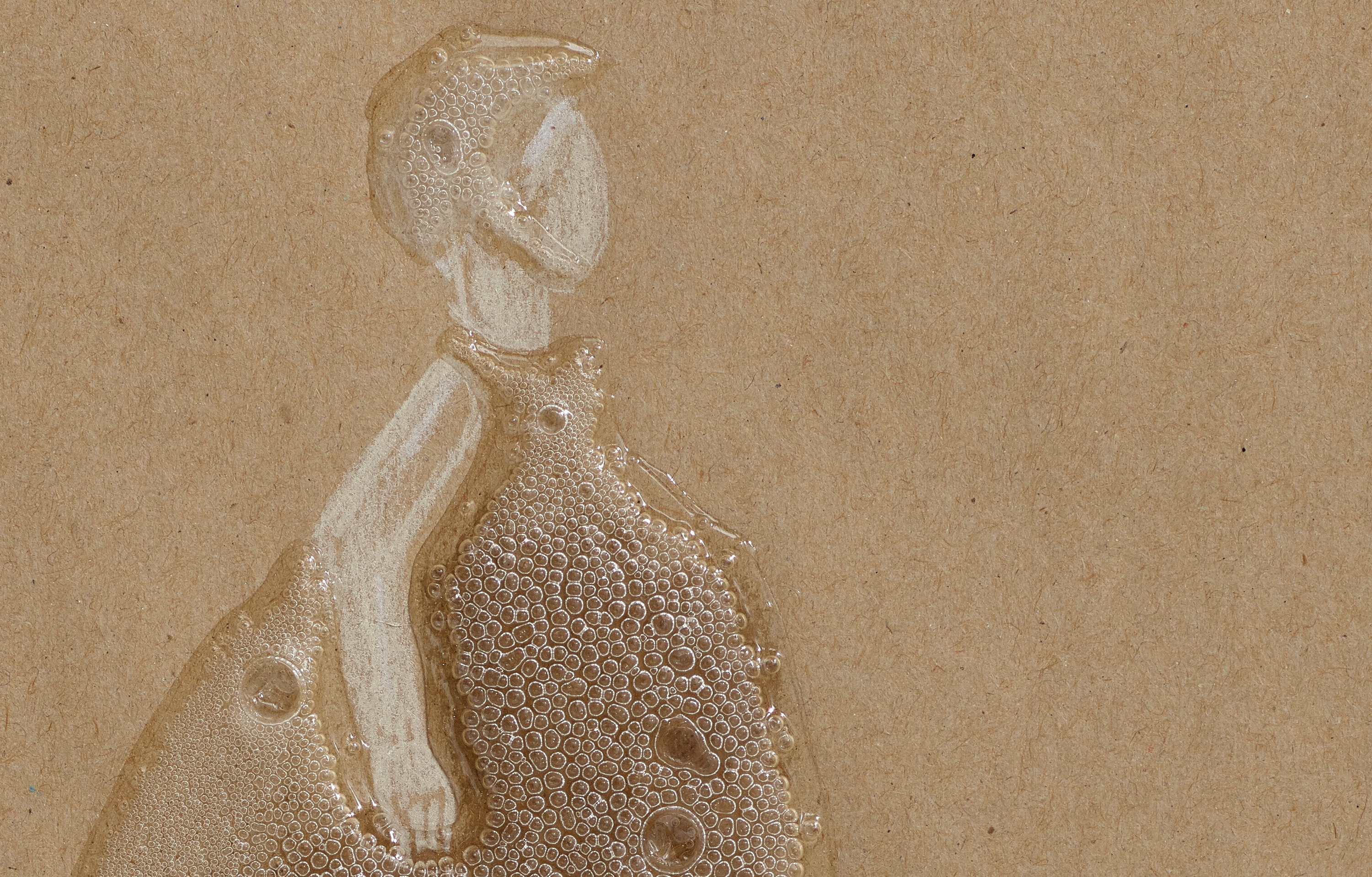 Immer wieder respektiert Marco Spitzar den Klebstoff UHU als etwas belebt Durchscheinendes, beinahe Glasiges. Mit Verunreinigungen vielleicht, mit Luftbläschen – es könnte mundgeblasenes Glas aus Murano sein, aus den Werkstätten der vorgelagerten Inseln Venedigs. Die Körper sind nicht wirklich erkennbar hinter dem Glas und das Durchscheinende ist in Frage gestellt. Die Gliedmaßen hängen an den blubbernden Stoffen. Das Glas wird zum Körper, zur eigenen Gestaltungsgrundlage.