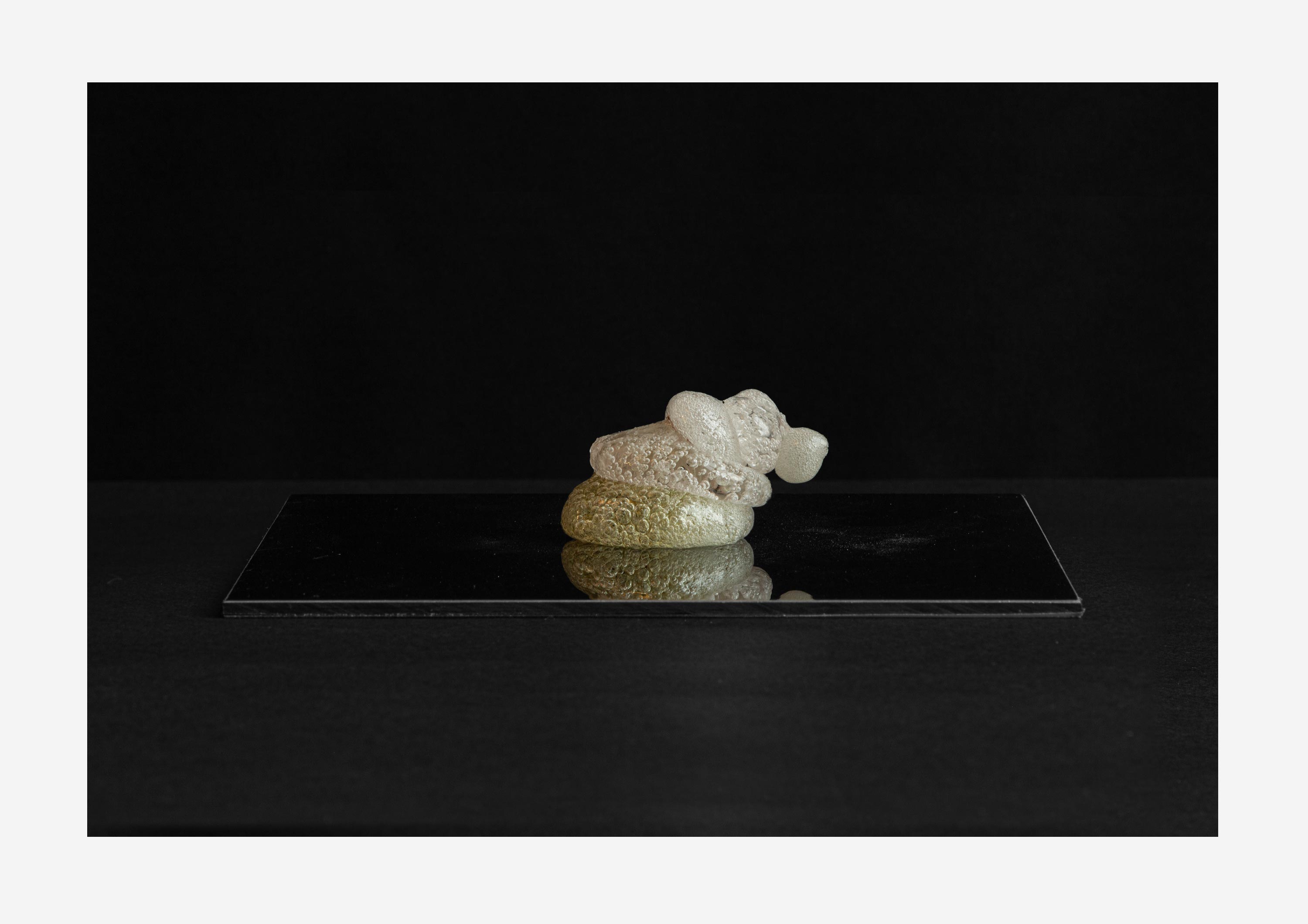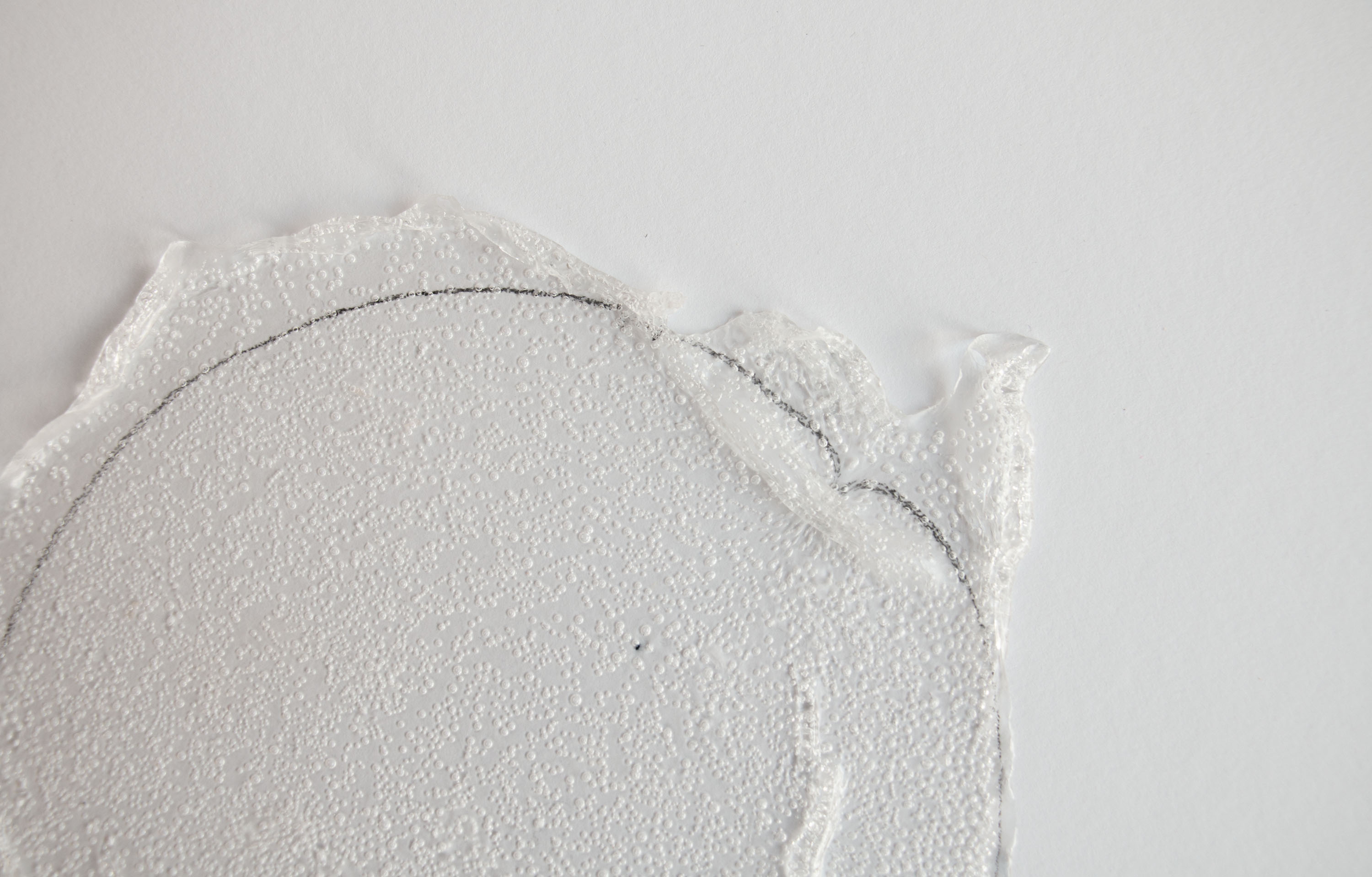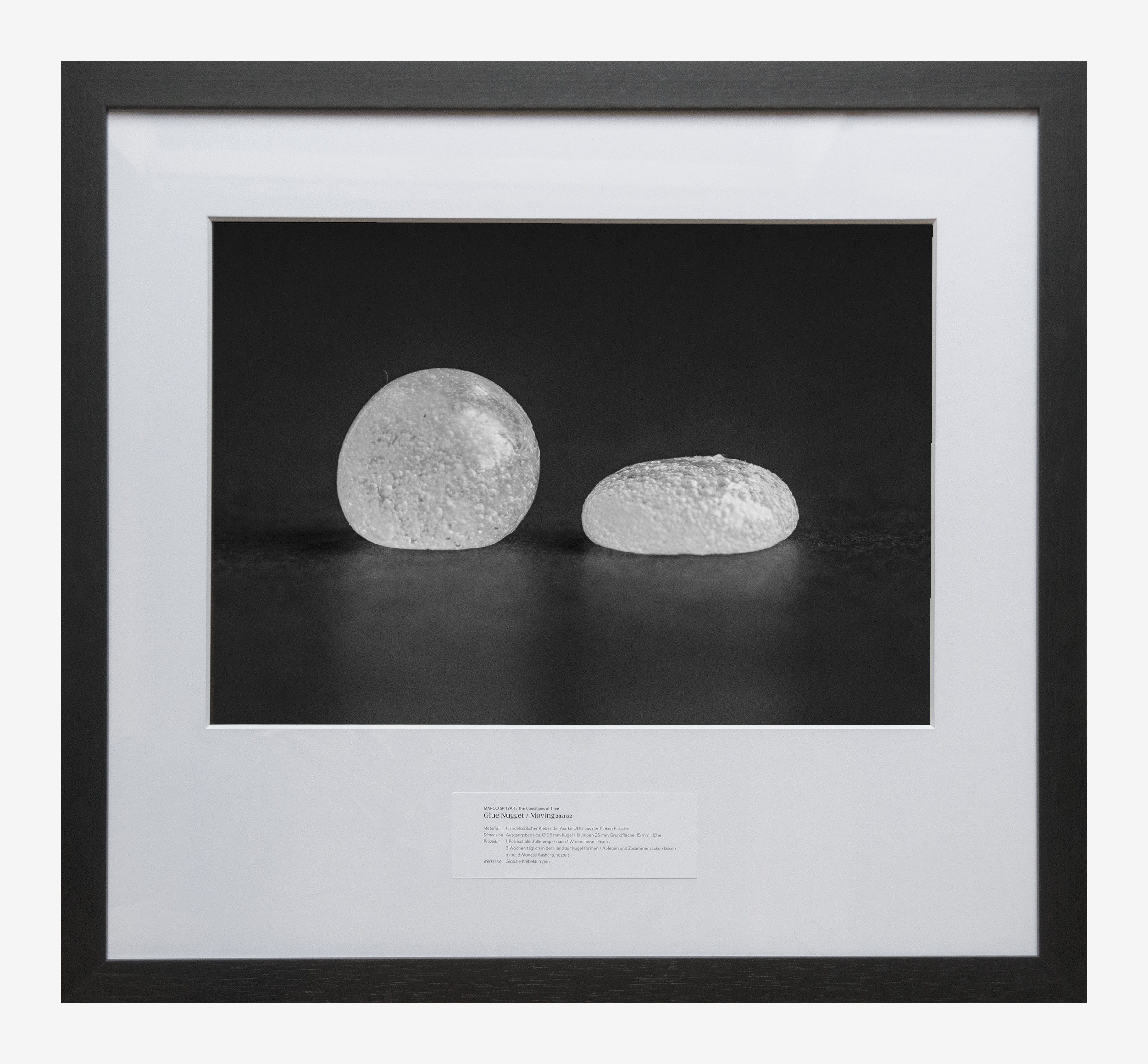 Um zähe Zeit. Zeit ist für Marco Spitzar ein dehnbarer Begriff. Geht er doch für ihn nicht nur linear nach Vorne, in die Zukunft, sondern genauso nach Hinten, in die Vergangenheit. In seiner ganzen Klebezeit ging und geht es ihm nicht nur um die narrativen Erzählungen und Beobachtungen der Klebehandlungen sondern auch ganz bewußt um die Prozesse, die sie in ihm auslösen. Lange Zeit im Hintergrund, im Verborgenen, kann er jetzt die Zugänge und Tiefe seiner Klebekultur in die Länge und Breite ziehen. Es dauert oft Tage und Wochen bis sich Klebeklumpen wie Teig kneten und verformen lassen, um sich dann nach dem Ablegen doch wieder in einen Klumpen, der Erdanziehungskraft geschuldet, auszudehnen – zurückentwickeln, rückwärts gehen würde Marco Spitzar sagen. Es ist faszinierend mit Geduld und Ausdauer den Prozessen beizuwohnen und daraus Erkenntnisse zu ziehen, die einem einseitigen Fortschrittsglauben widersprechen.