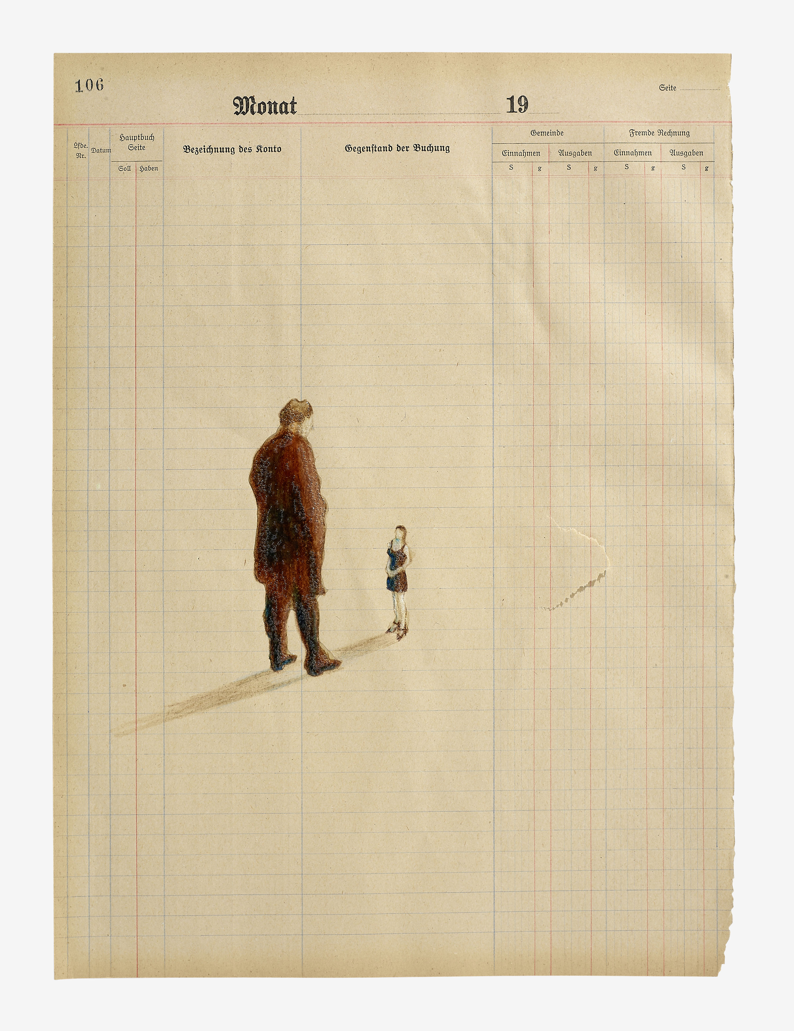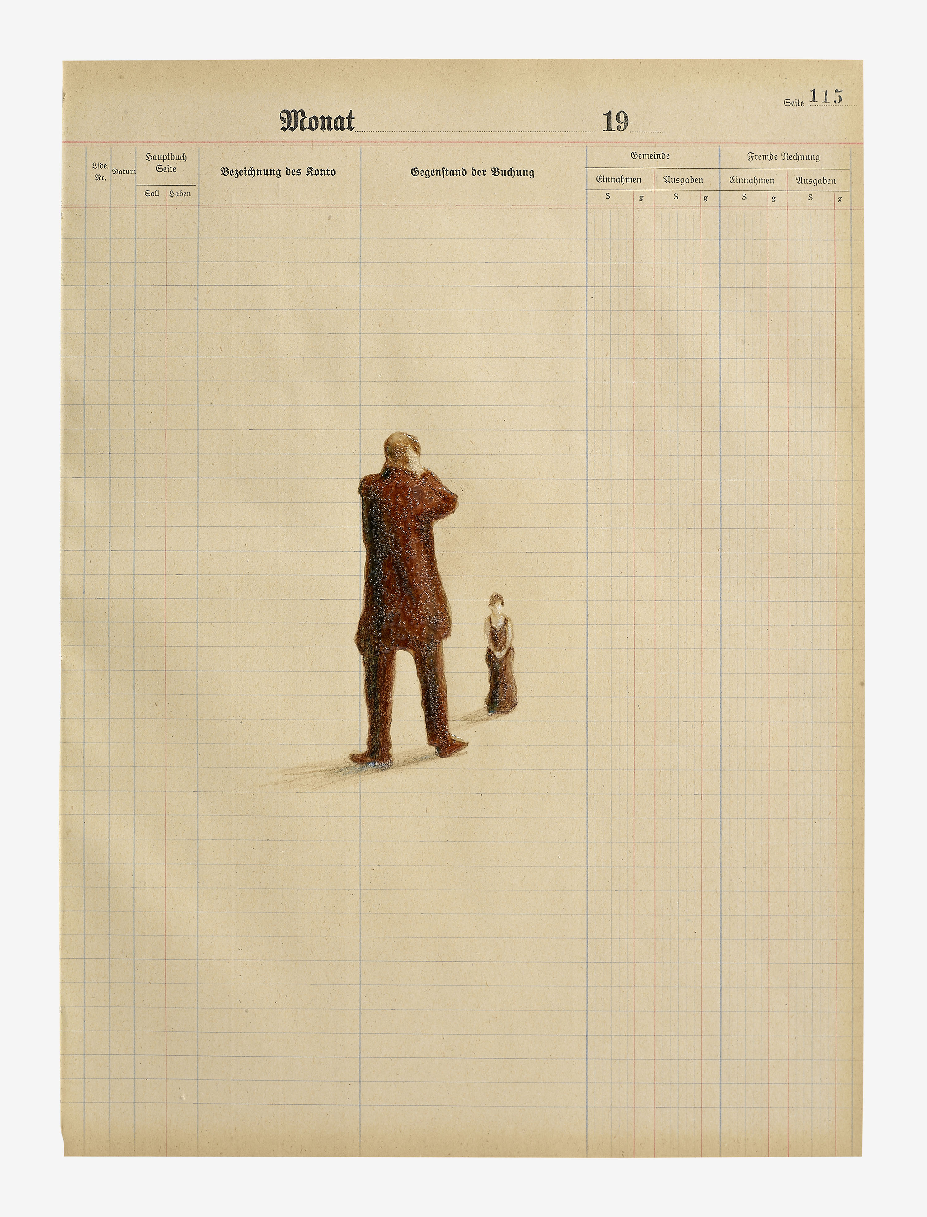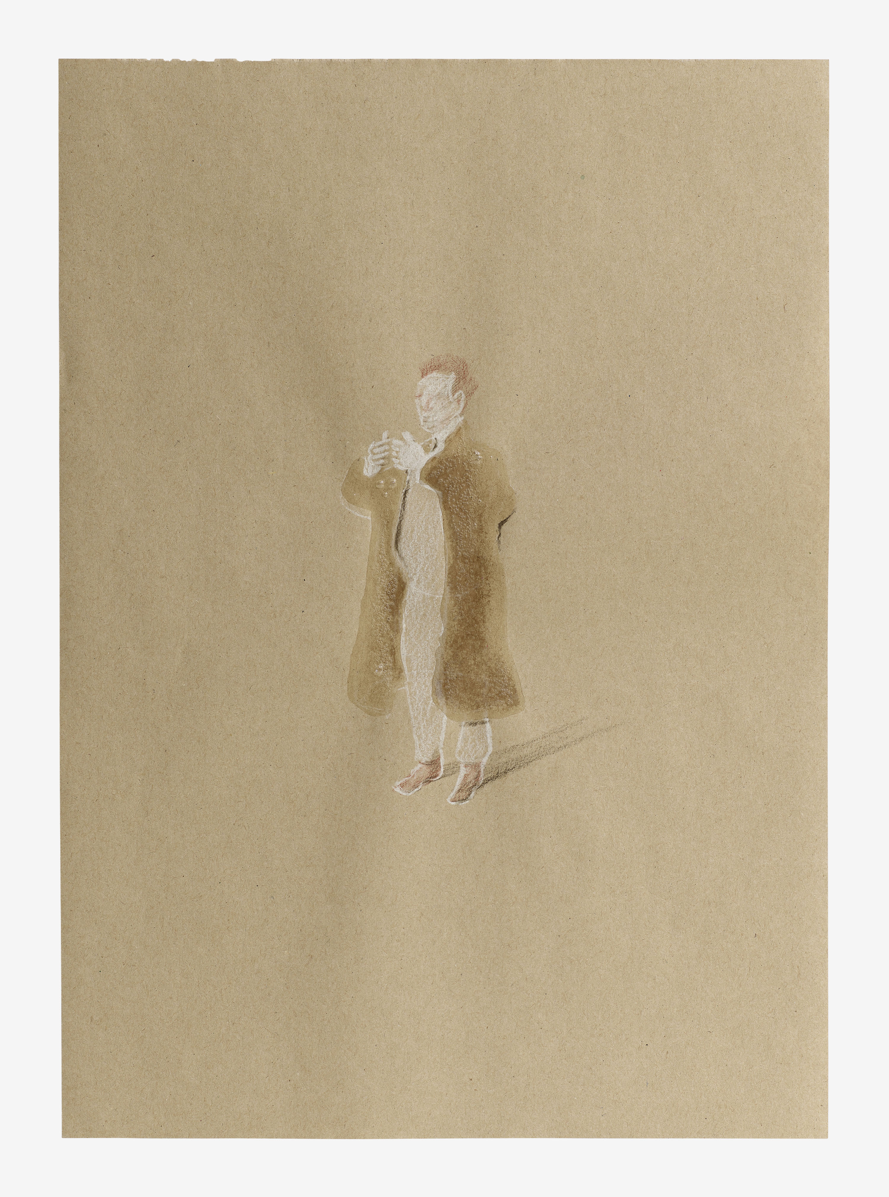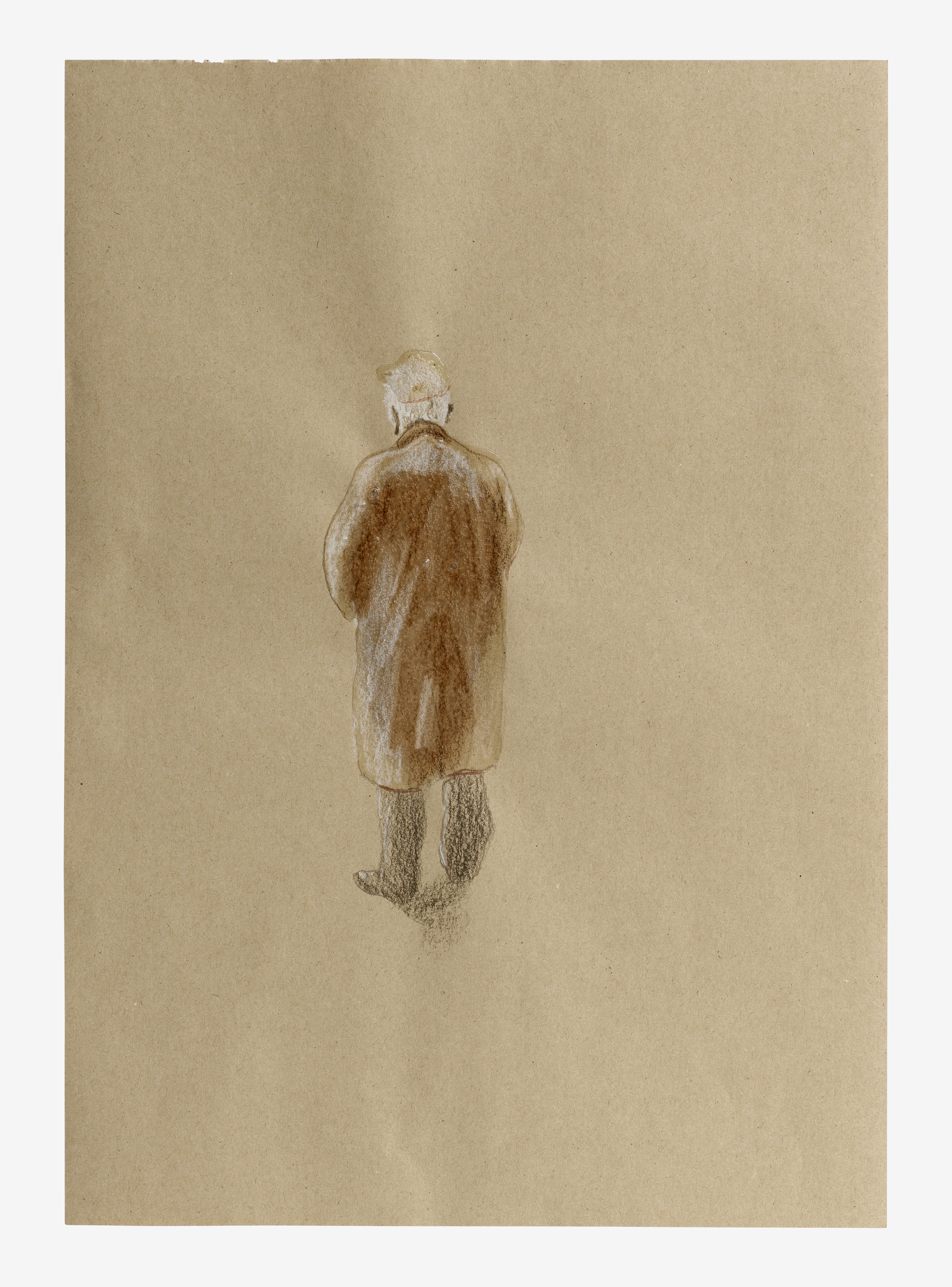 Die Mantelmänner sind ein wichtiges Motiv aus dem braunen Buch „Eine Frage der Größe“, das die erste Ausstellung nach sehr langer Abstinenz von der Öffentlichkeit und vom Kunstmarkt Marco Spitzars, begleitet hat. Eine Frage der Größe bedeutet nicht nur die physische, äußerliche Größe sondern auch die charakterliche Qualität. Proportionen räumlich physisch wie auch seelisch innerlich zu betrachten ist ein durchgehendes Prinzip der Arbeitsweise von Marco Spitzar. Die ersten Werkserien aus der Frage der Größe waren sofort vergriffen, tauchen aber immer wieder als kollektives Bild in den Arbeiten auf. Die Liebe zu historischem Papiermaterial wie alten Kontorbüchern sowie zum bernsteinähnlichen Bunstift-UHU-Gemisch sind nach wie vor ein fixer Bestandteil der fortlaufenden künstlerischen Beschäftigung.