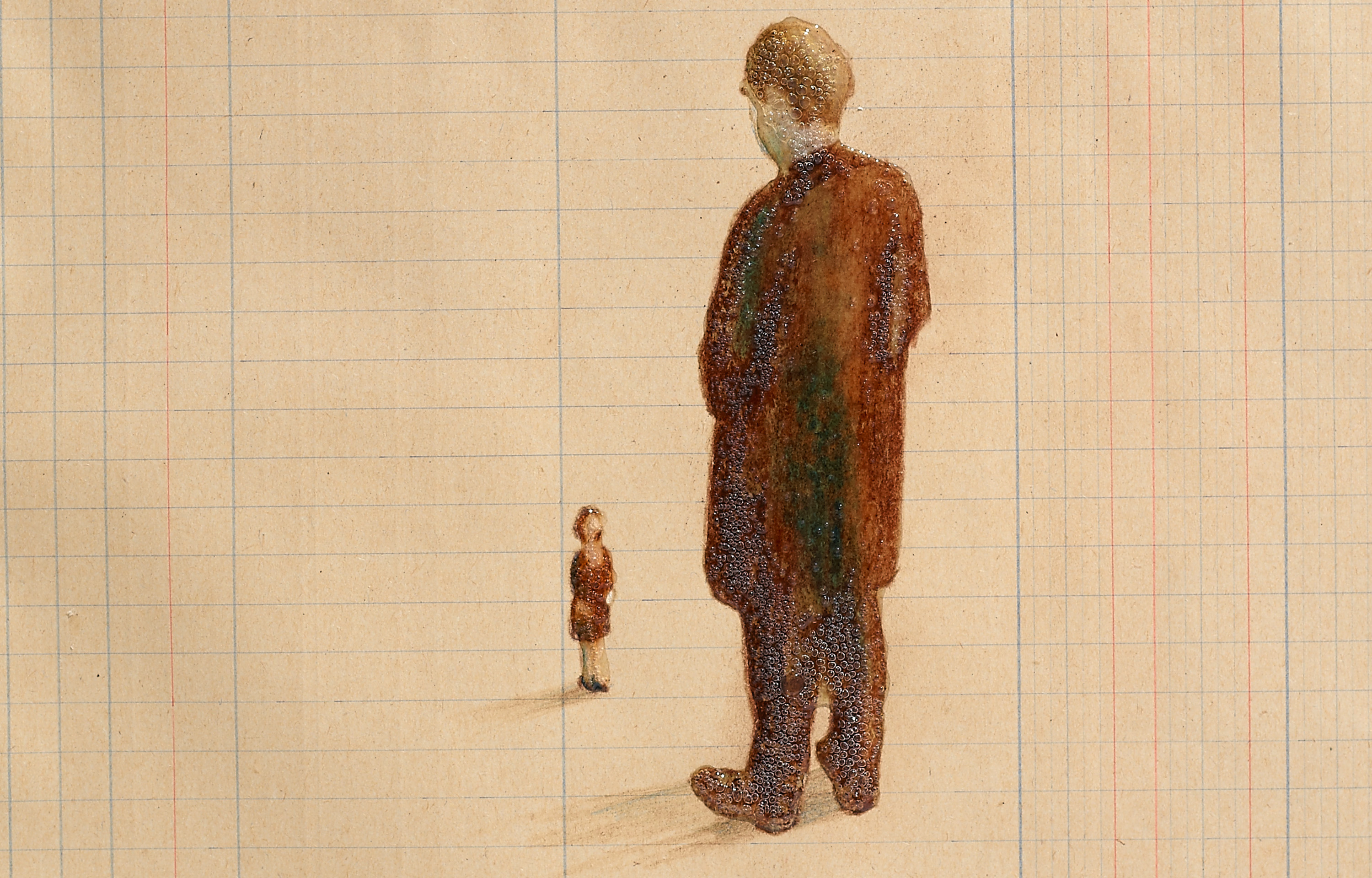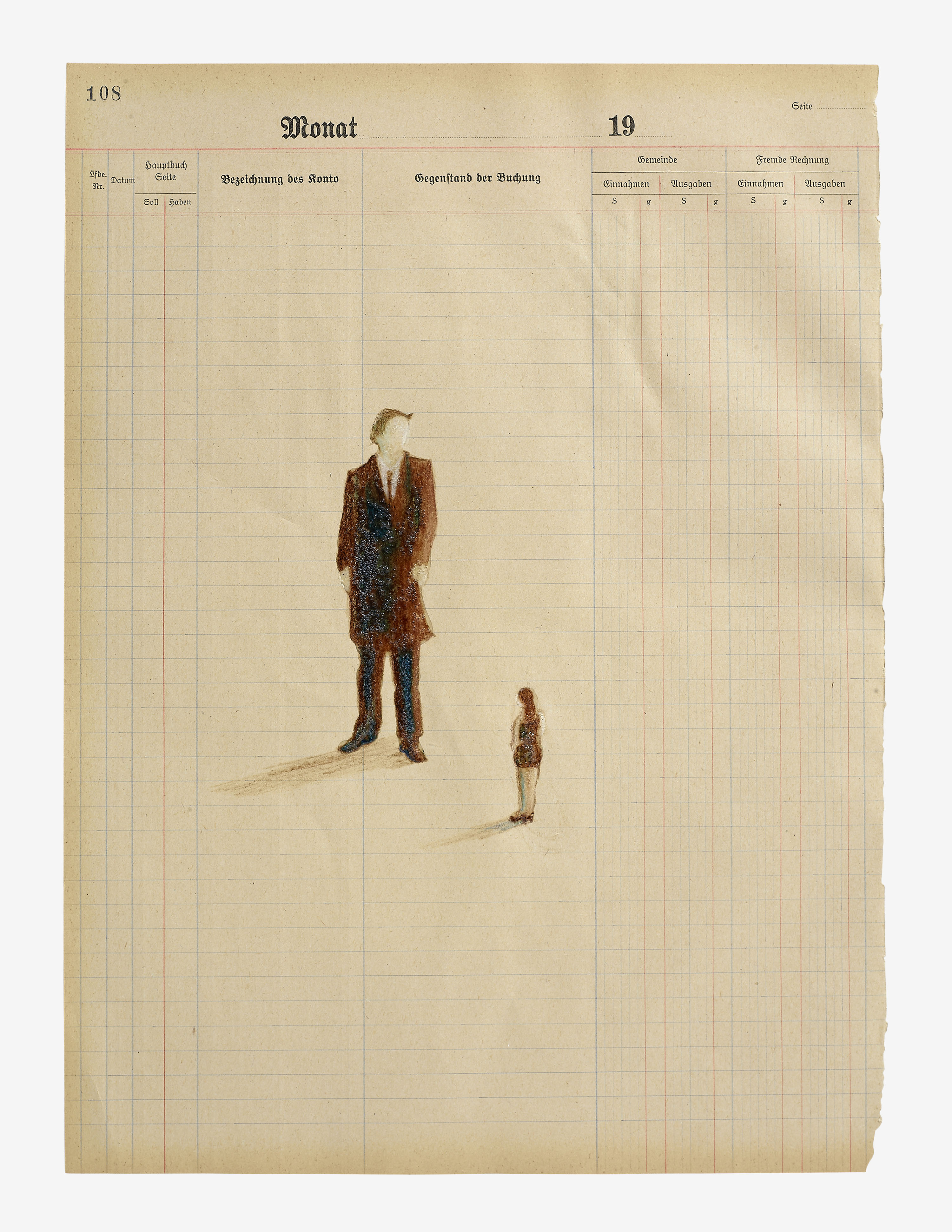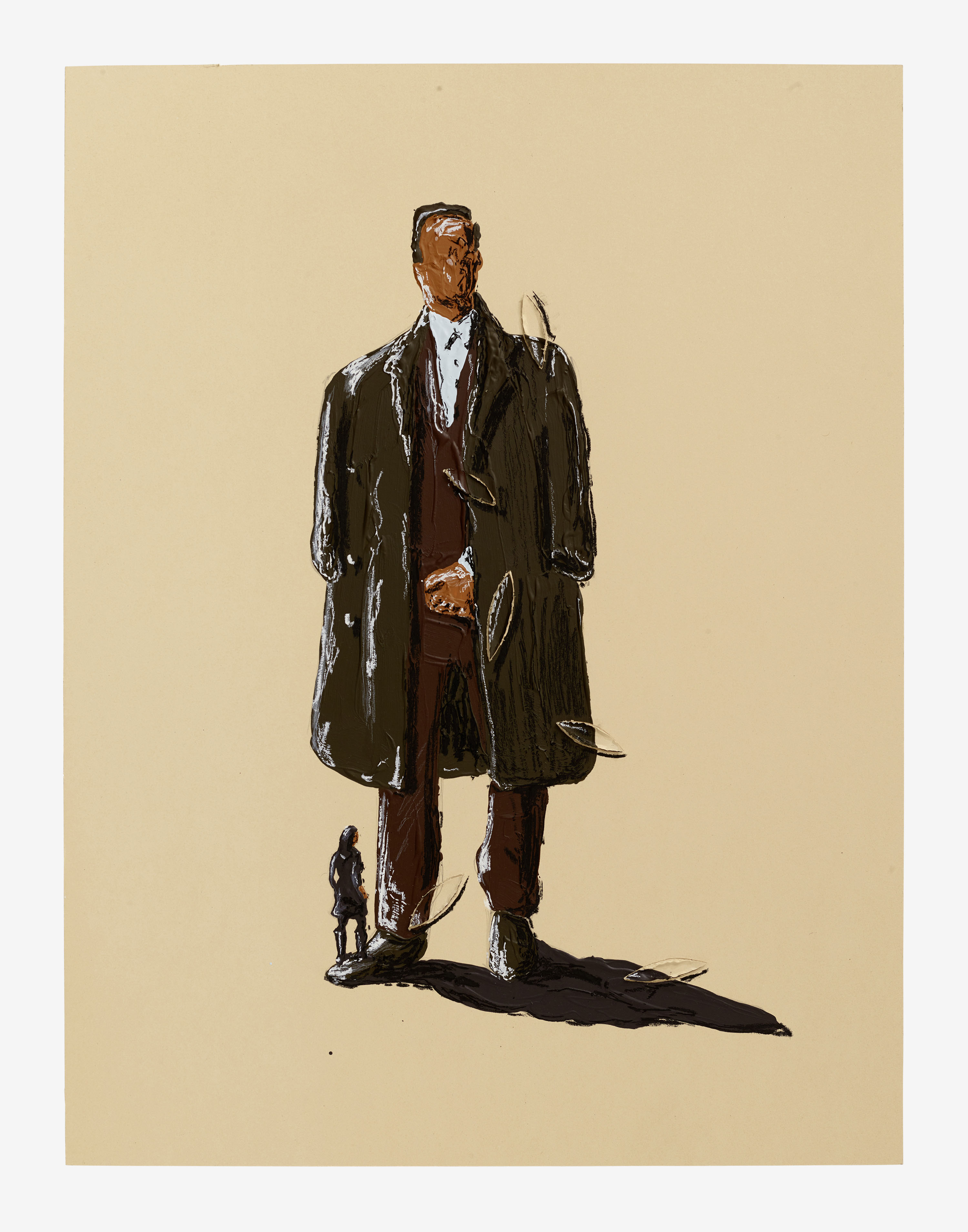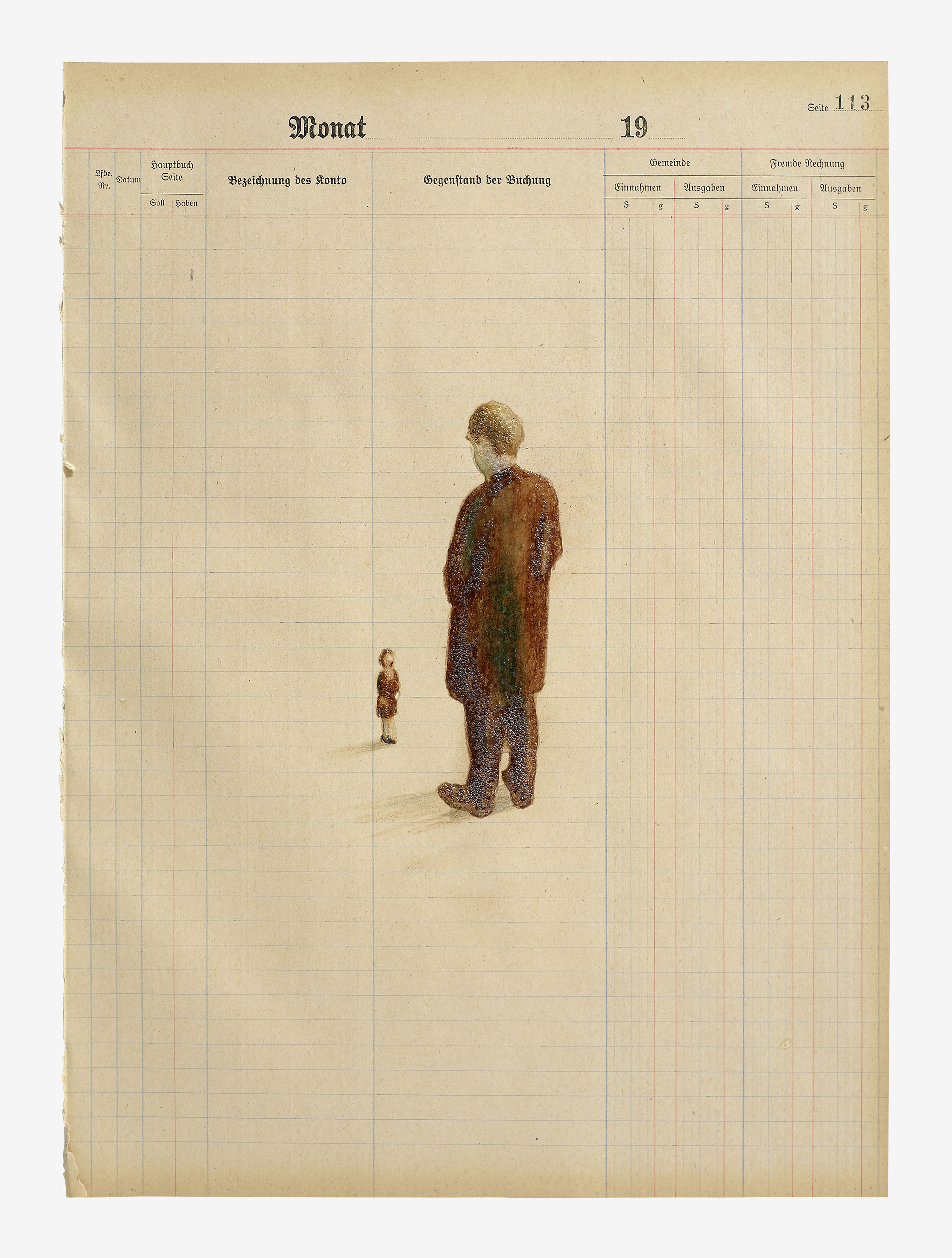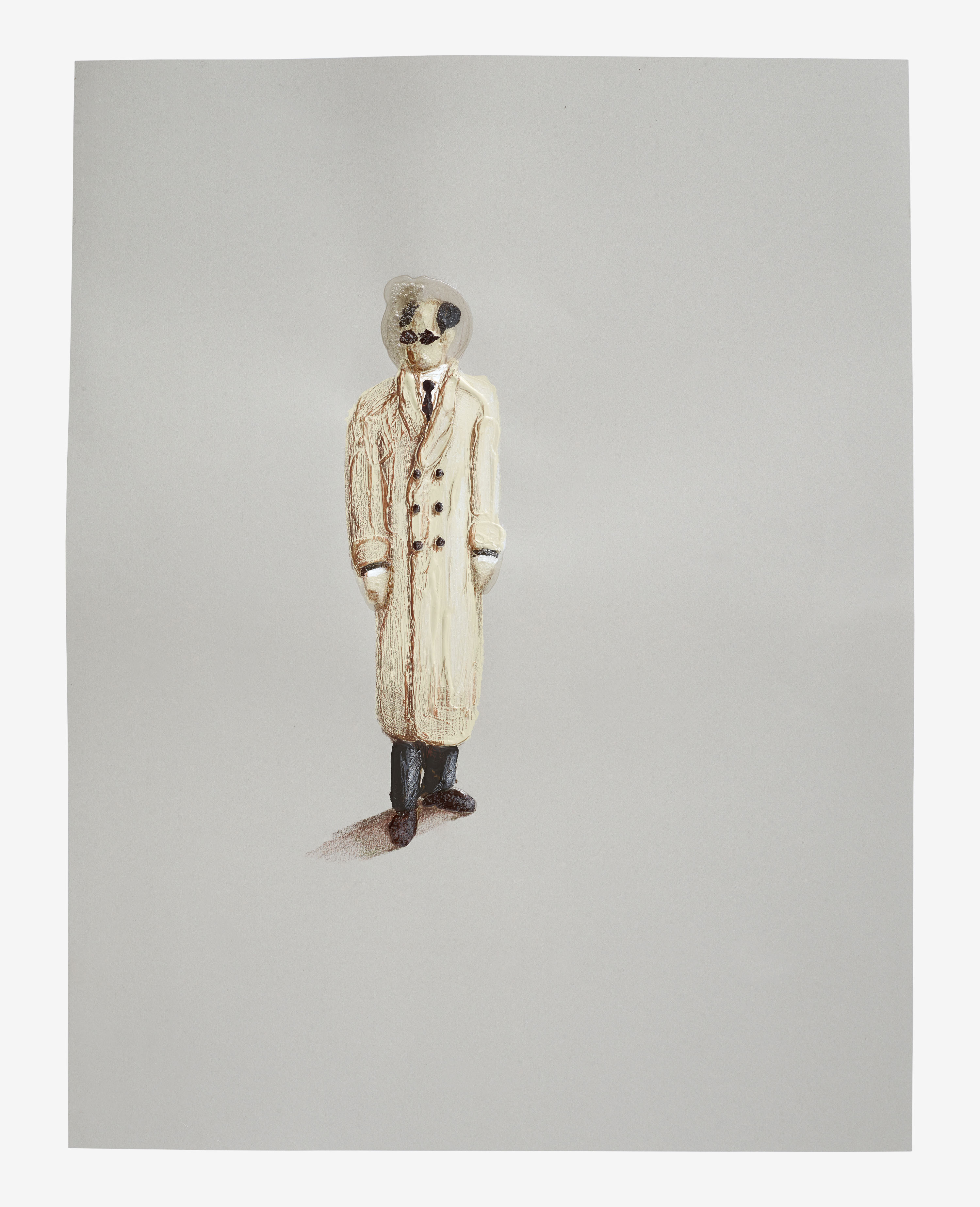 Die Mantelmänner sind ein wichtiges Motiv aus dem braunen Buch „Eine Frage der Größe“, das die erste Ausstellung nach sehr langer Abstinenz von der Öffentlichkeit und vom Kunstmarkt Marco Spitzars, begleitet hat. Eine Frage der Größe bedeutet nicht nur die physische, äußerliche Größe sondern auch die charakterliche Qualität. Proportionen räumlich physisch wie auch seelisch innerlich zu betrachten ist ein durchgehendes Prinzip der Arbeitsweise von Marco Spitzar. Die ersten Werkserien aus der Frage der Größe waren sofort vergriffen, tauchen aber immer wieder als kollektives Bild in den Arbeiten auf. Die Liebe zu historischem Papiermaterial wie alten Kontorbüchern sowie zum bernsteinähnlichen Bunstift-UHU-Gemisch sind nach wie vor ein fixer Bestandteil der fortlaufenden künstlerischen Beschäftigung.