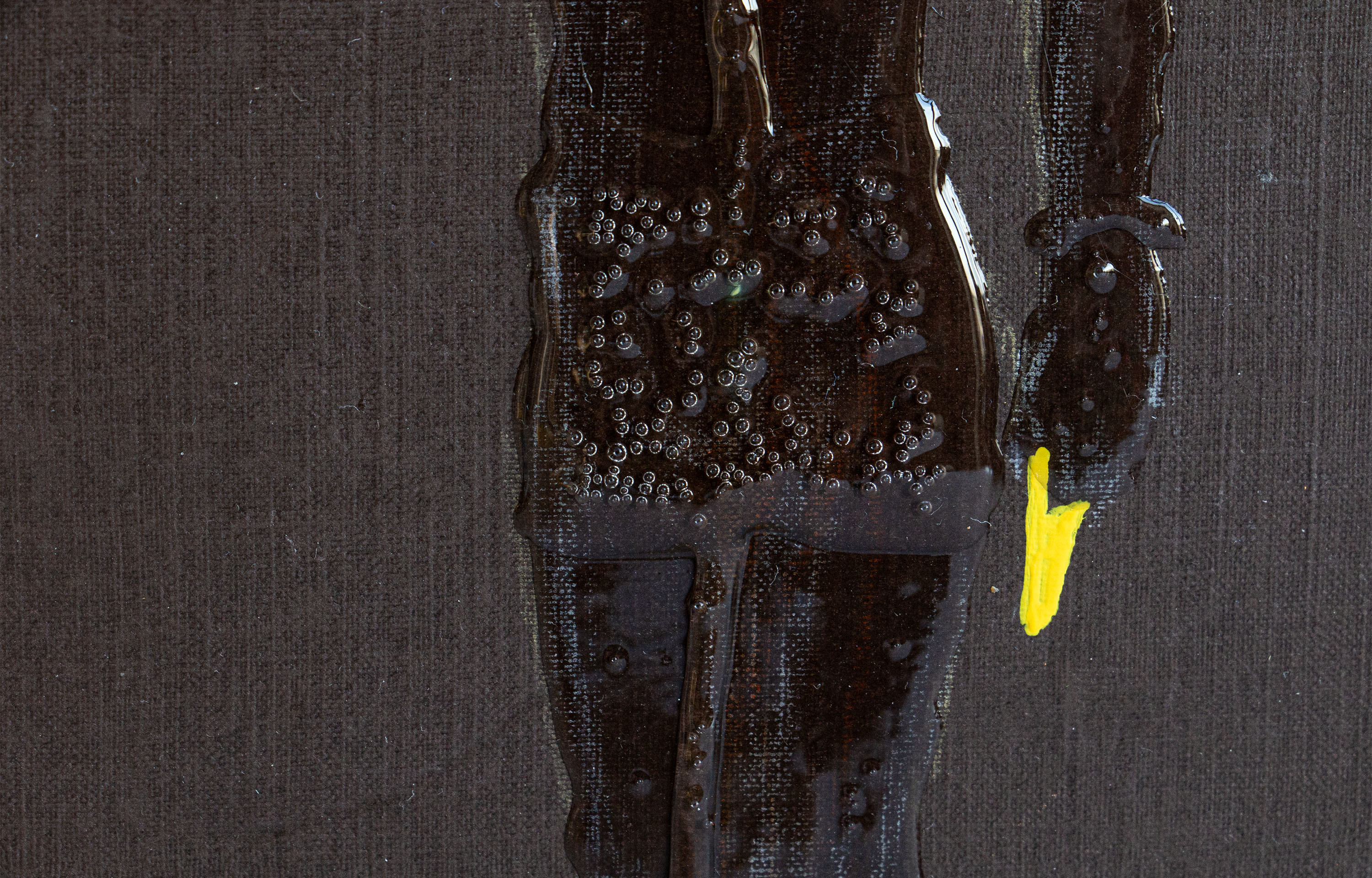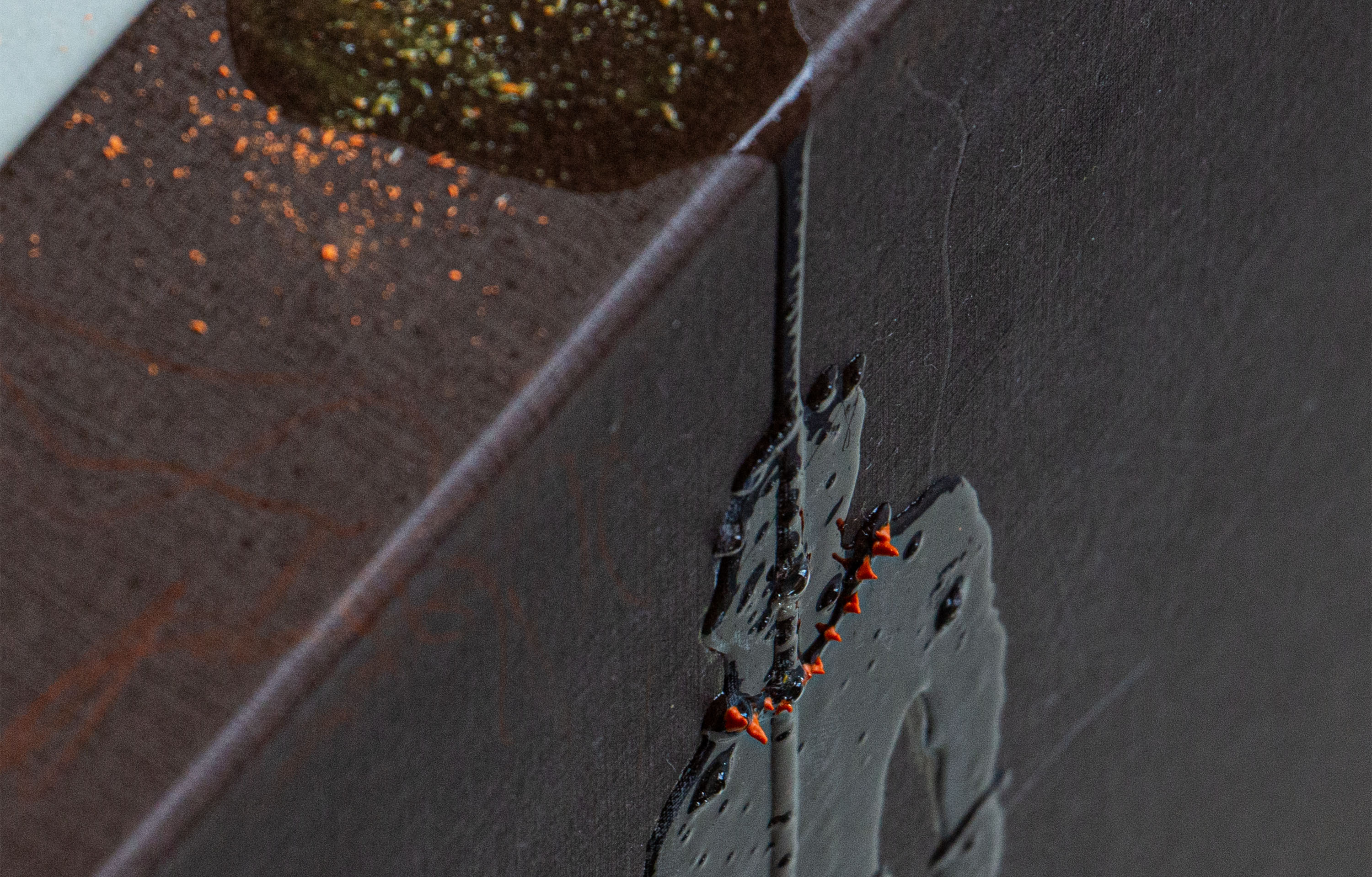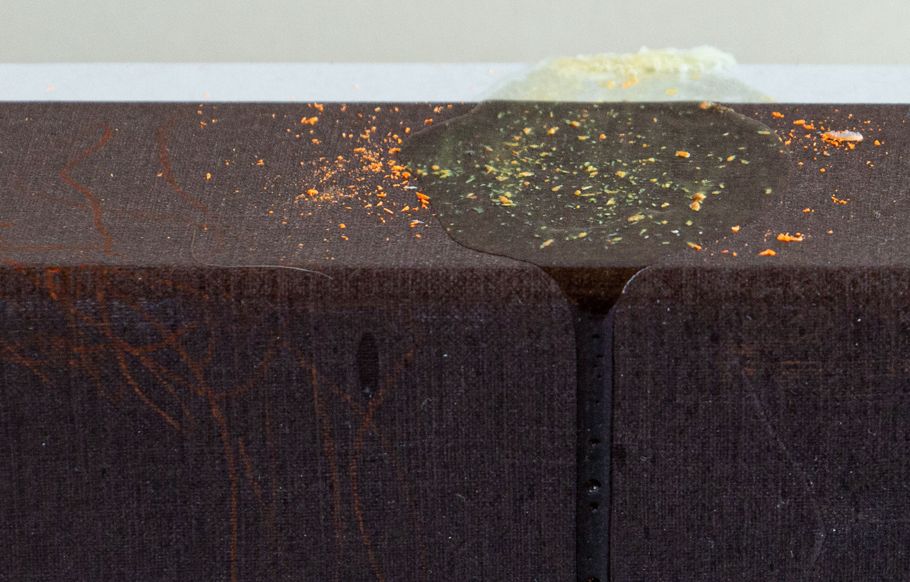 Festkleben, Steckenbleiben oder das Kleben als Fest. Wieso nicht das Liebste, das man macht, als exklusiv, als Fest betrachten, das Zelebrieren mit feiner Kleidung unterstreichen. Marco Spitzar passiert es oft in seinen wertvollsten Sakkos im Atelier zu sein und mit Kleber zu kleckern. Ein Selbstverständnis, das in Konzentration mündet. Er hat sich schon lange davon verabschiedet mit drittklassigen Fussballspielern mitzuhalten und den LV Monogram- Stücken hinterher zu jagen. Aber es hat eine Zeit gegeben, da wollte er dabei sein, zumindest mit kleinen Accessoires. Die Schachteln aus dieser Zeit fokussieren ohne viel Aufwand, die Gegensätze mit denen wir leben. Das dunkelbraune, das elegante Verkleben, mit den Leiden und Verstimmungen unseres Lebens. Mode ist mehr als Begehren und Spiegel, sie ist so präsent, dass sie alle Herausforderungen unserer Zeit mit einbezieht, ob sie will oder nicht.