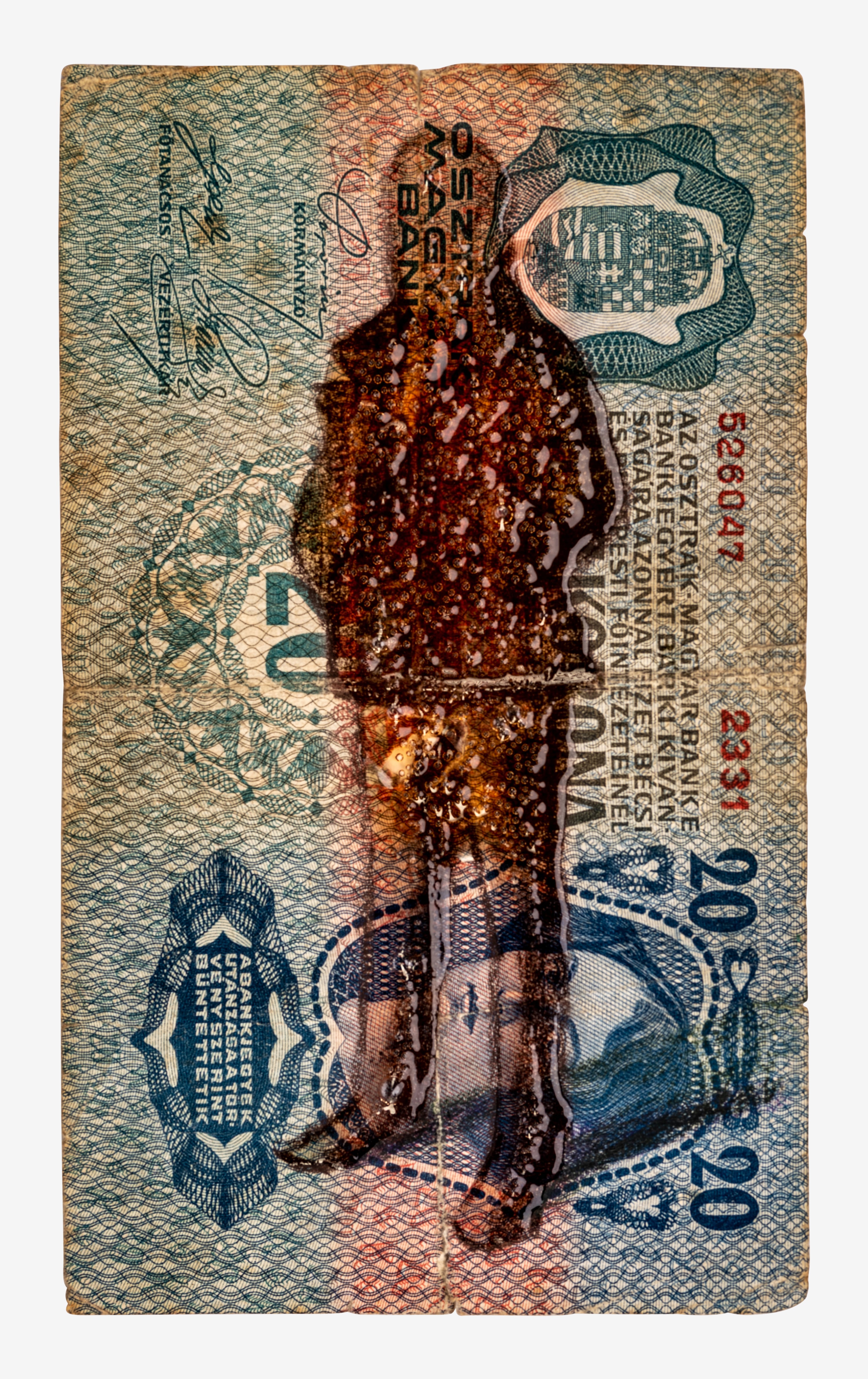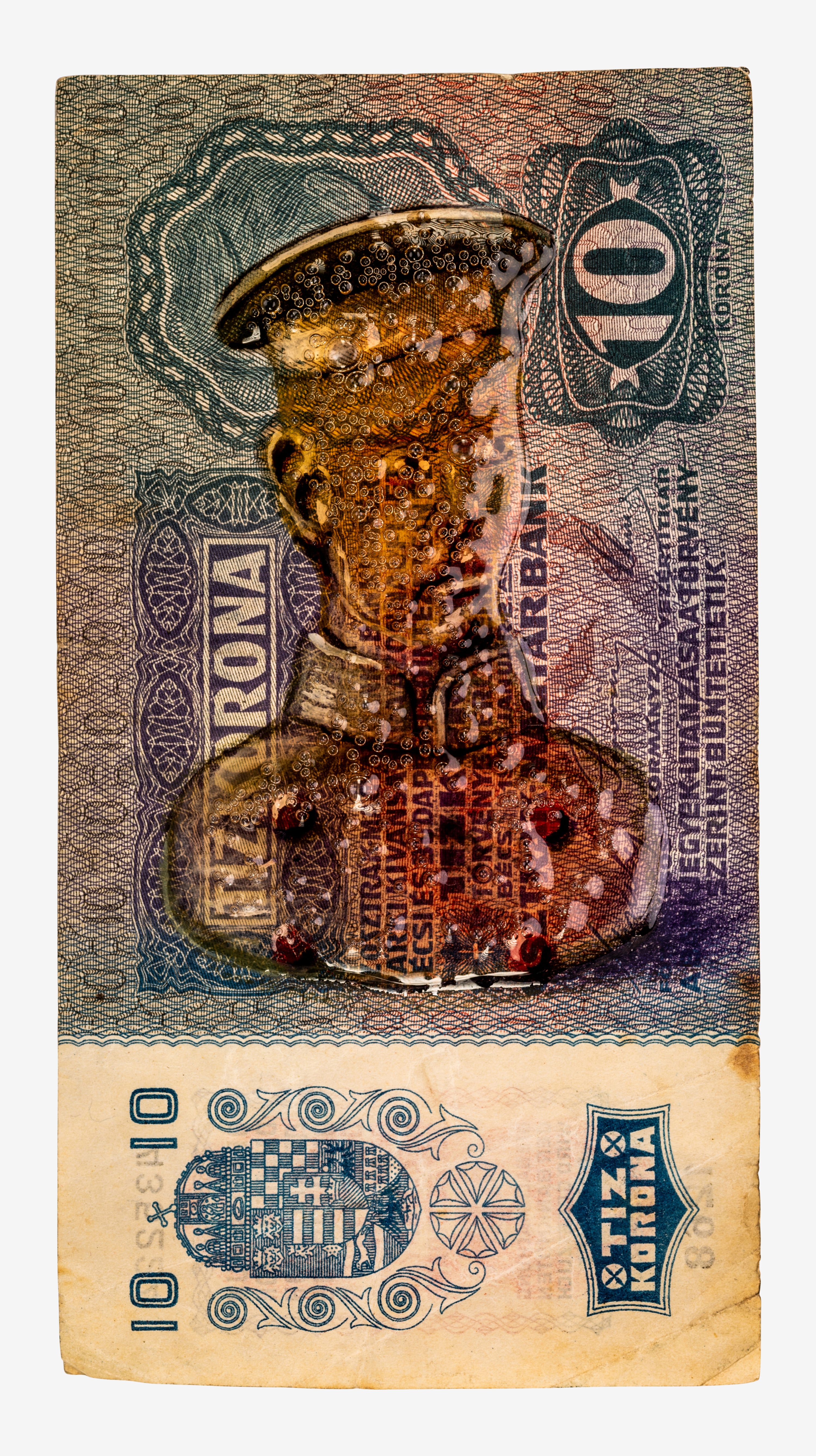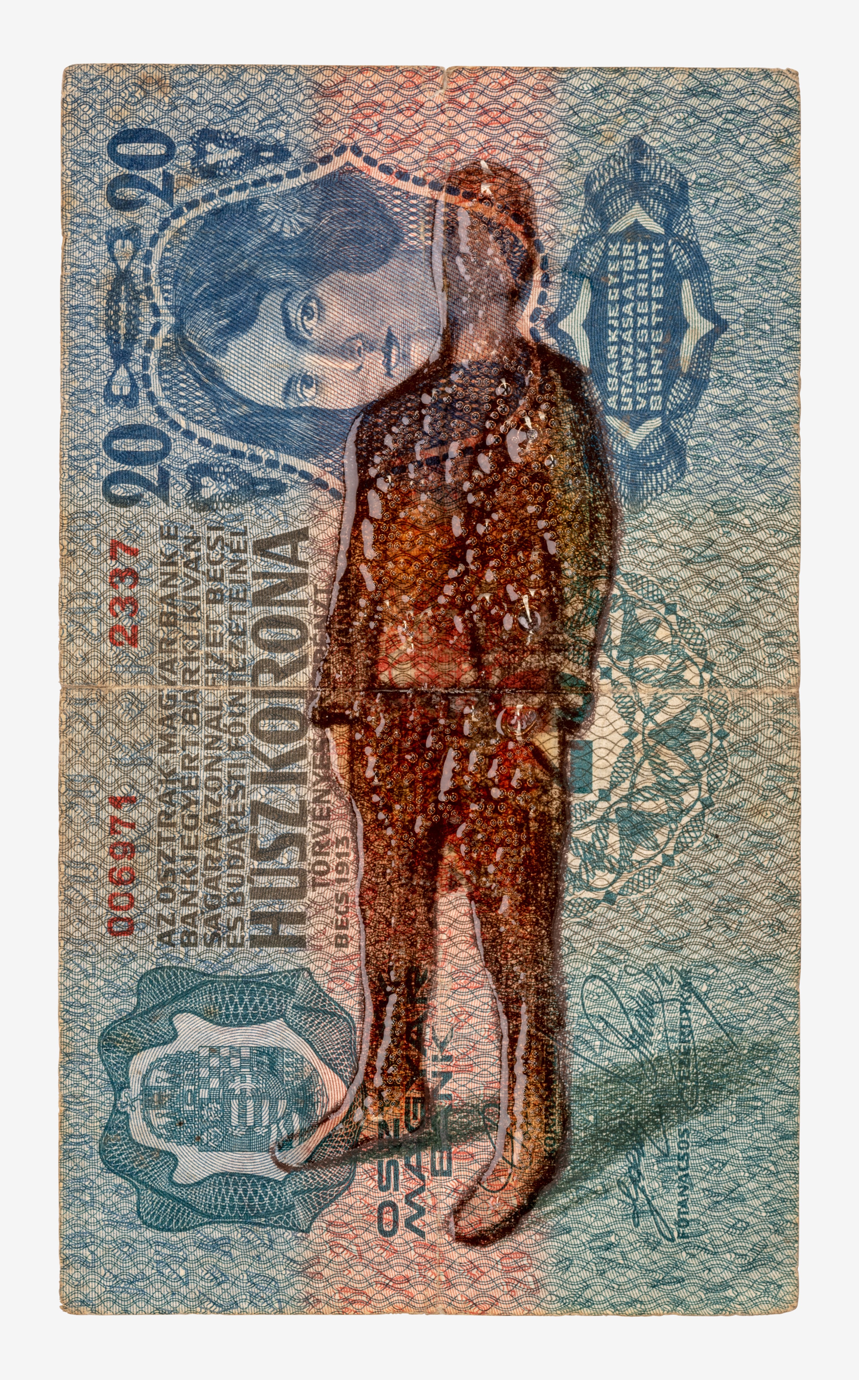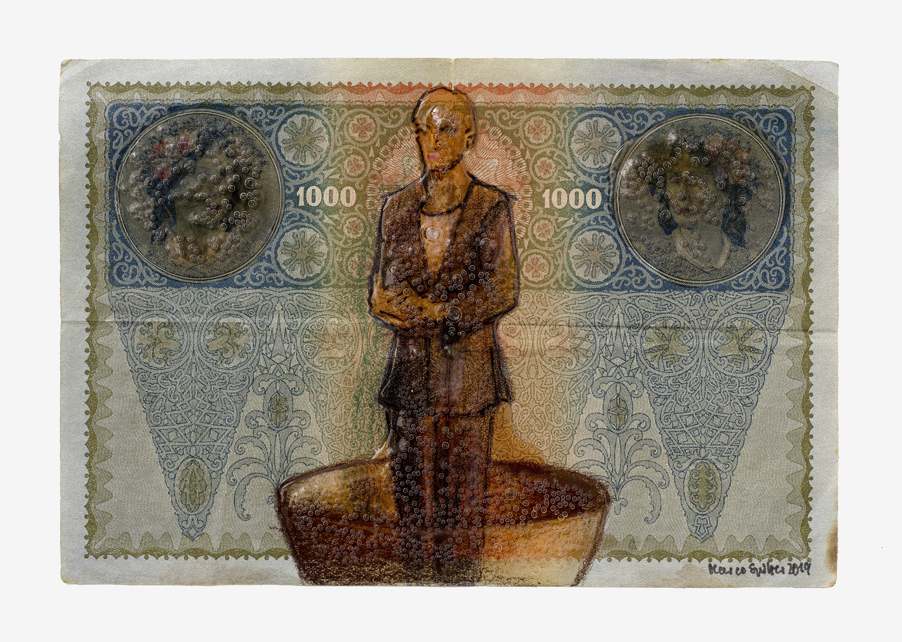 Trägermaterialen dieser Serie sind historische 10- und 20-Kronenscheine, auf die Marco Spitzar Figuren mit Bunststift zeichnet und diese mit flüssigem Uhu nachbearbeitet. Die Banknoten spielen dabei auf die UHU-Zeichnungen aus der Serie „Braunes Buch – eine Frage der Größe“ an. Ging es in dieser Serie schon um die Qualität und die Beschaffenheit alten Papiers, so ist jetzt die Verschmelzung der Ausgestaltung des Hintergrunds mit der klebrigen Verdichtung des UHU-Buntstift-Gemisches noch intensiver spür- und erlebbar.