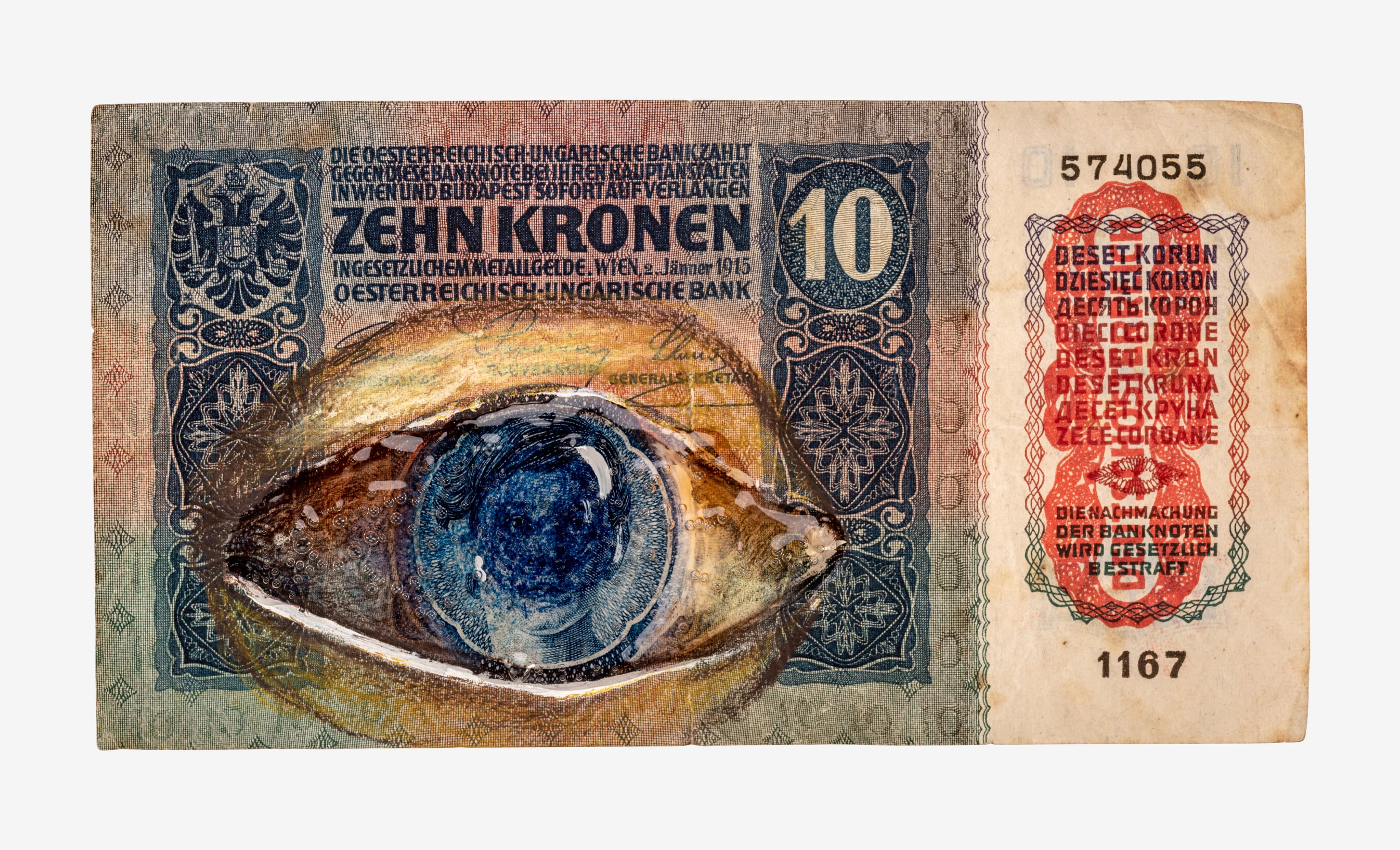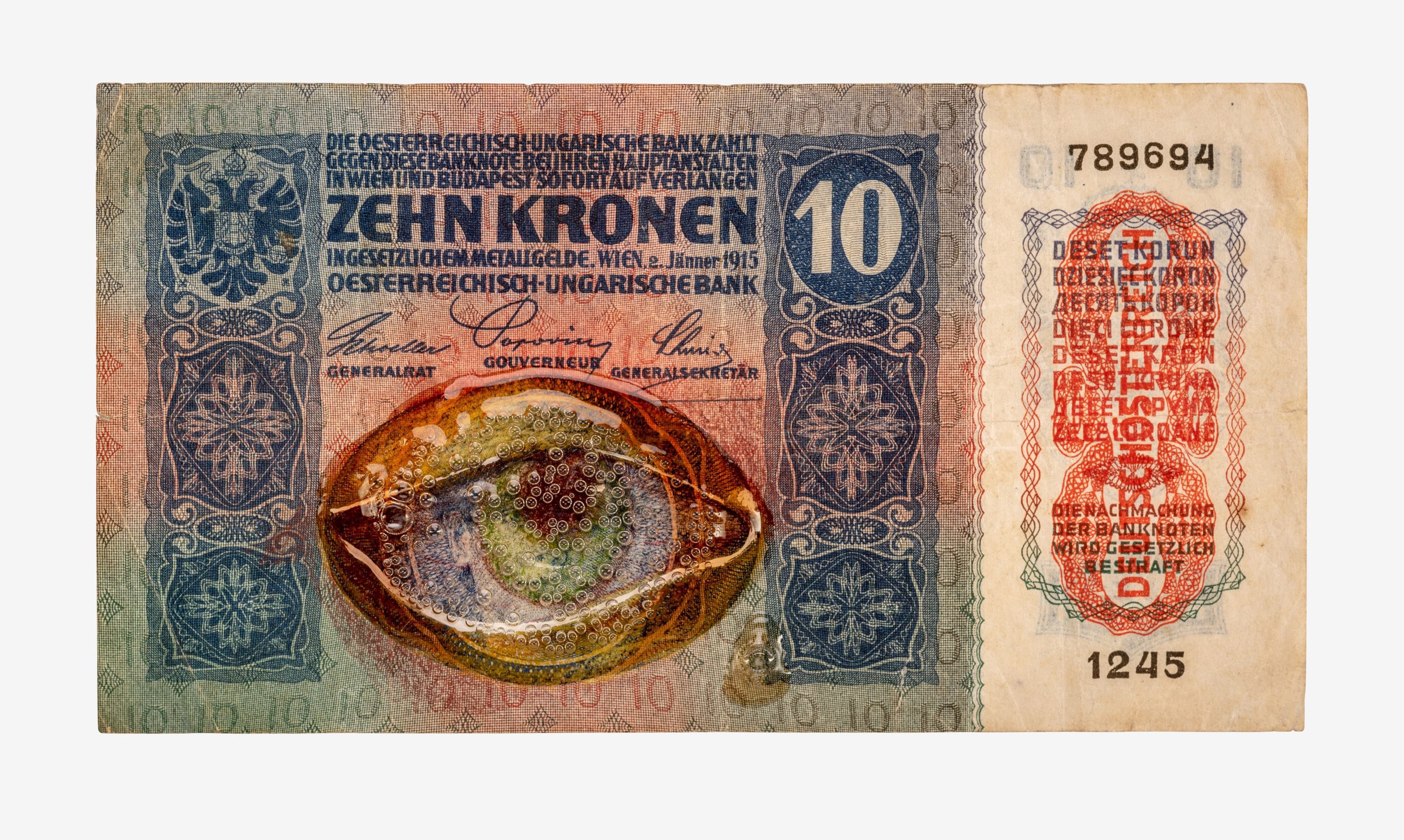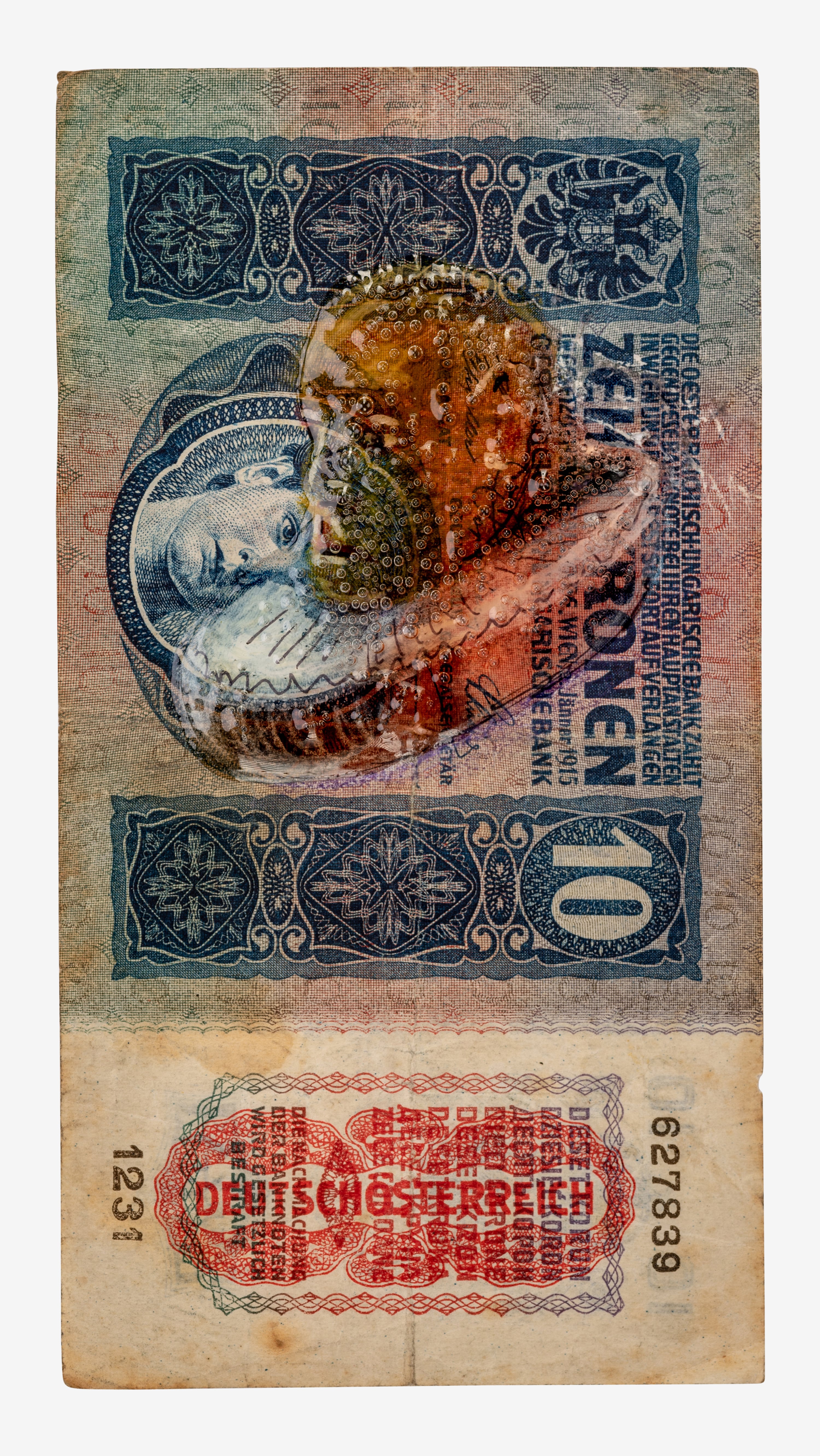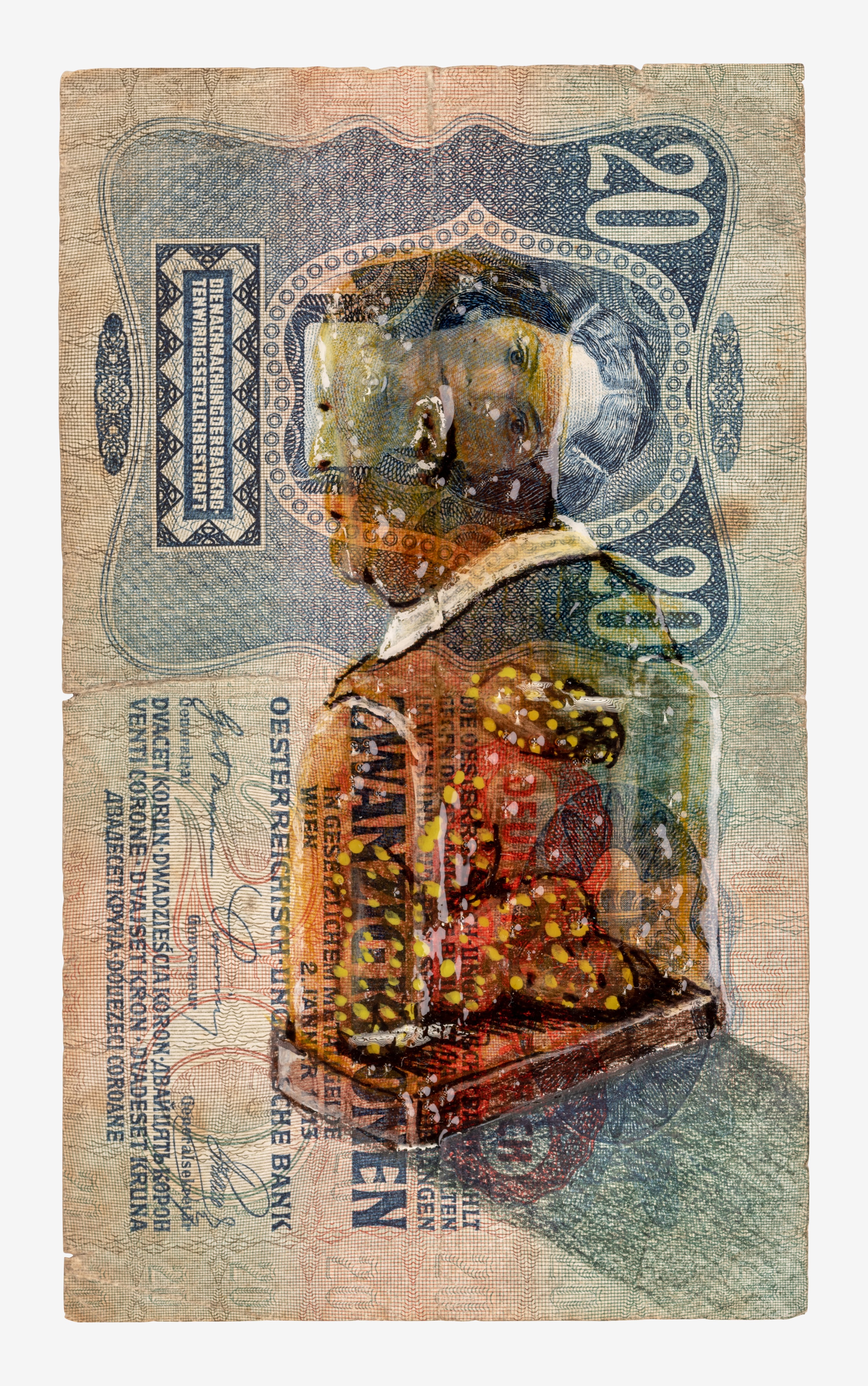 Material: Acryl und Buntstift mit UHU auf Original-Kronenbanknote
