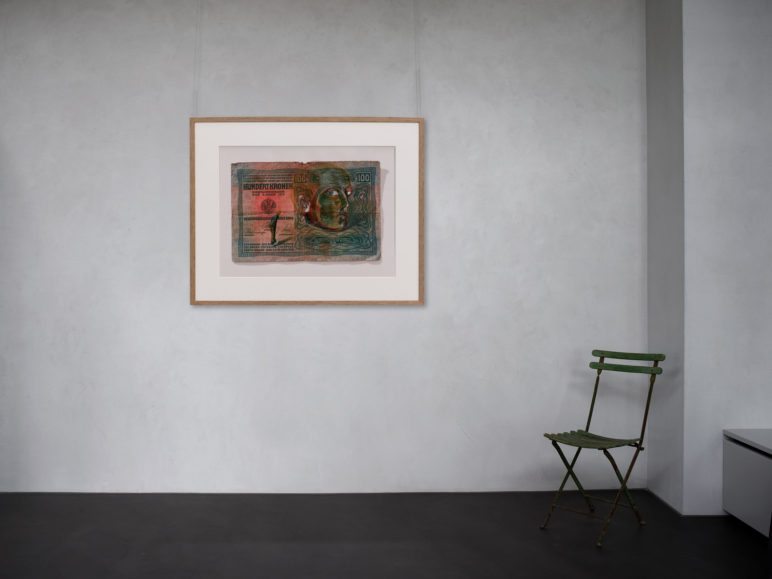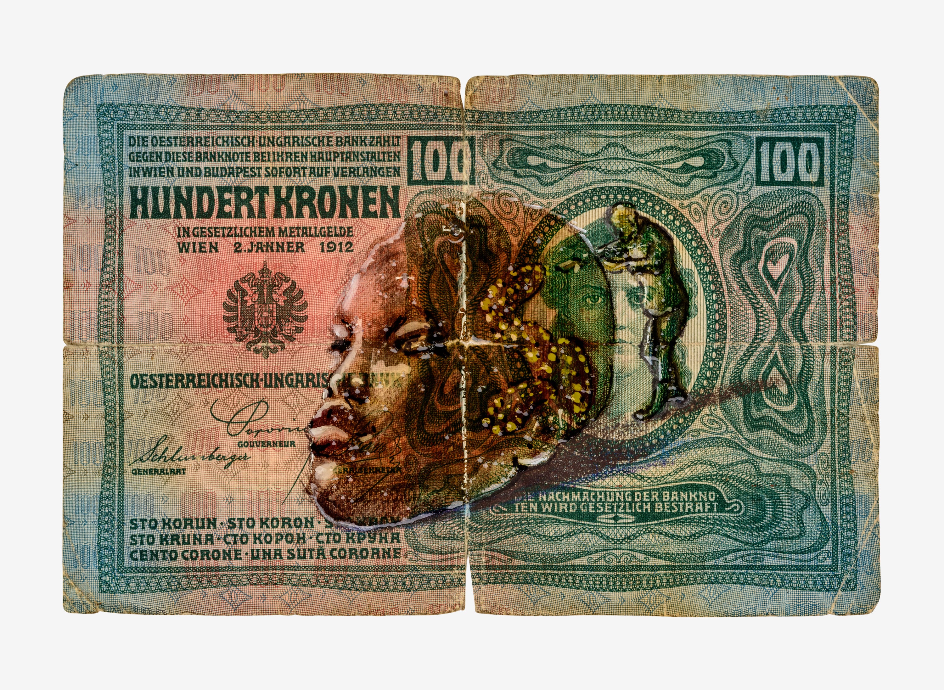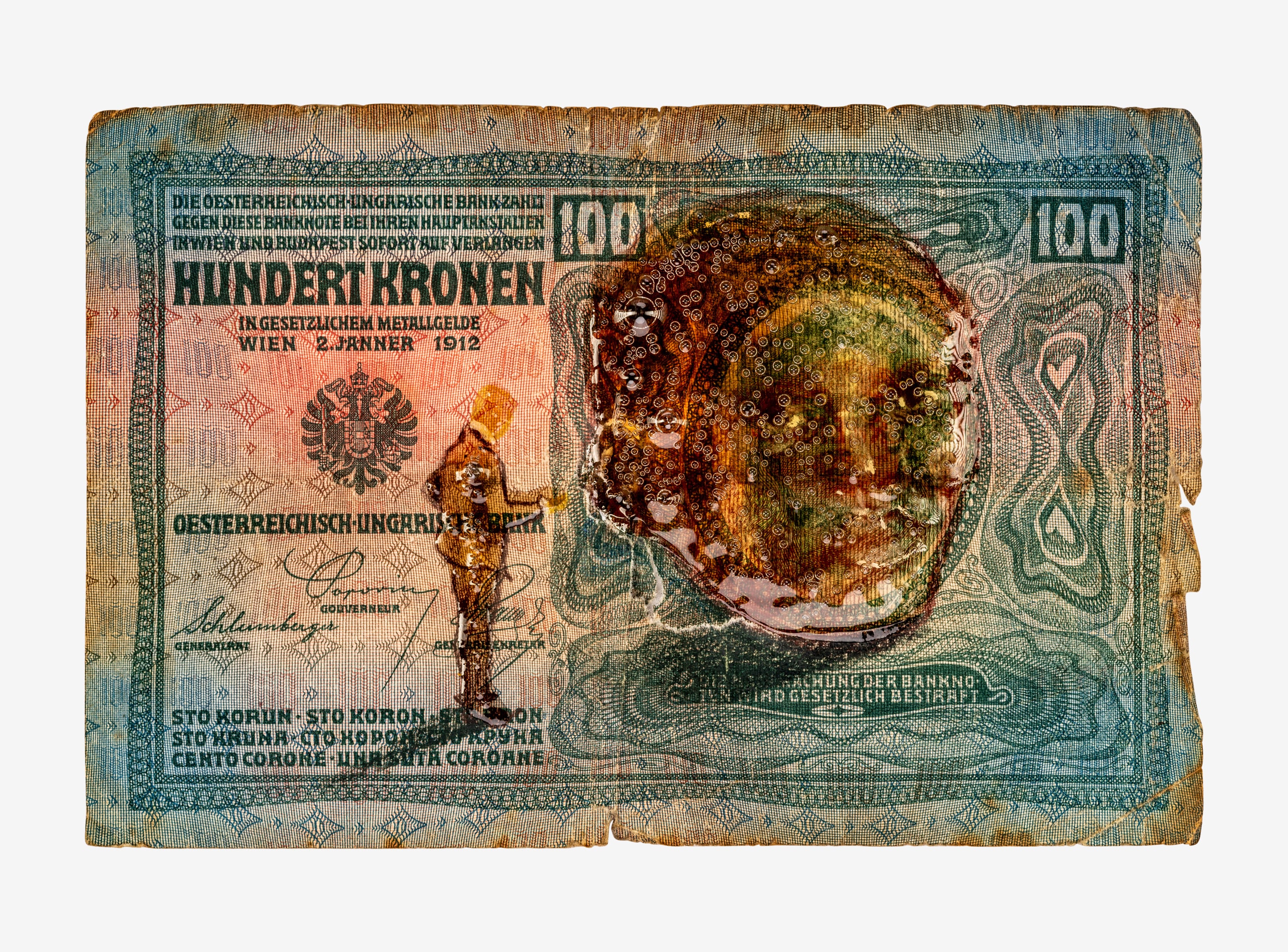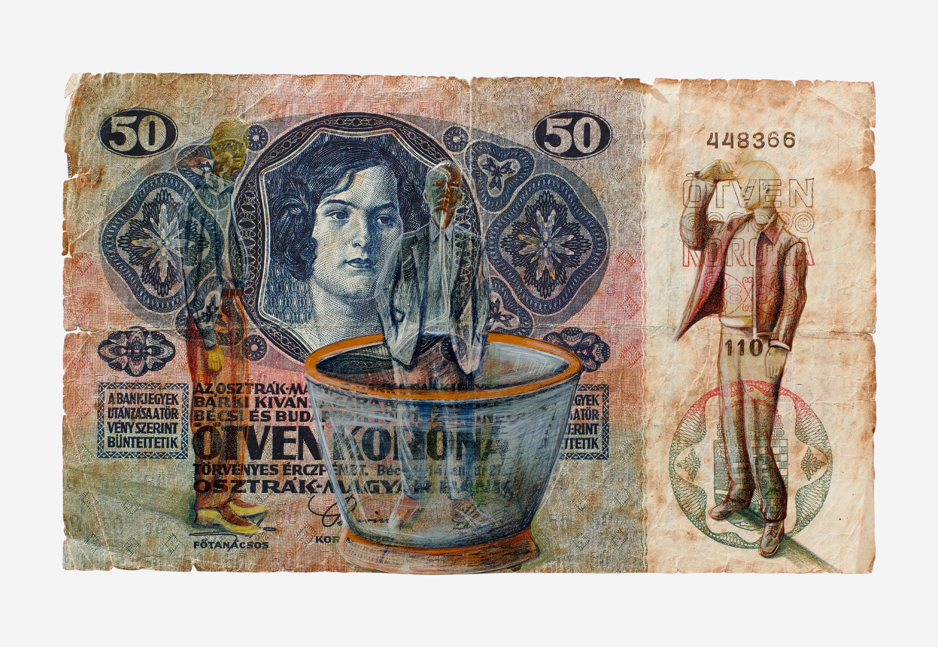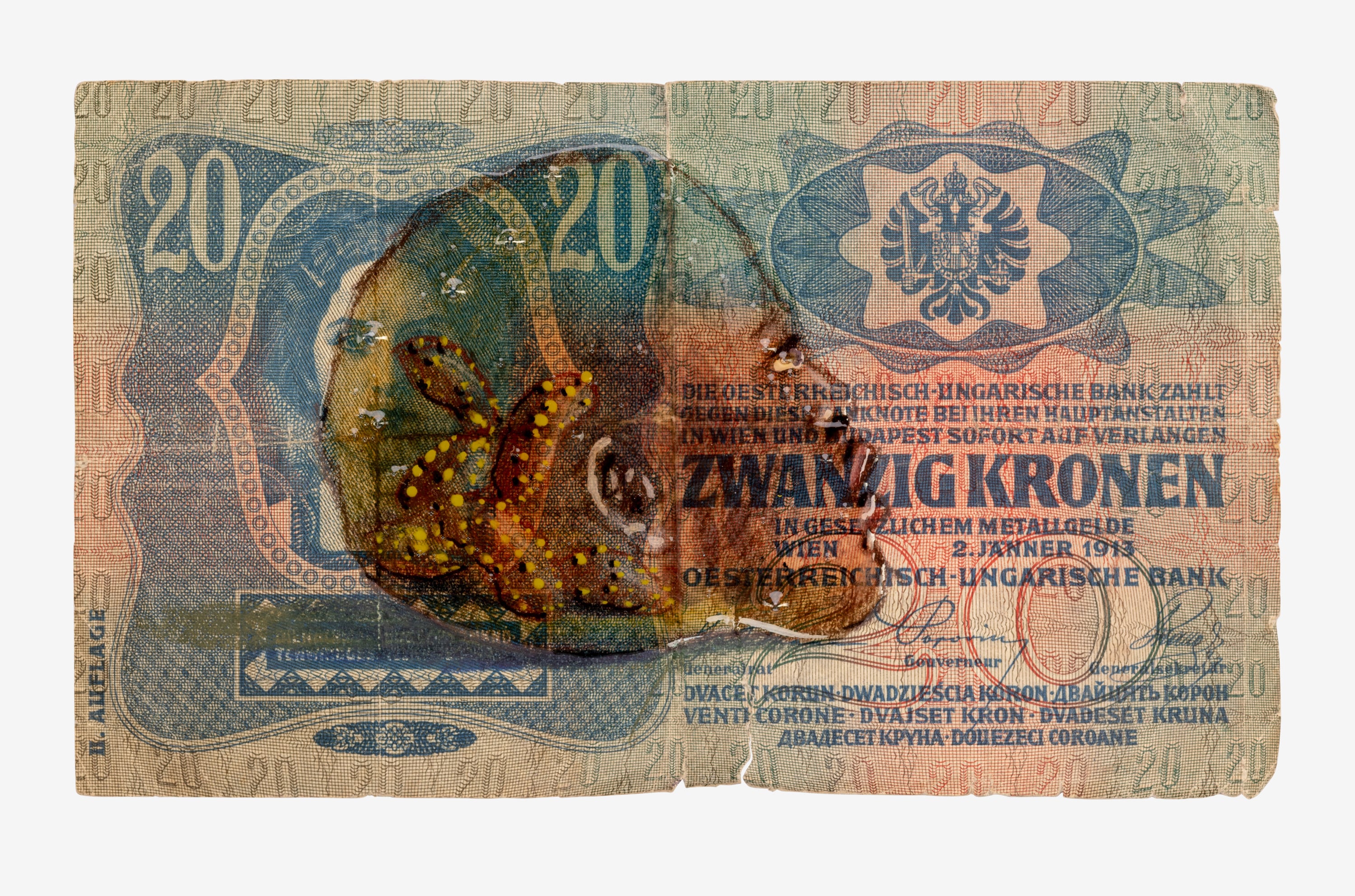 Material: Acryl und Buntstift mit UHU auf Original-Kronenbanknote
