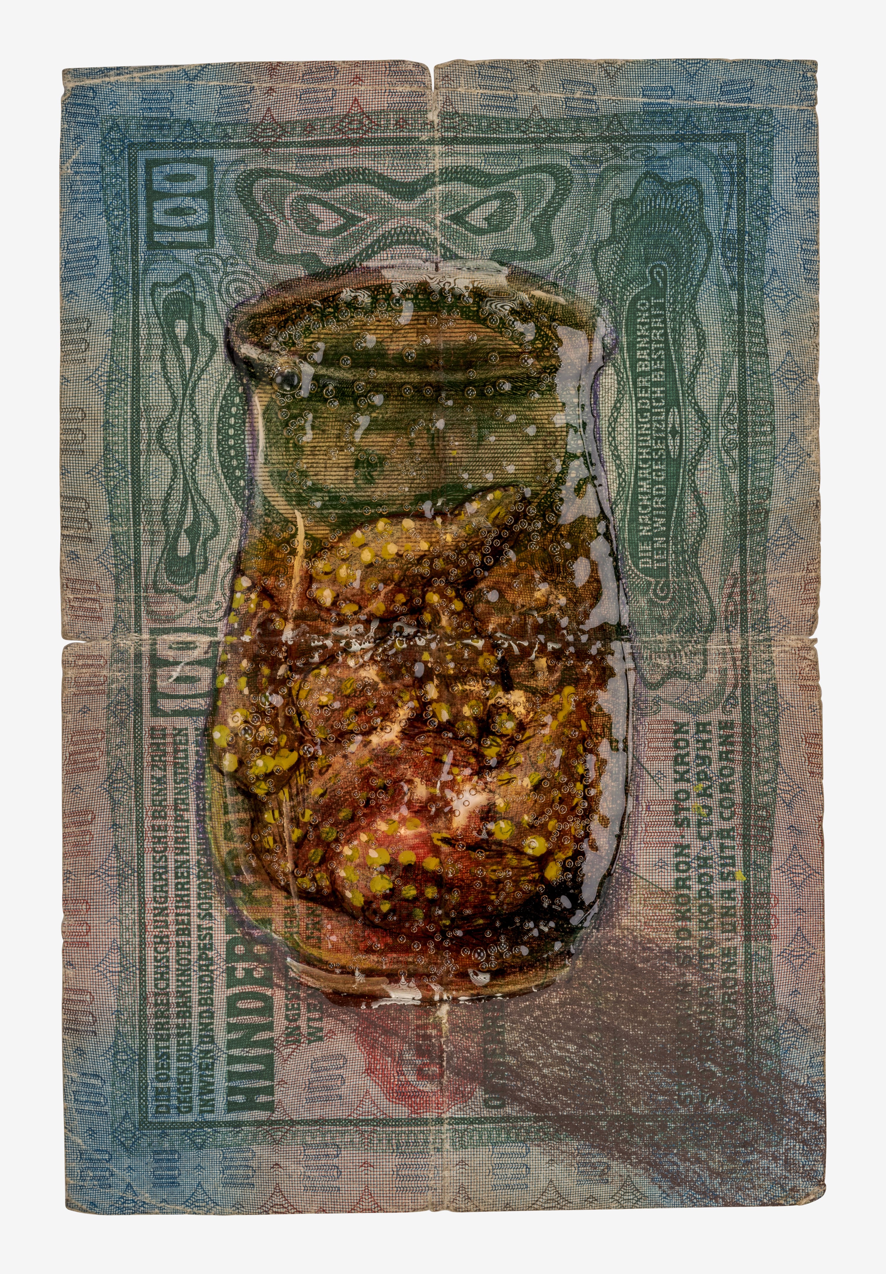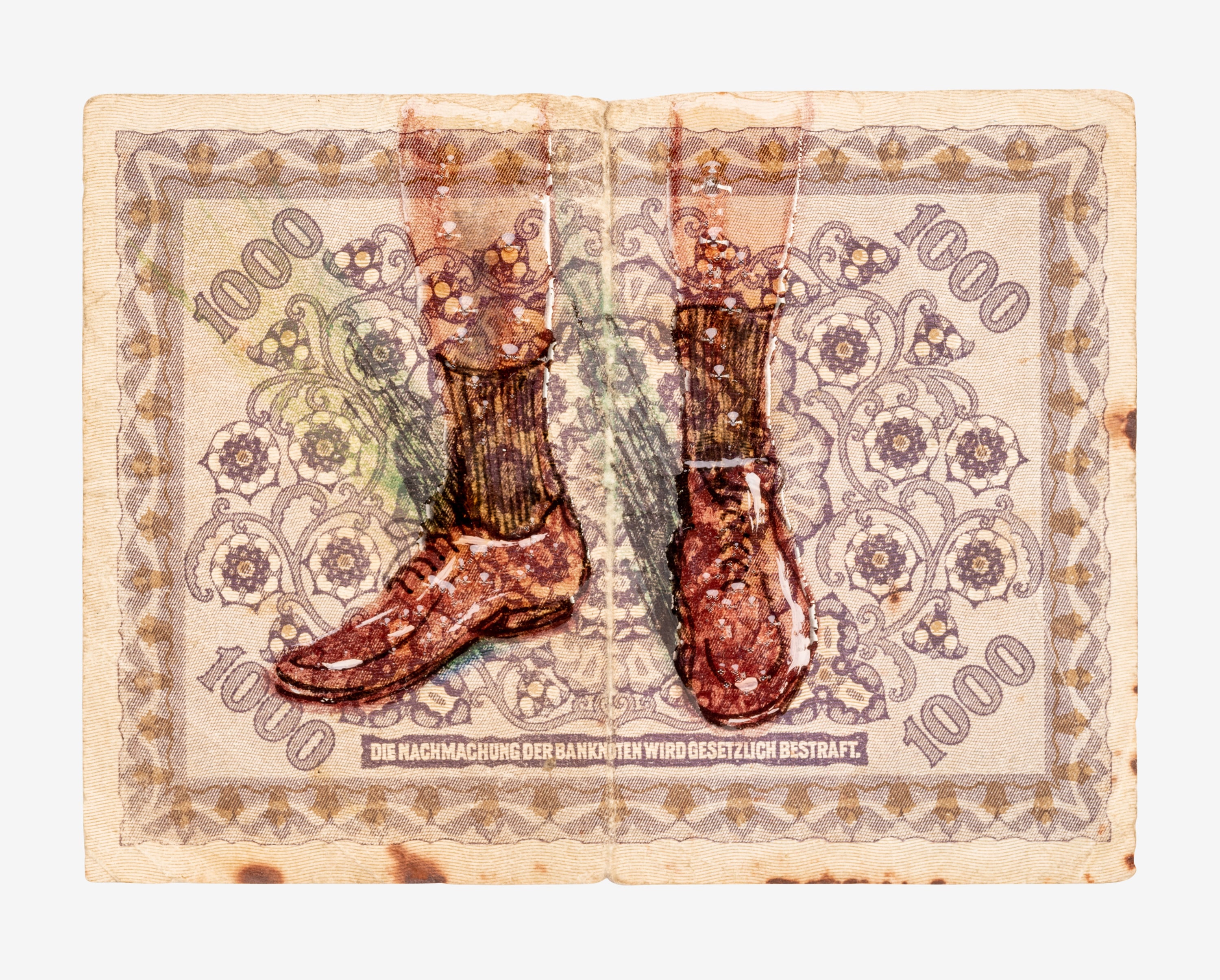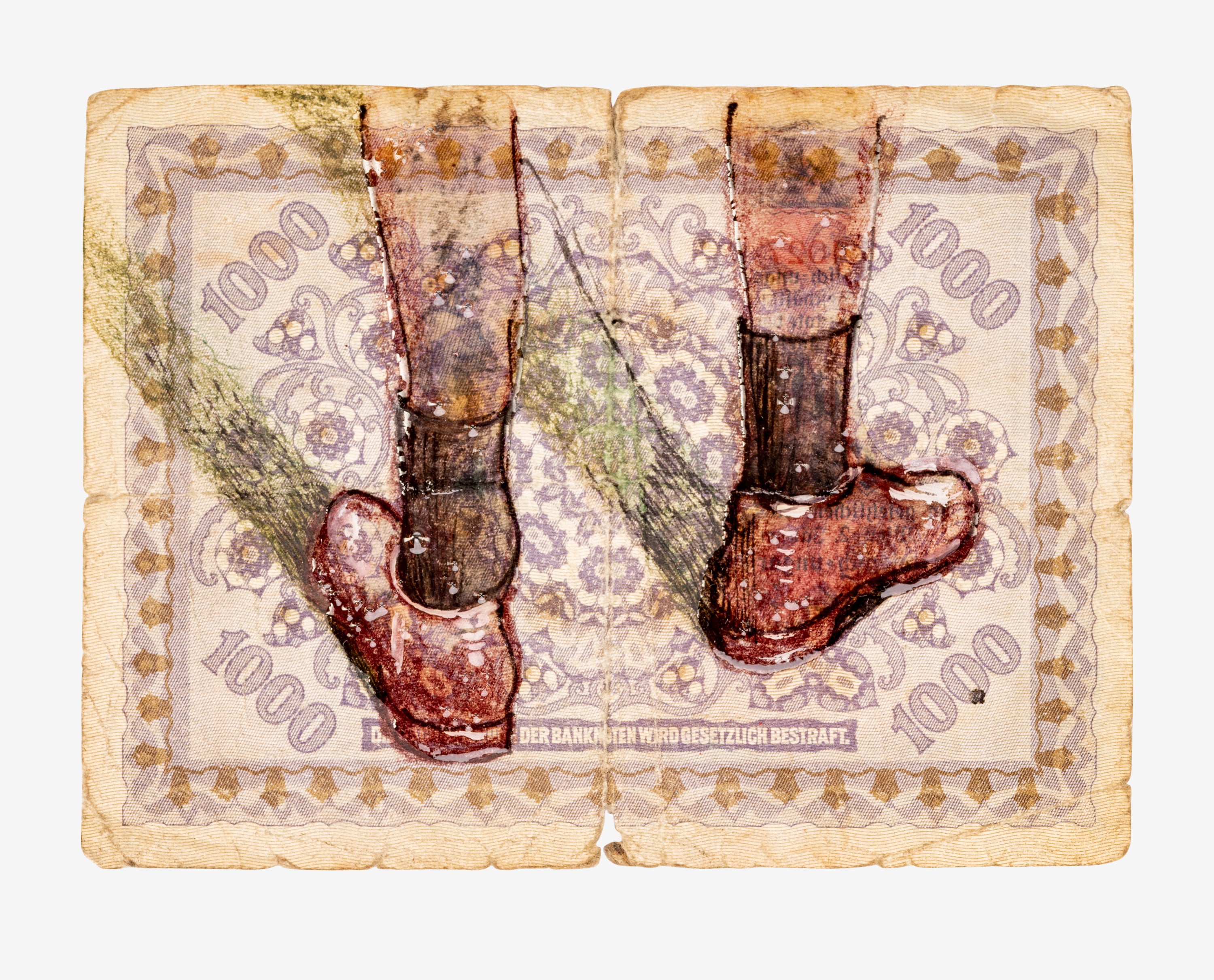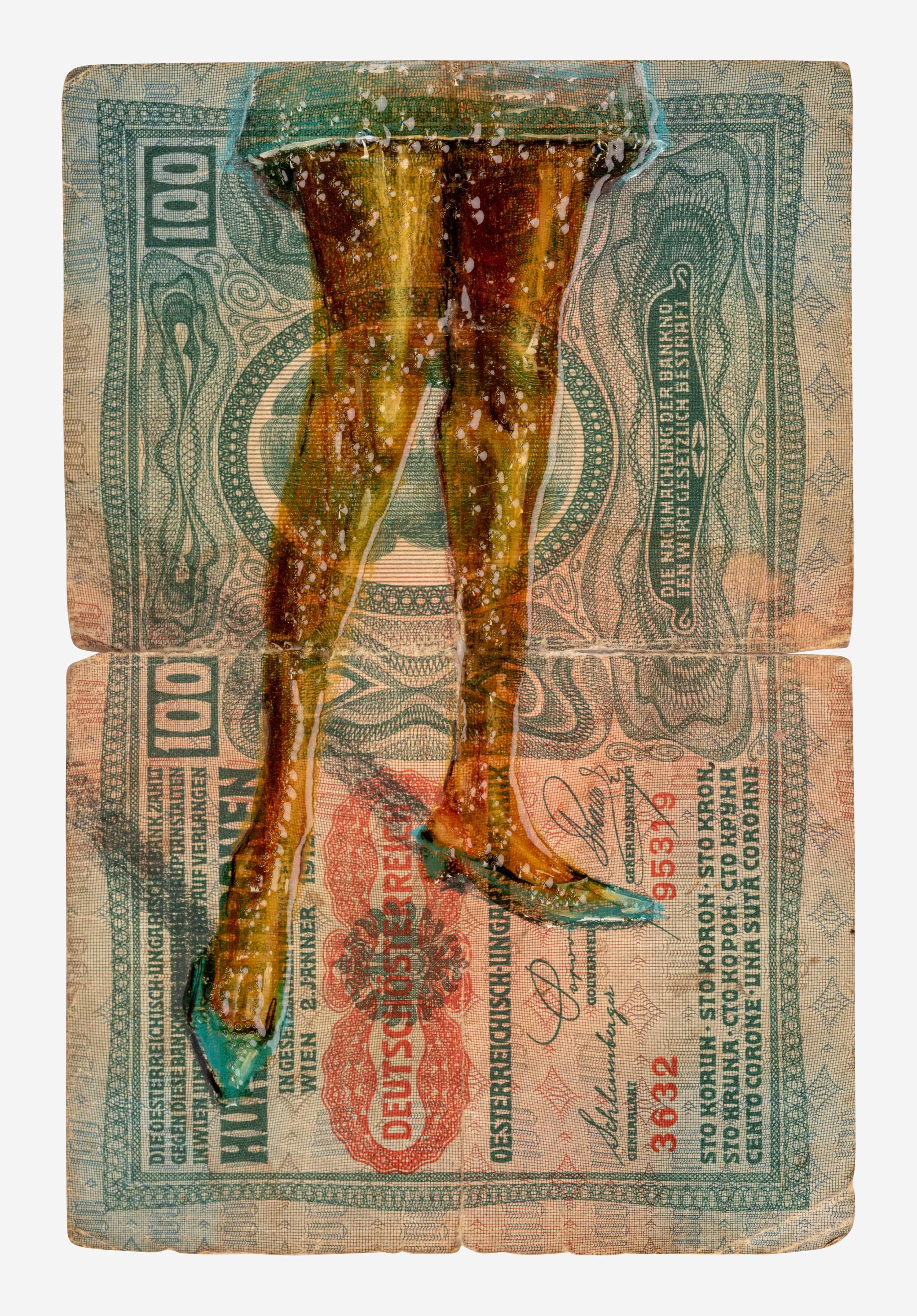 Acryl und Buntstift mit UHU auf Original Banknoten