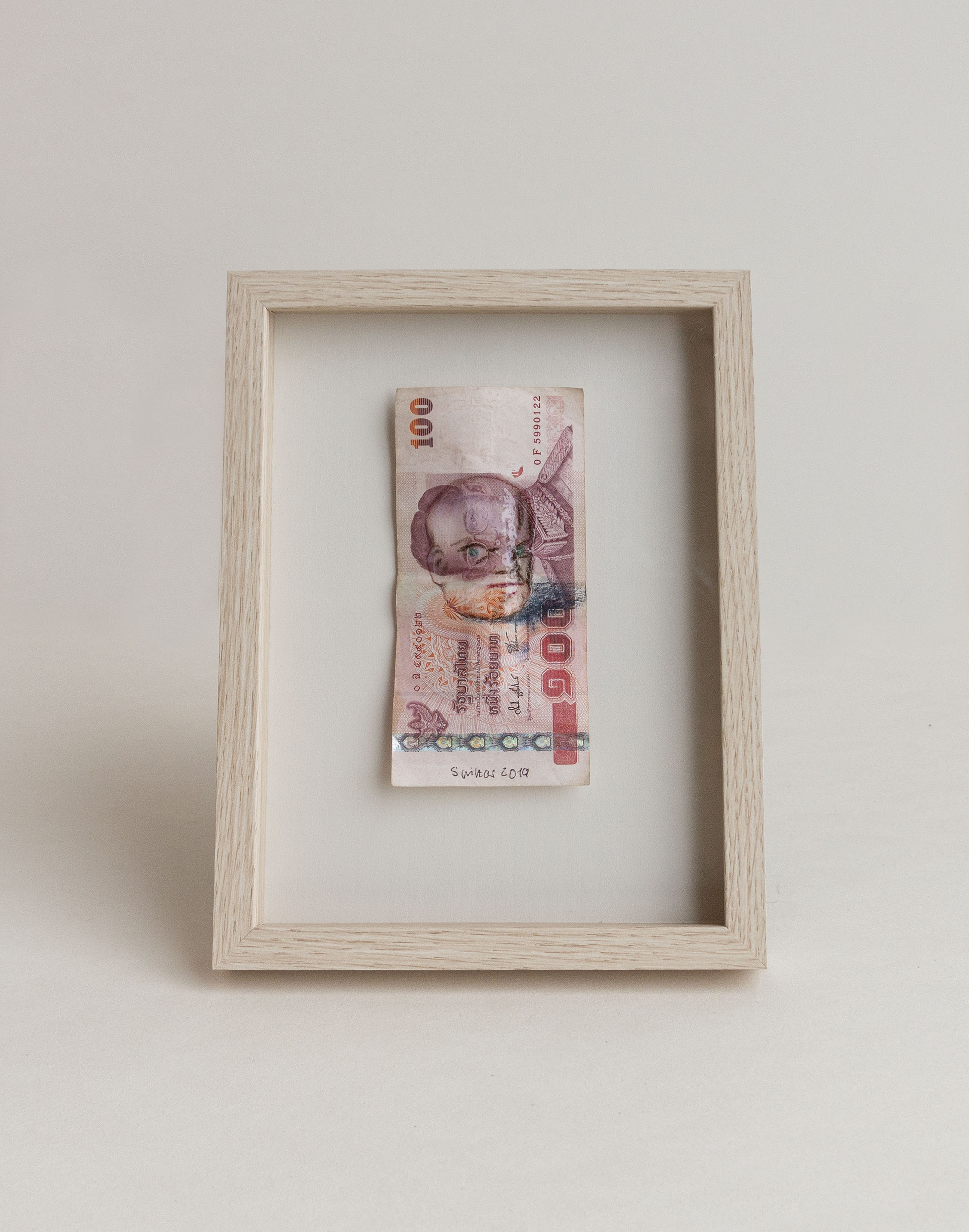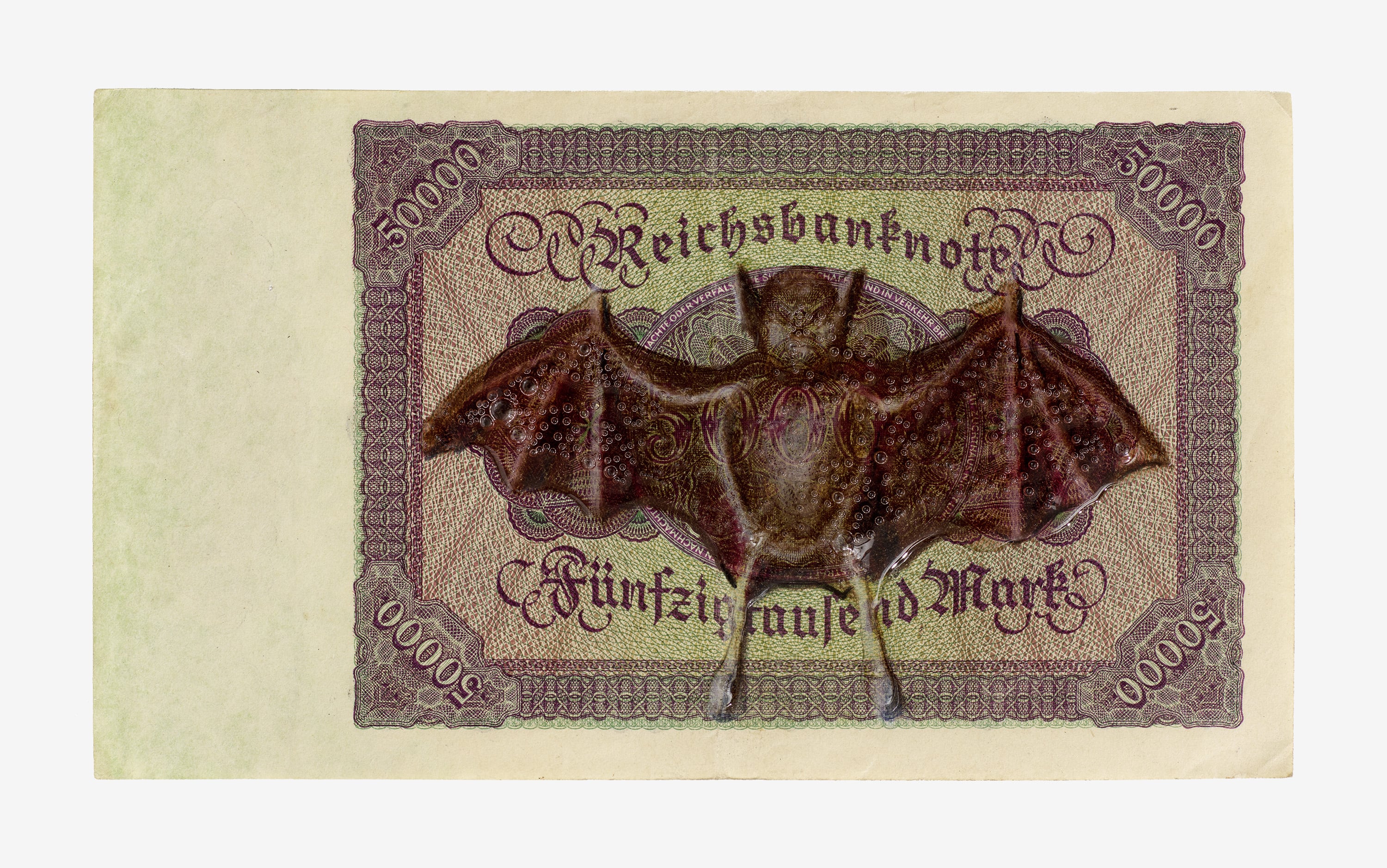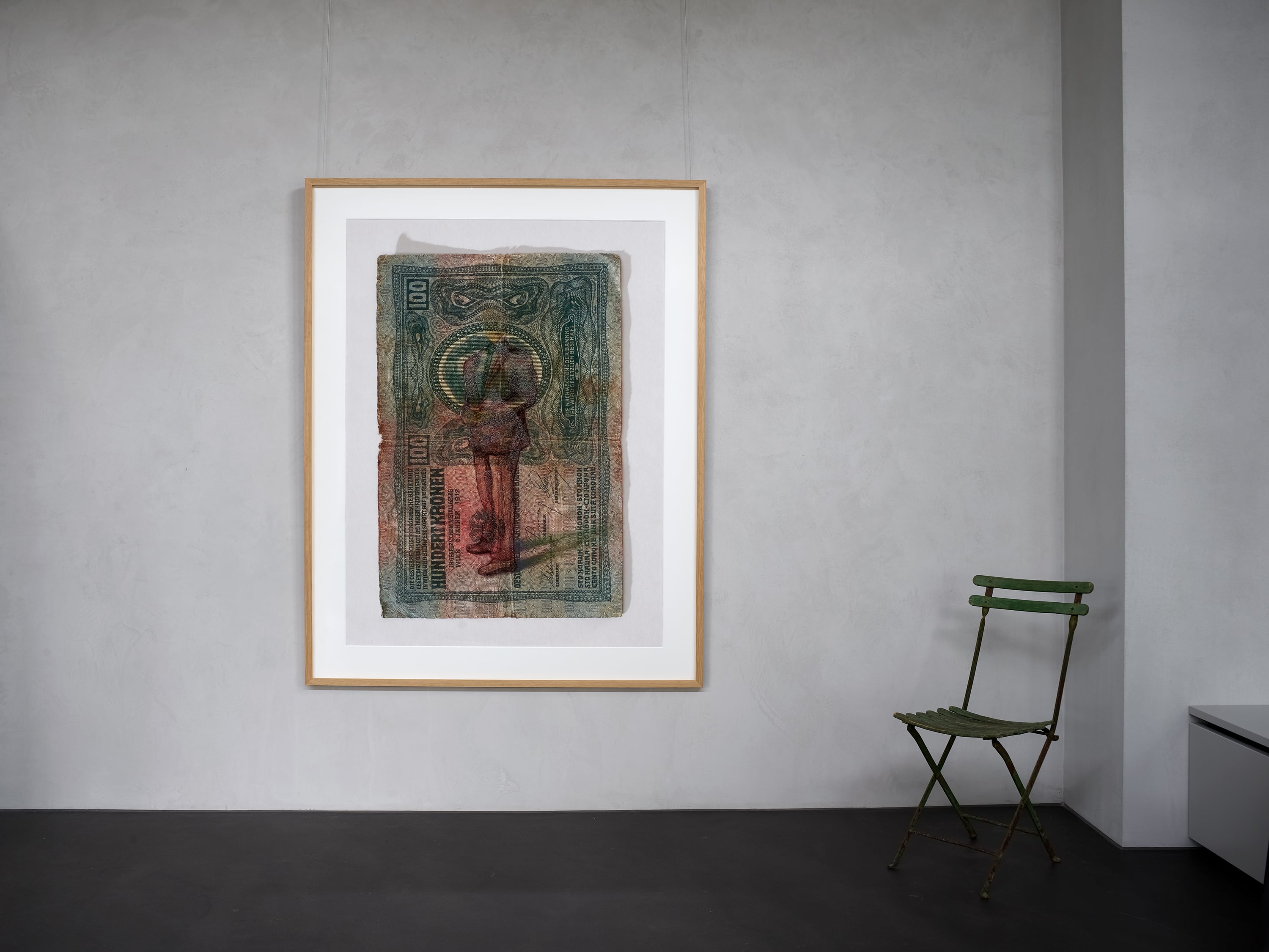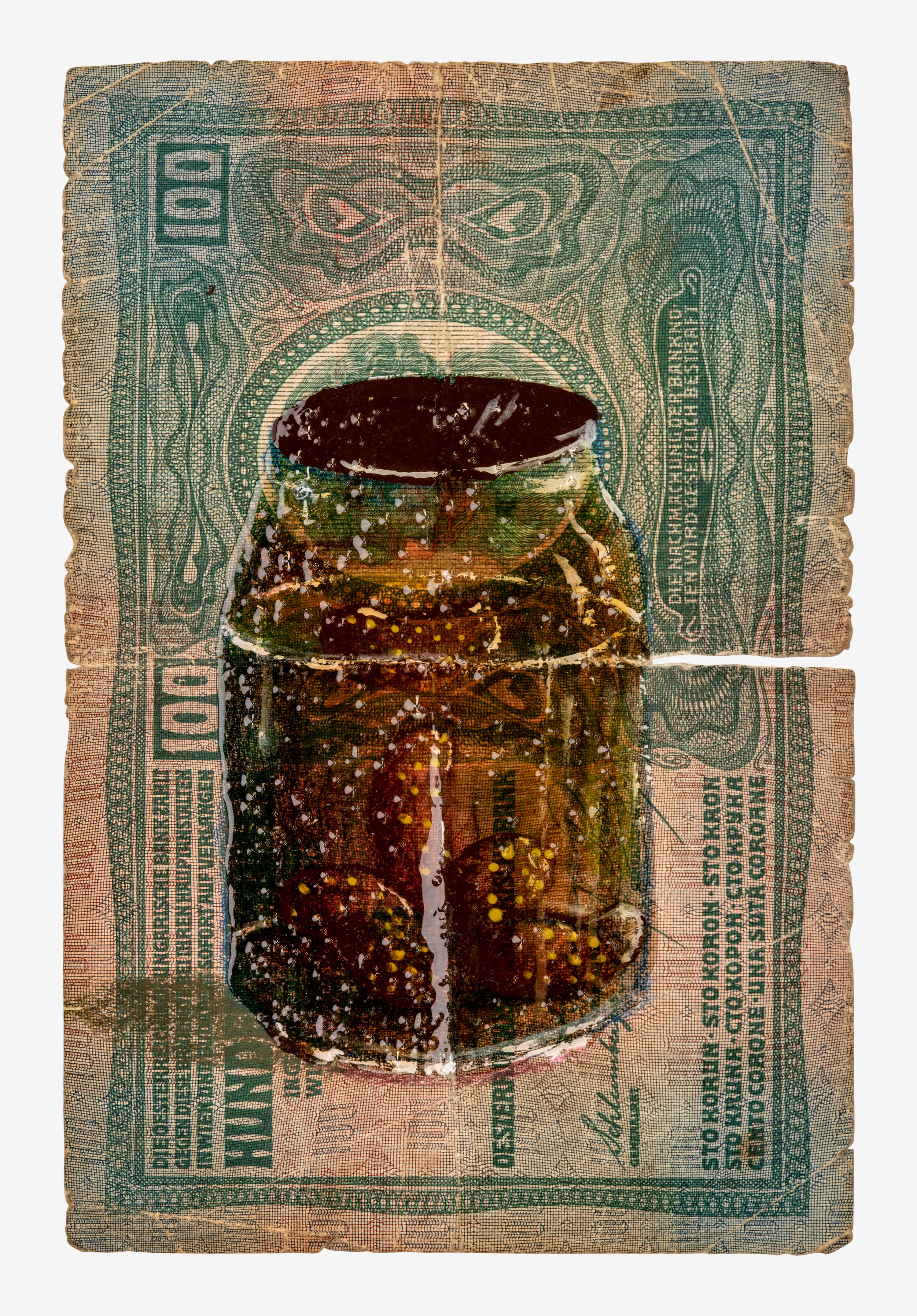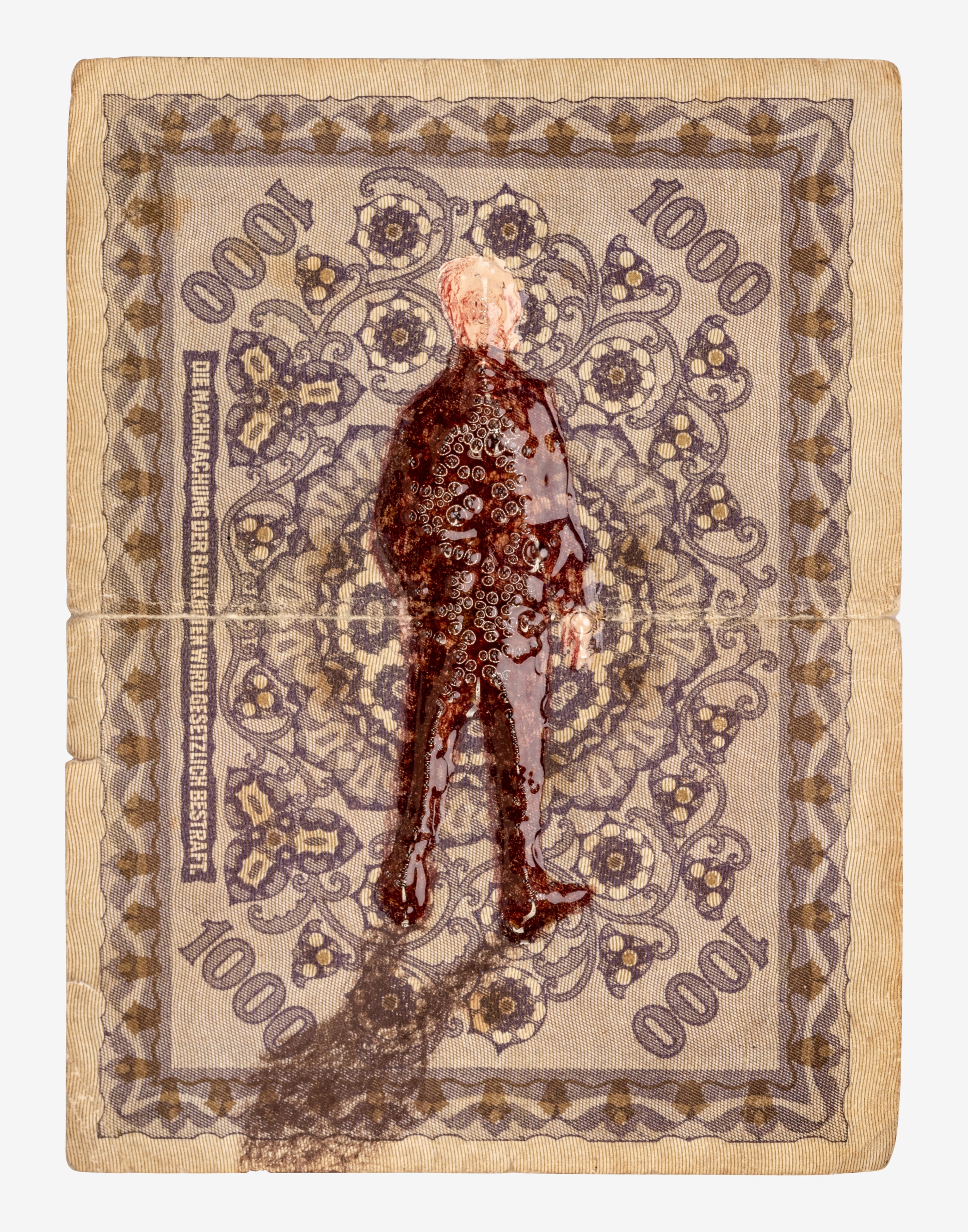 Acryl und Buntstift mit UHU auf Original Banknoten