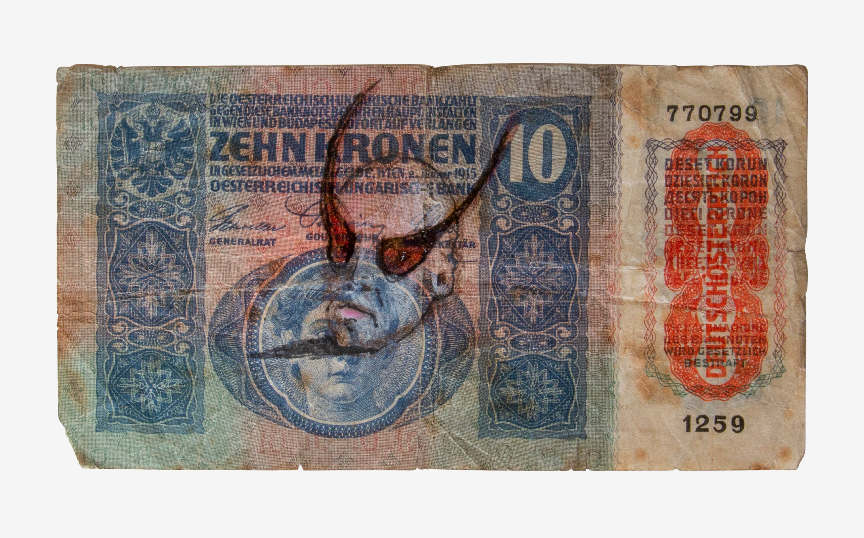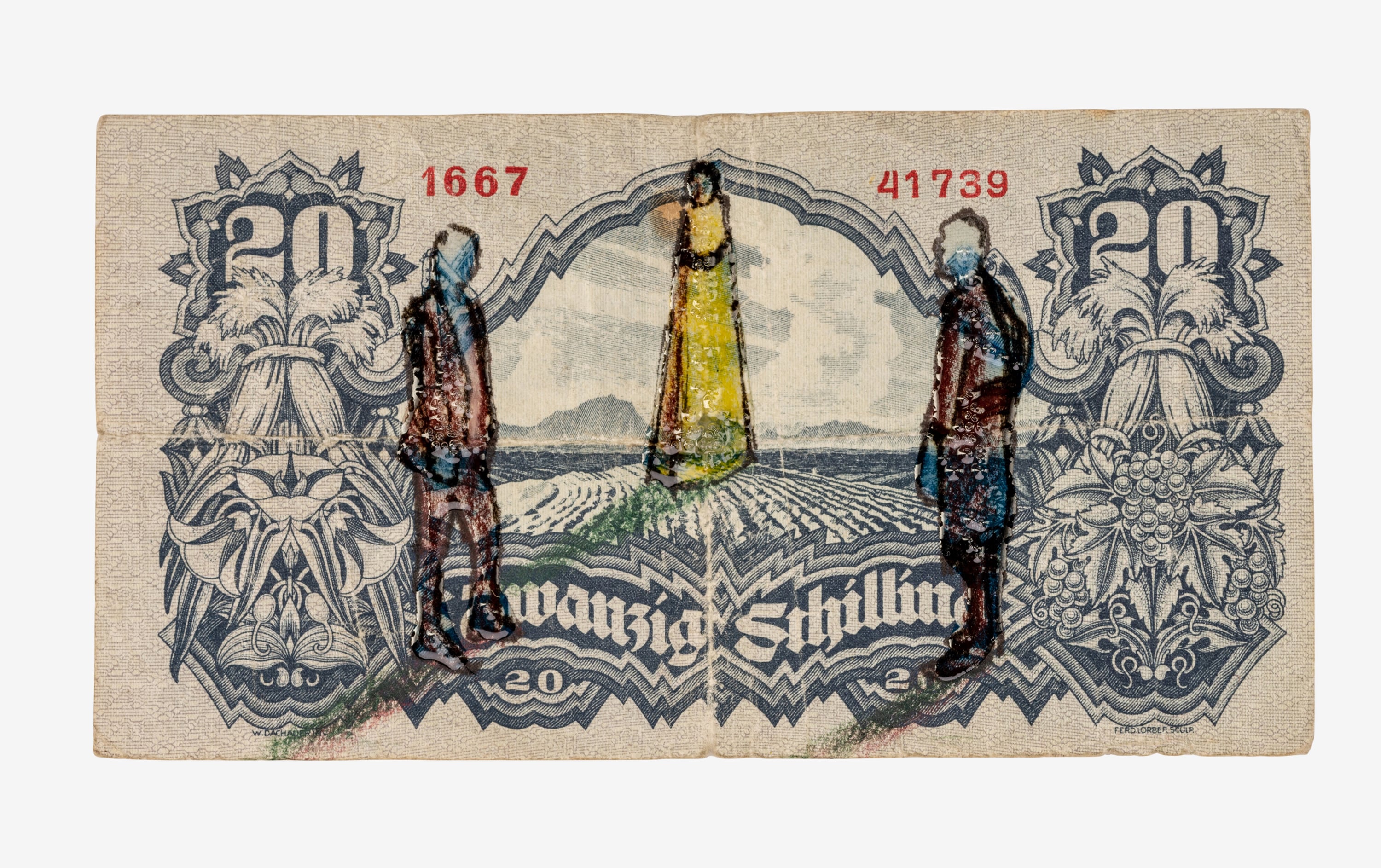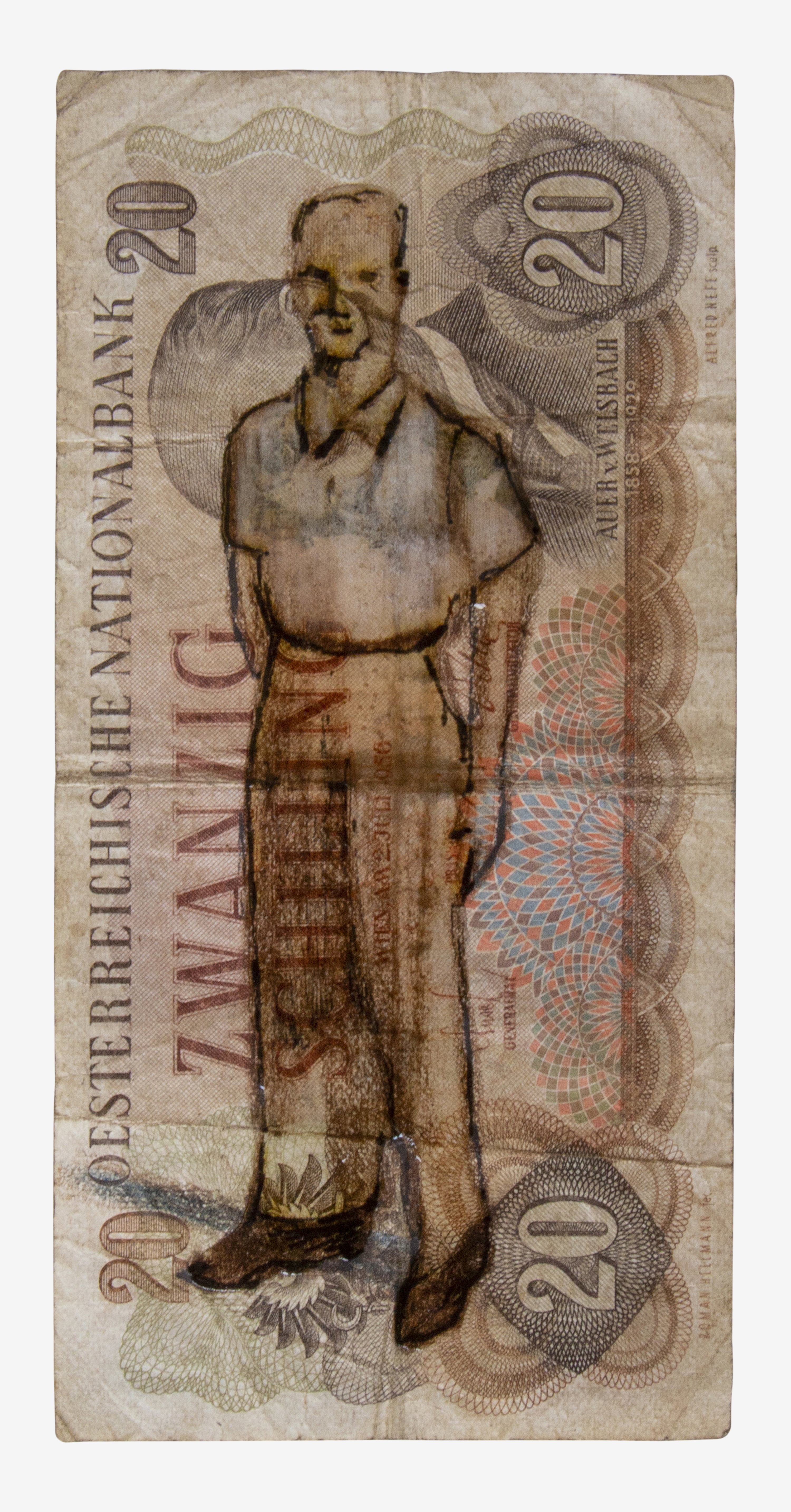 Material: Acryl und Buntstift mit UHU auf Original-Schillingbanknote