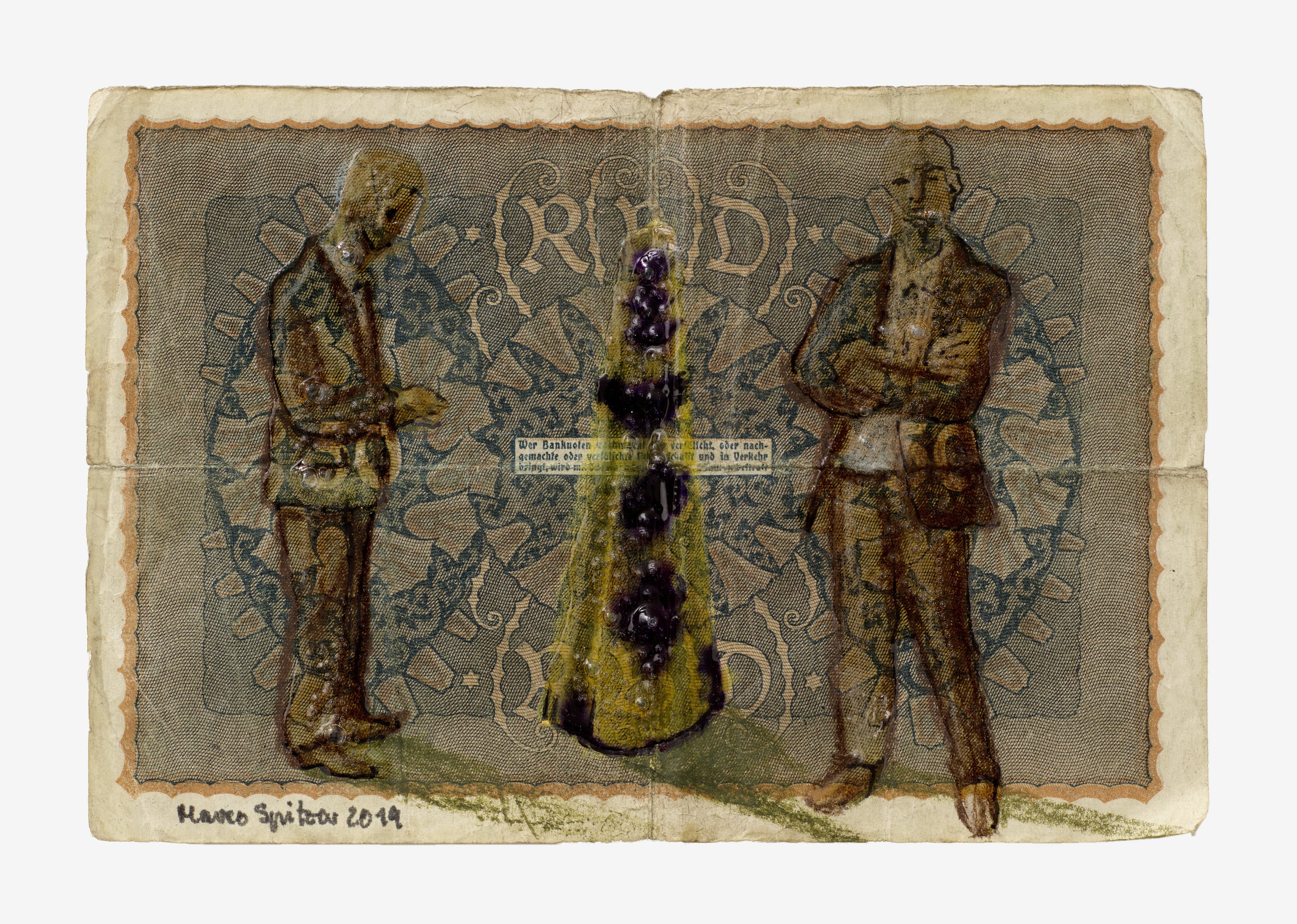 Material: Fineliner und Buntstift mit UHU auf Original-Markbanknote
