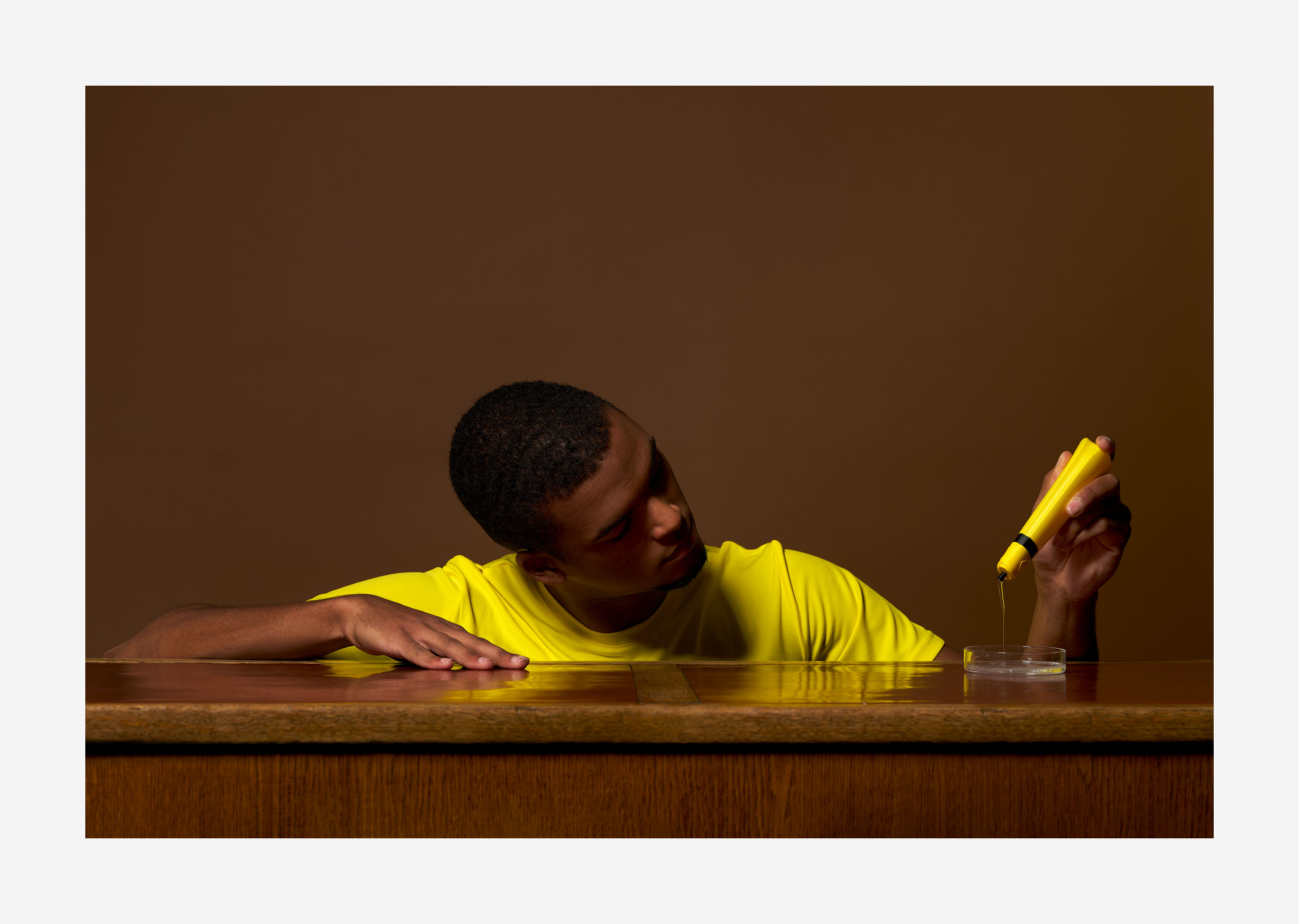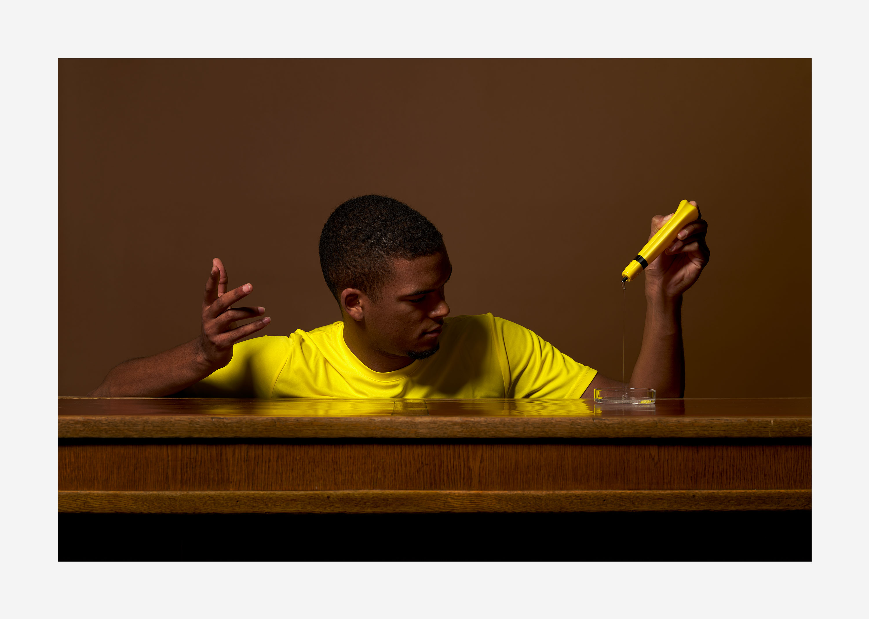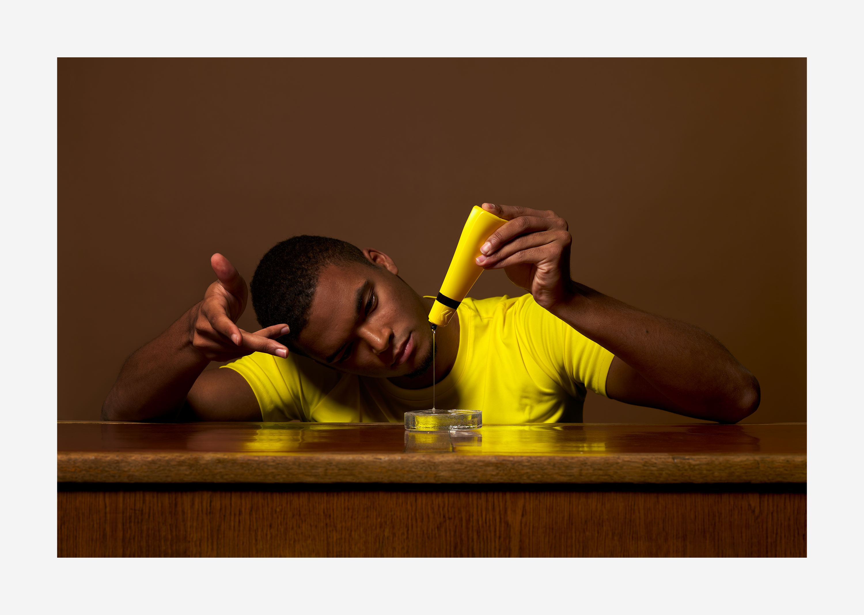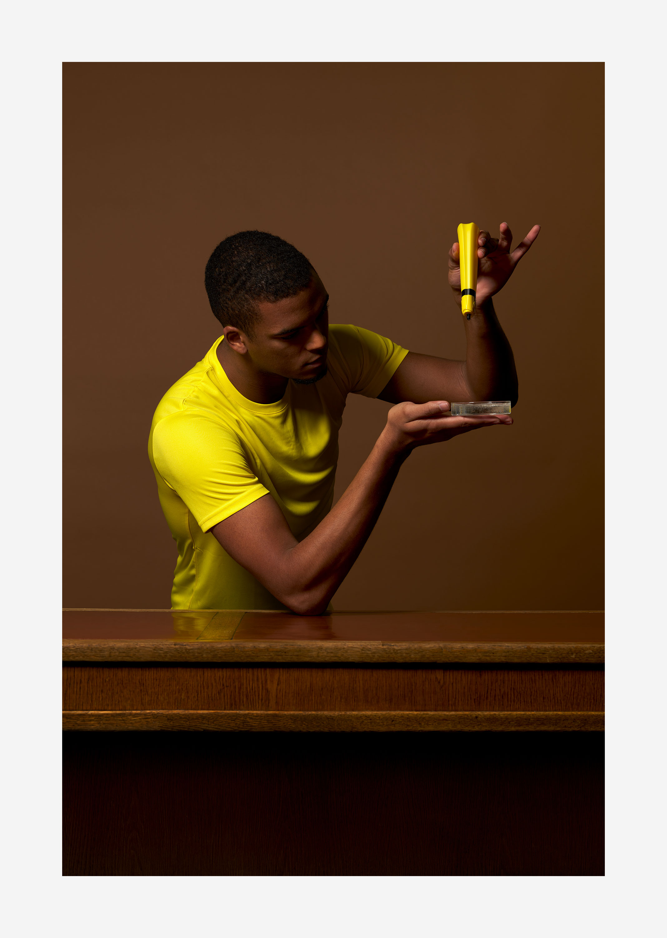 „Aus dem ICH löse ich mich wenn ich in eine einzige Beschäftigung fließe“, sagt Marco Spitzar. Die Wahrnehmung der afrikanischen Heiler prägten die Aufmerksamkeit auf Rituale, die die Konzentration so schärften, dass sie meditative Formen annahmen und einen eingebungsvollen spirituellen Minimalismus erst ermöglichen. Es war ein Glück den Vorgang des Fließens beim Kleben für sich zu entdecken und als beinahe überirdische Handlung wahrzunehmen. Nicht weit weg denken, ganz bei sich im Fluss des Klebens zu bleiben erinnert Marco Spitzar an Figuren des japanischen NO Theaters, an die Reduktion des pantominischem Spiels. Inspiriert von Haltungen des klassischen Balletts und der Verschmelzung von Geschlechteridentitäten ist der Raum frei für ganz gezielte wie eingefroren wirkende Bewegungen, in die jeder Mensch für sich seine persönlichen Assoziationen hinein interpretieren kann und sollte.