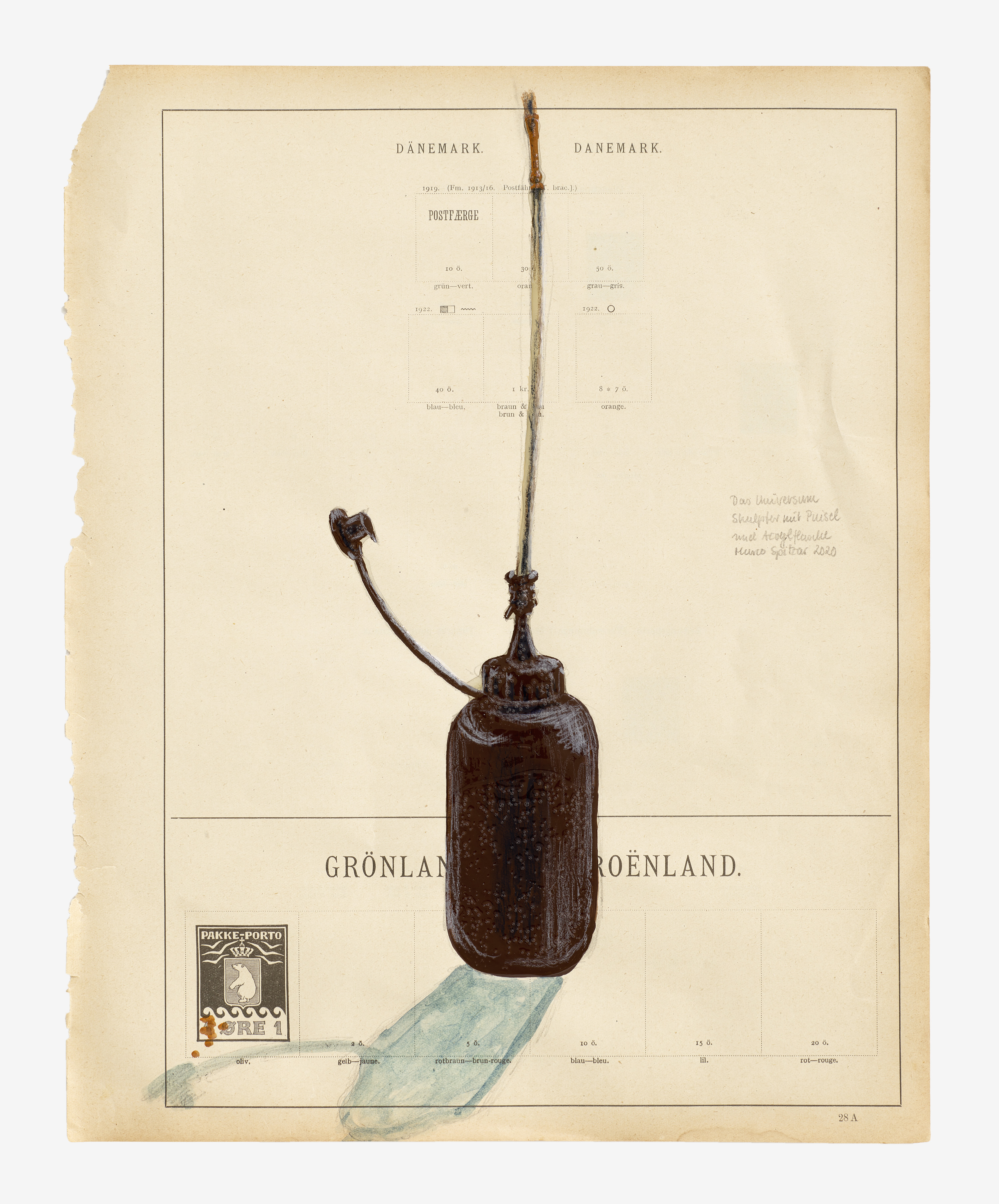 Material: Acryl, Aquarell und Buntstift mit UHU auf historischem Papier