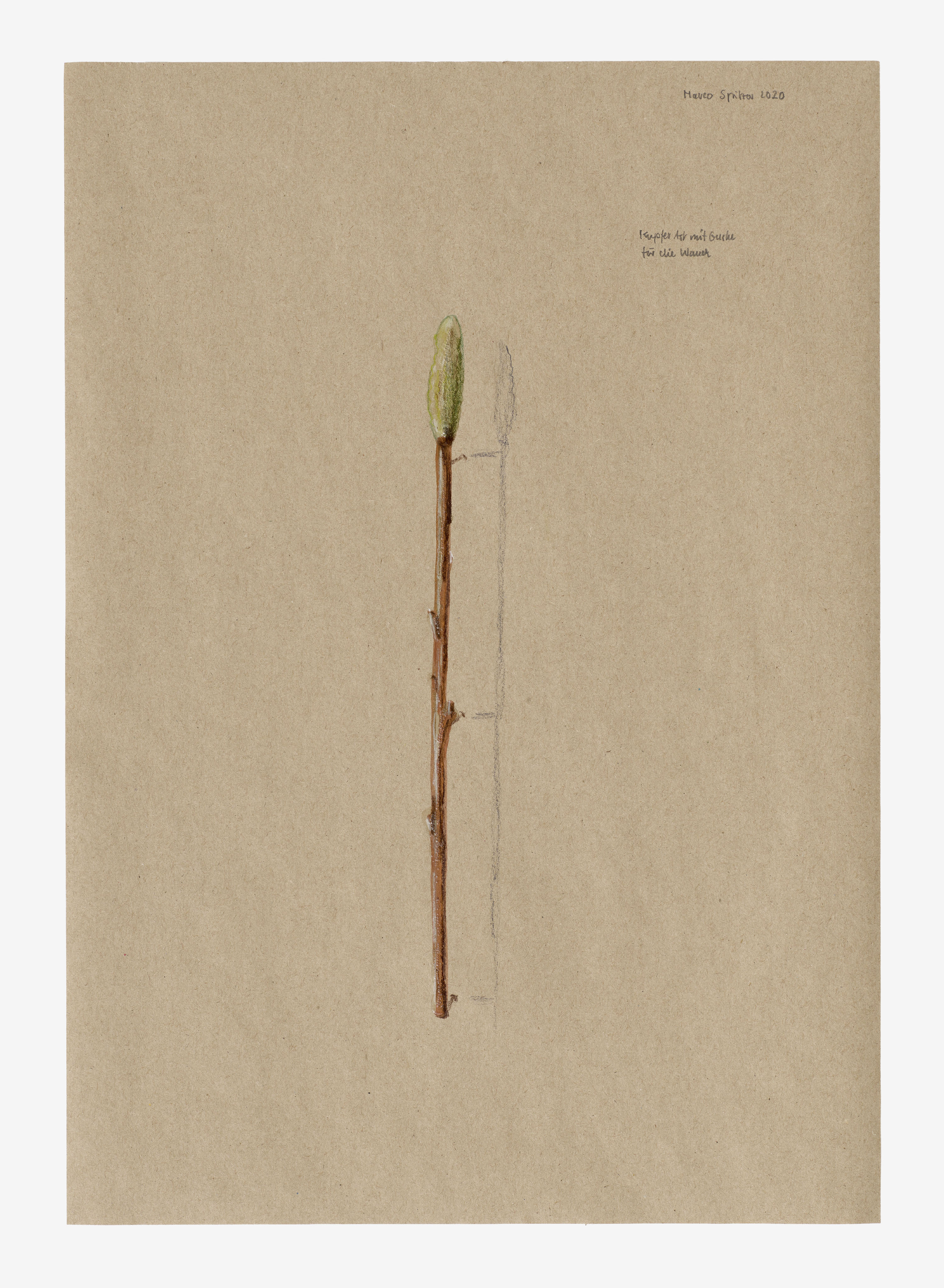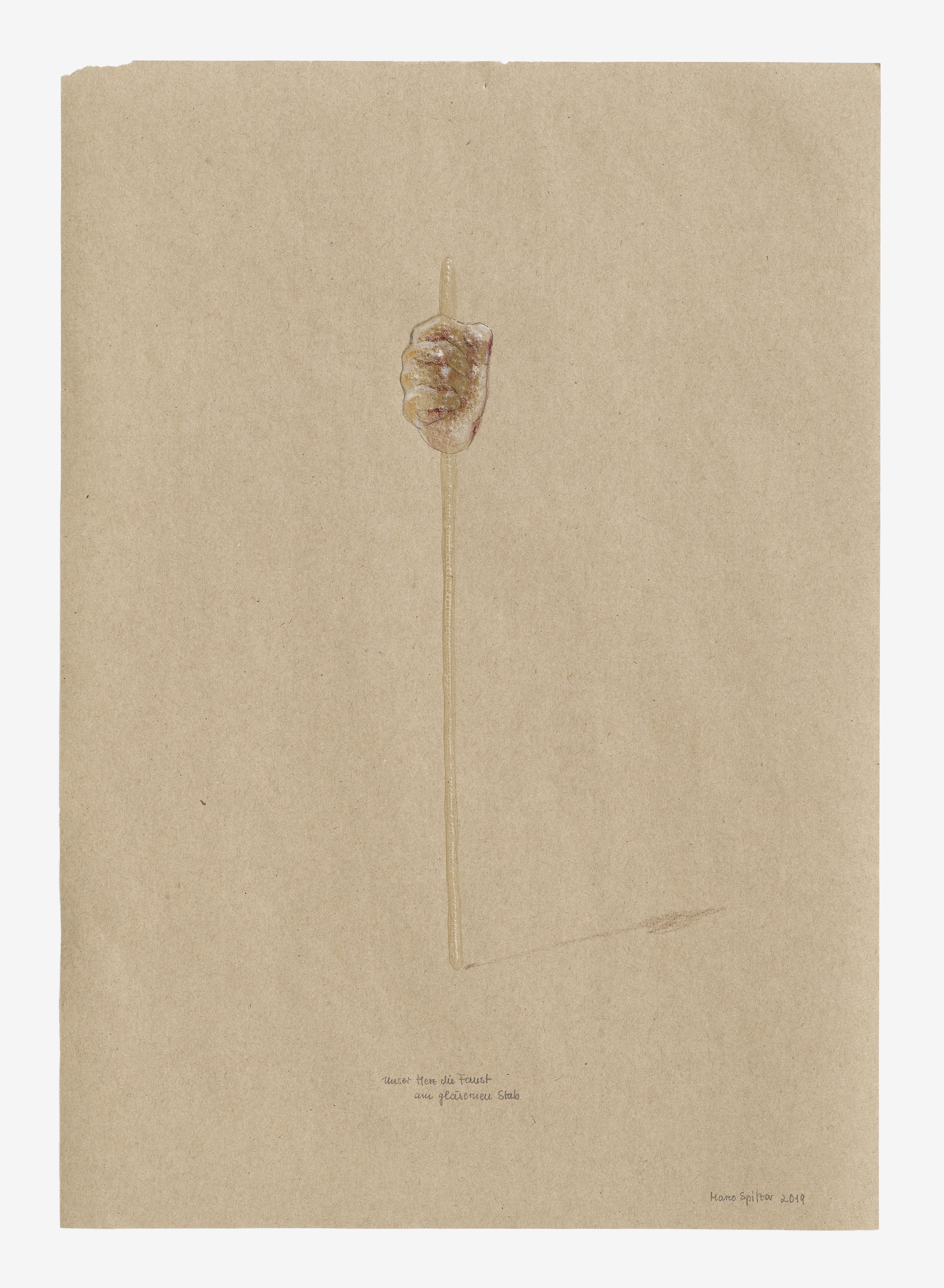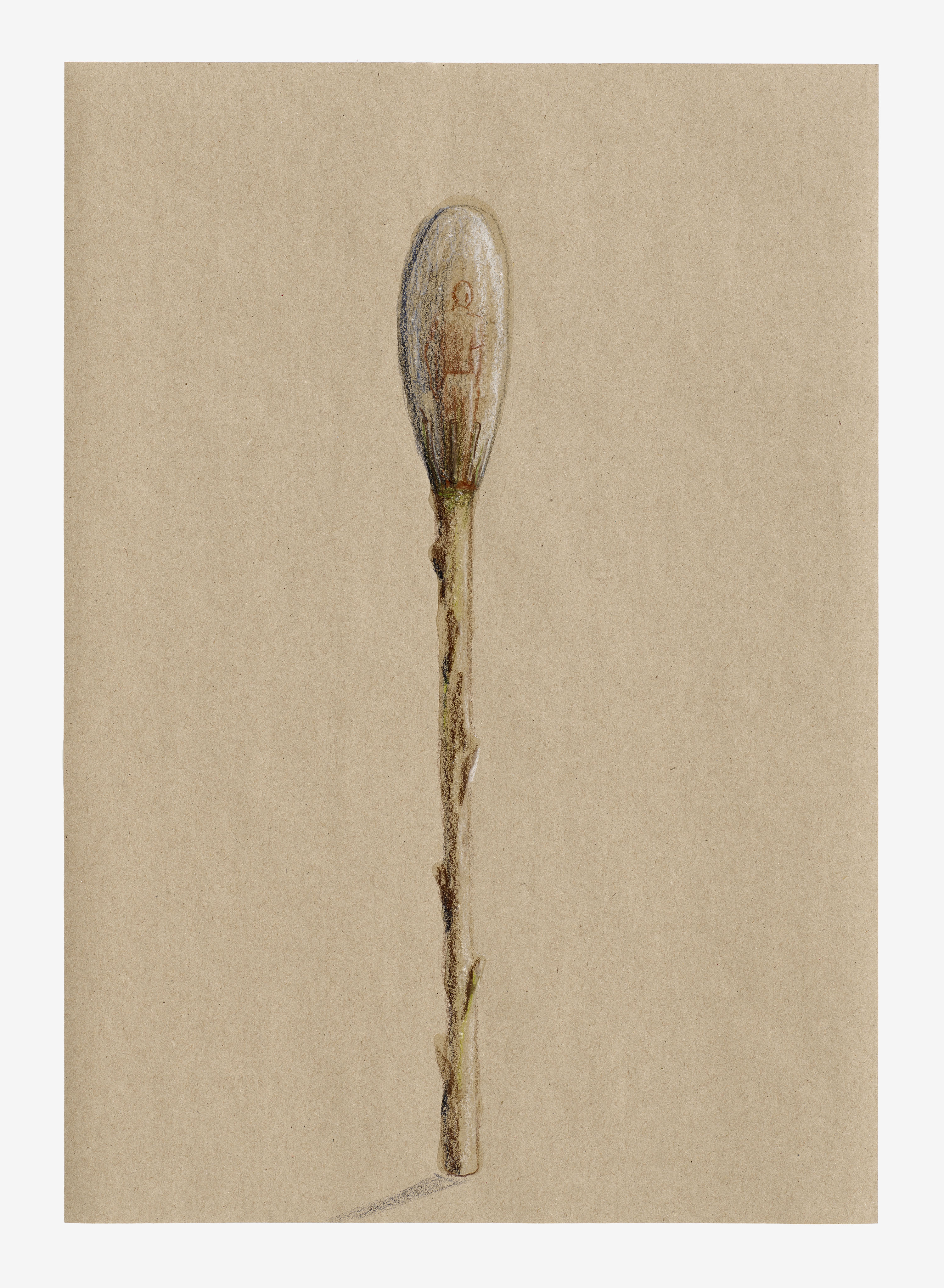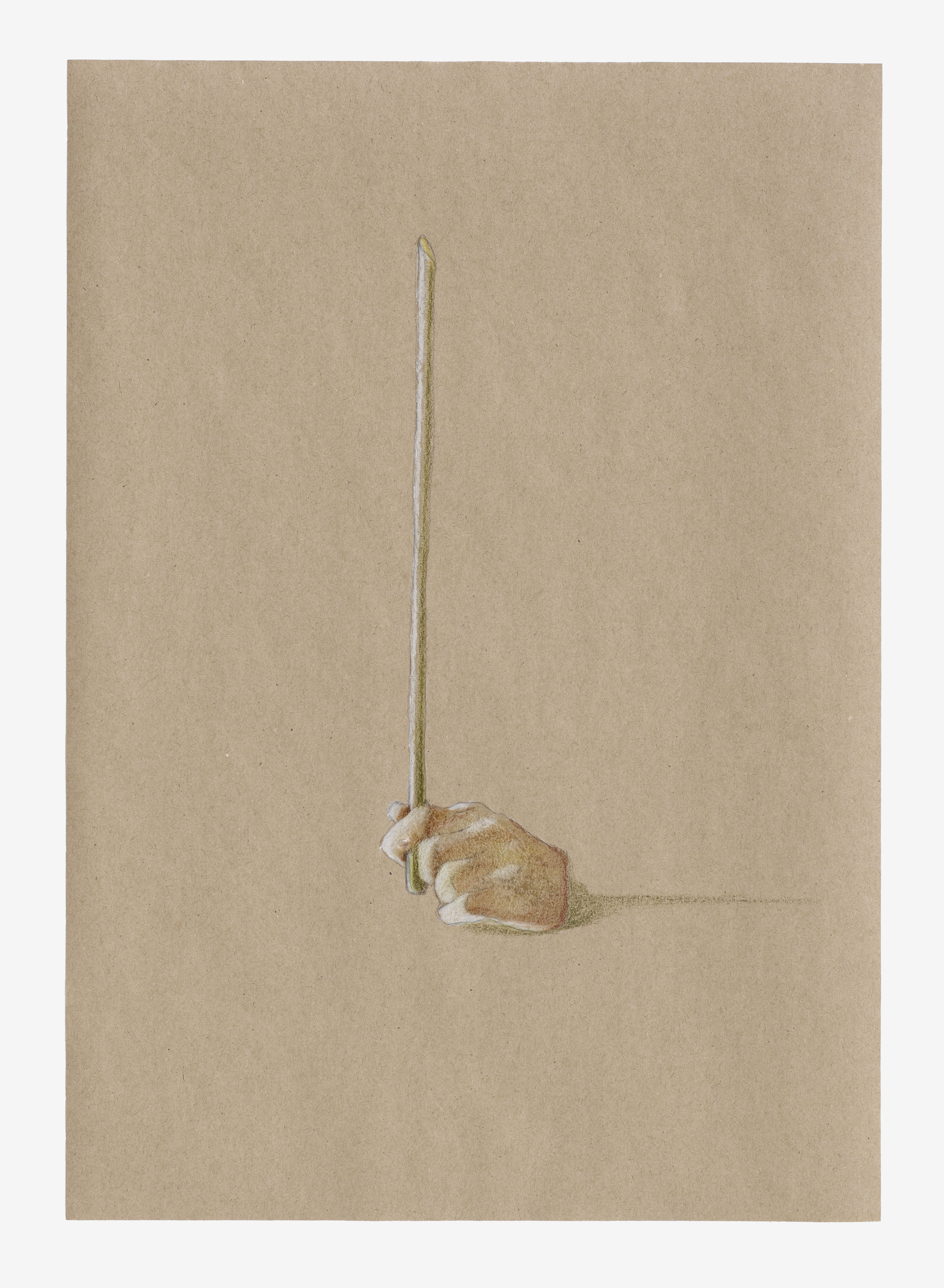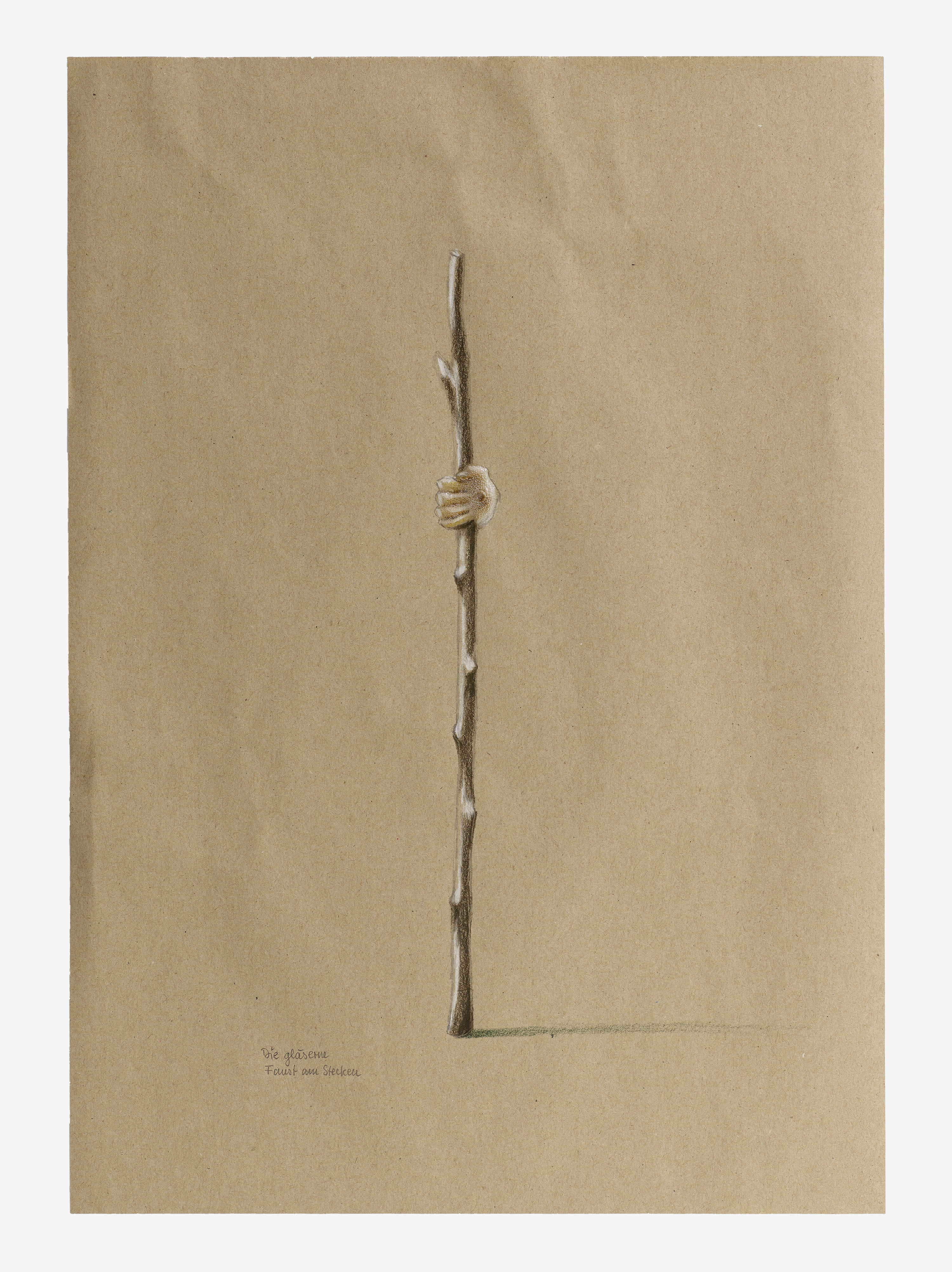 Mehr Ästchen, als Ast oder Baum. Mehr Strohhalm, sortieren sich die Stäbchen in eine spielerische Dimension, die passend zu Marco Spitzar’s ganzem Werk für ihn beherrschbar bleibt. Die Welt und ihre Erschlüsselung im Kleinen suchend, ausbalancierend sind es Gewichte, die daran hängen oder scheinbar verwachsen damit sind. Die gläserne Faust hält das Stäbchen eng umschlossen, aber es könnte auch das Herz sein – unblutig durchstoßen. Glaskelche glühbirnenartig in die richtung des Himmels zeigen. Gewachsen wie Eismäntel, schichtartig verwoben, wie Wurmfortsätze. Immer fix montiert und im Gleichgewicht. Denn denken und zeichnen kann man auch das was nicht funktioniert.