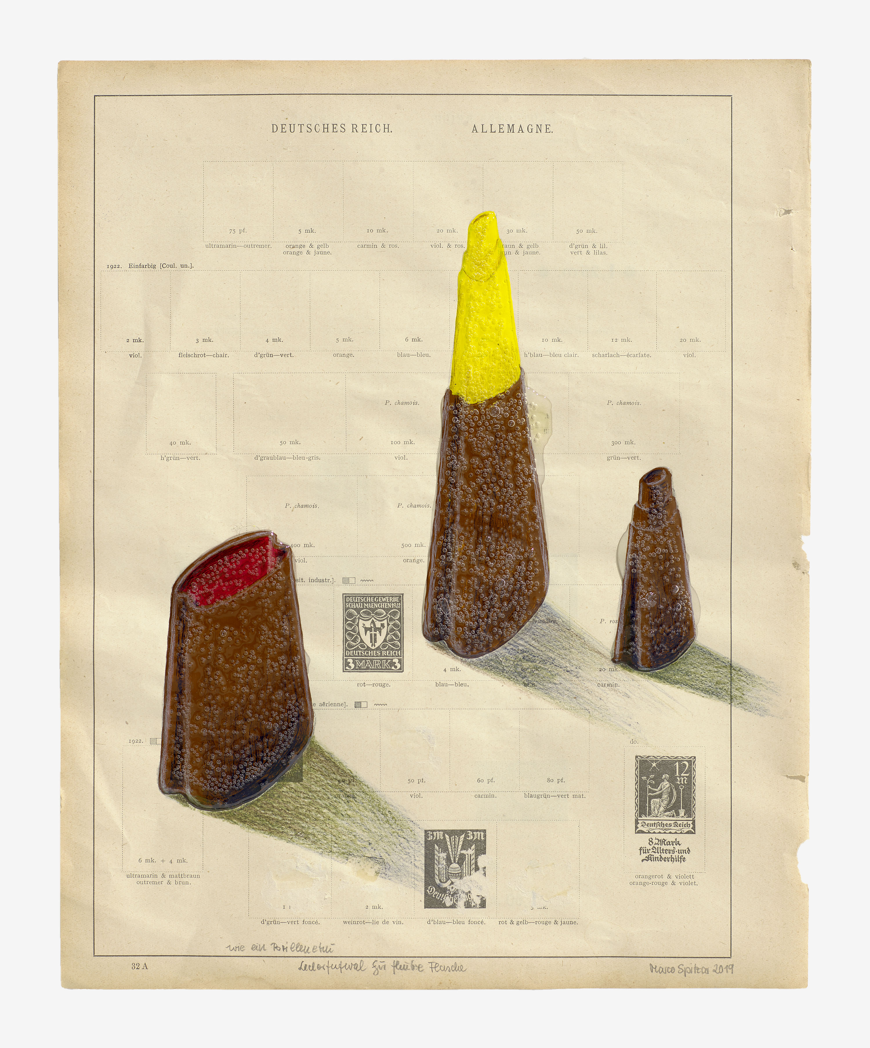 Acryl und Buntstift mit UHU auf historischem Papier