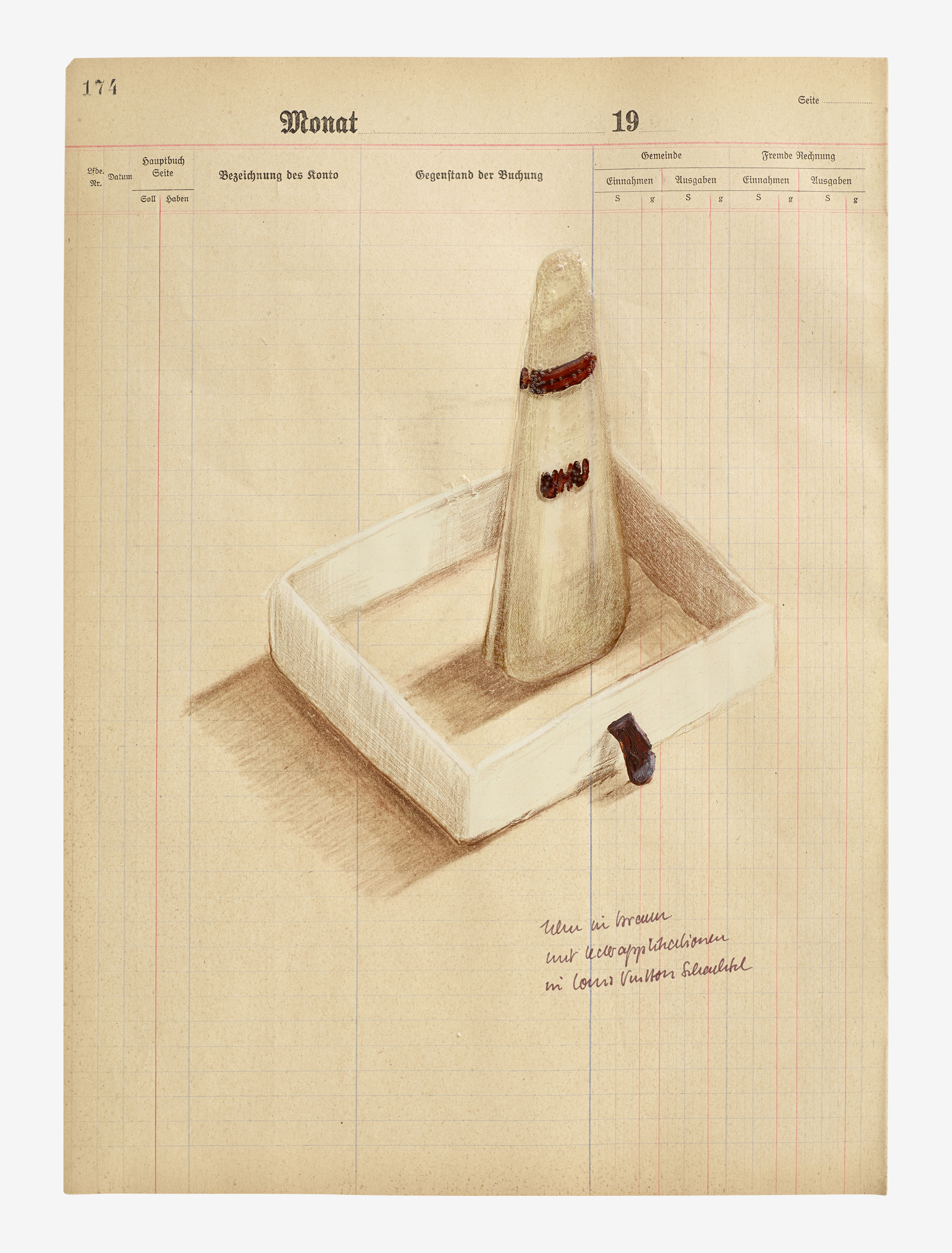 Material: Acryl und Buntstift mit UHU auf historischem Kontorpapier