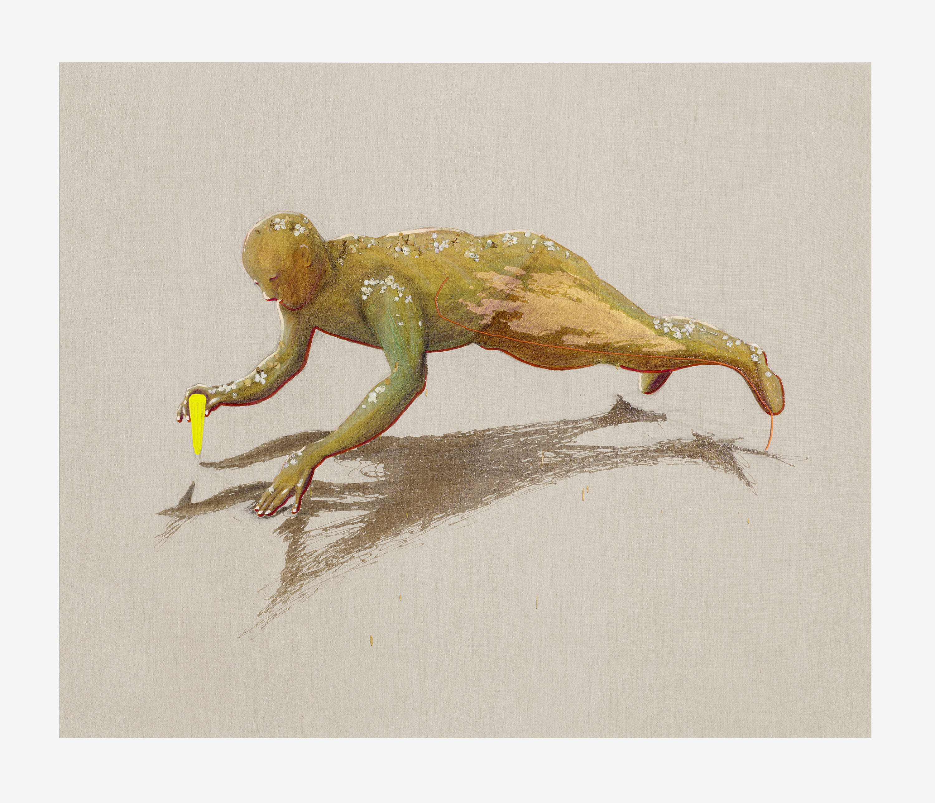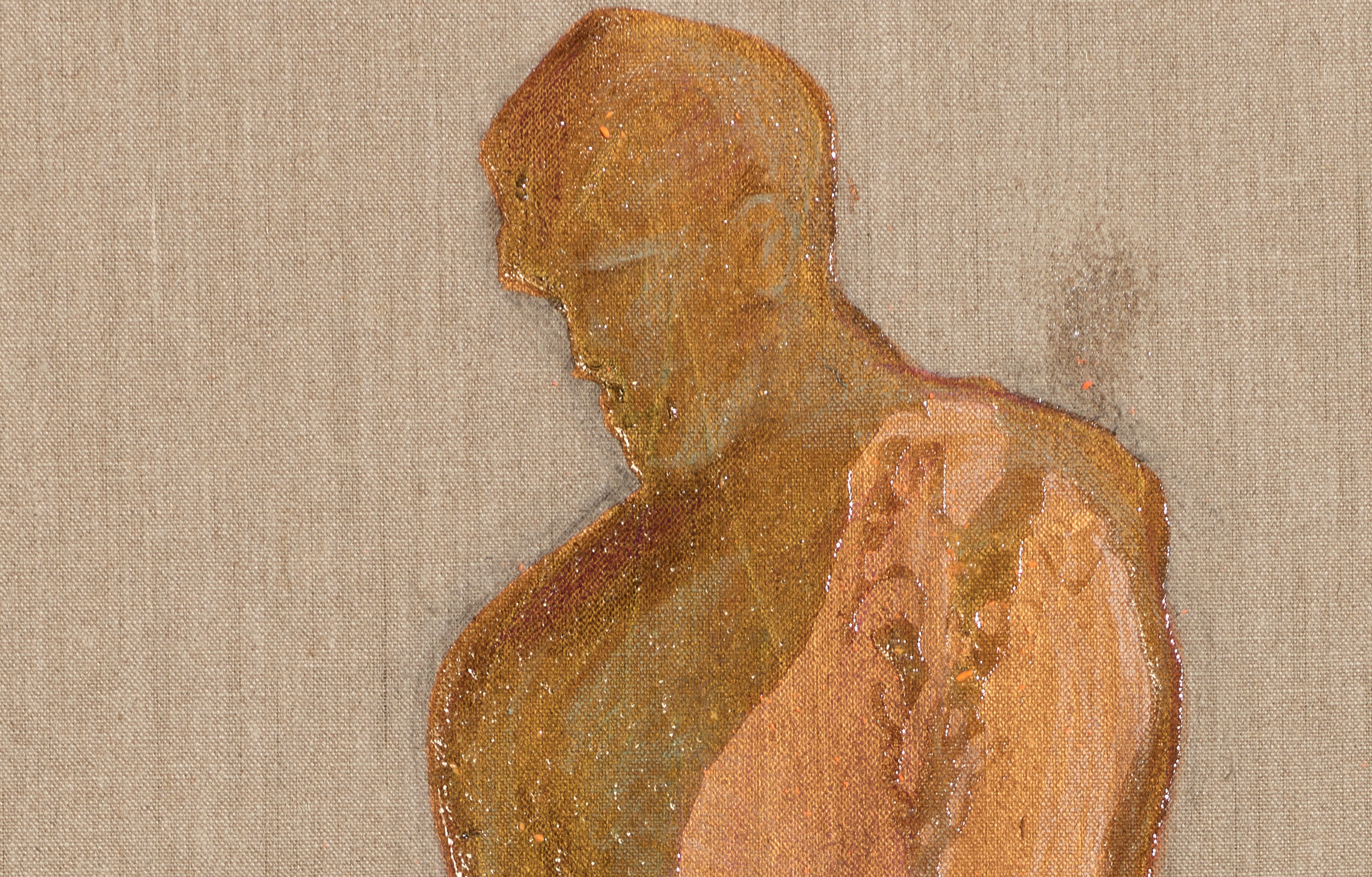 Die schwebenden, die Engel erscheinen manchmal tönern, bleiern und schwer. Kupfern schimmernd wie eingetaucht, aus Glut und Asche geboren. Verschmolzen, verklebt mit Blüten. Freigelegt, freigeschabt, mit Pinseln wie Archäologen, erinnert es Marco Spitzar an die versunkene, im 18. Jahrhundert entdeckte und ausgegrabene Stadt am Vesuv bei Neapel. Pompeji zieht uns in den Bann, weil wir die vielen Geschichten fast greifen und spüren können. Die heiße Lava und die Asche hat uns die vergangene Welt einzementiert und alles so erhalten, dass wir Schritt für Schritt, freilegen und entdecken dürfen. Verschlungene Körper und farbenfrohe Fresken inspirieren zu zeitlosen Bildern, verschmolzen mit der einzigartigen Klebewelt von Spitzar.