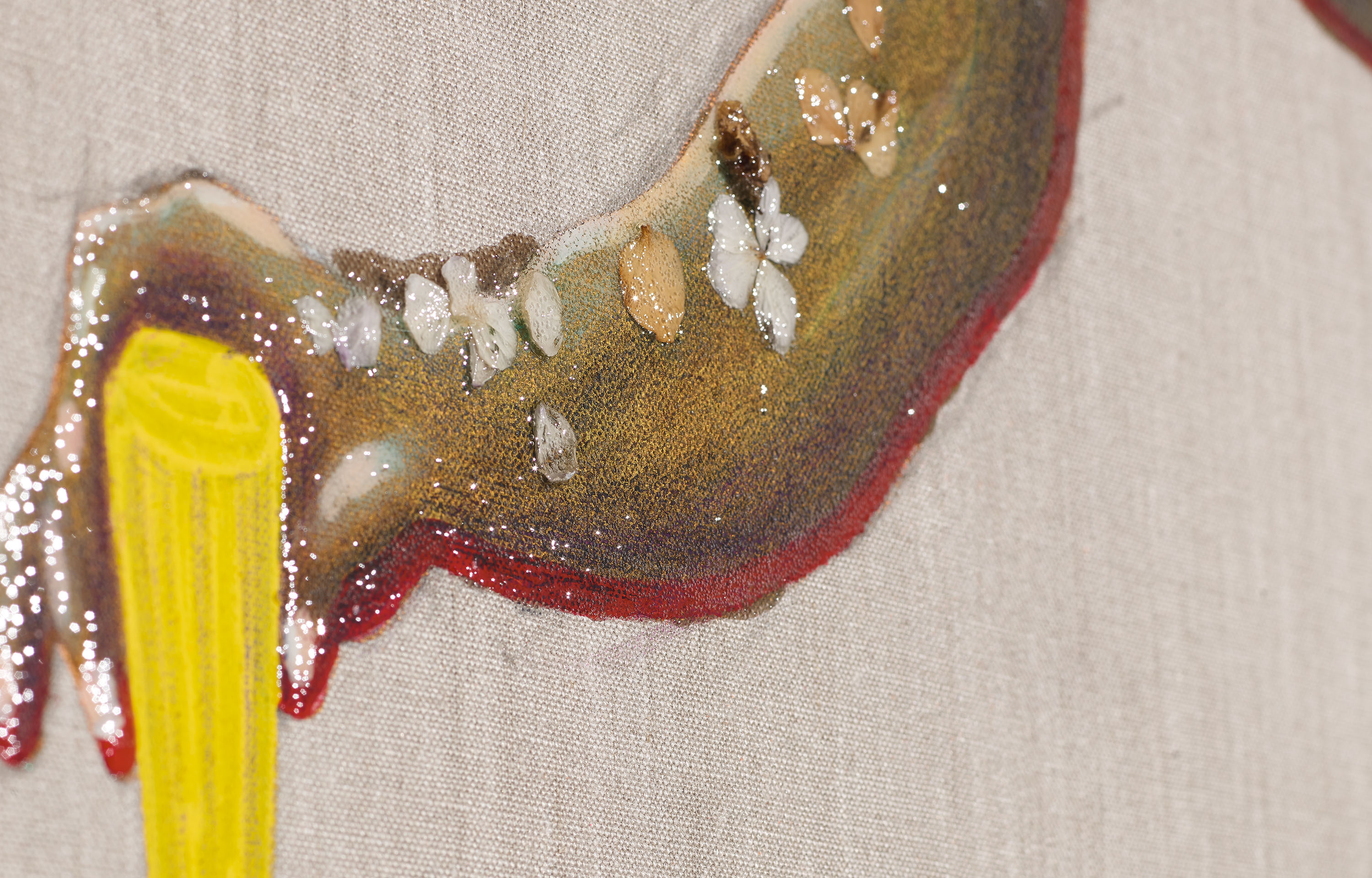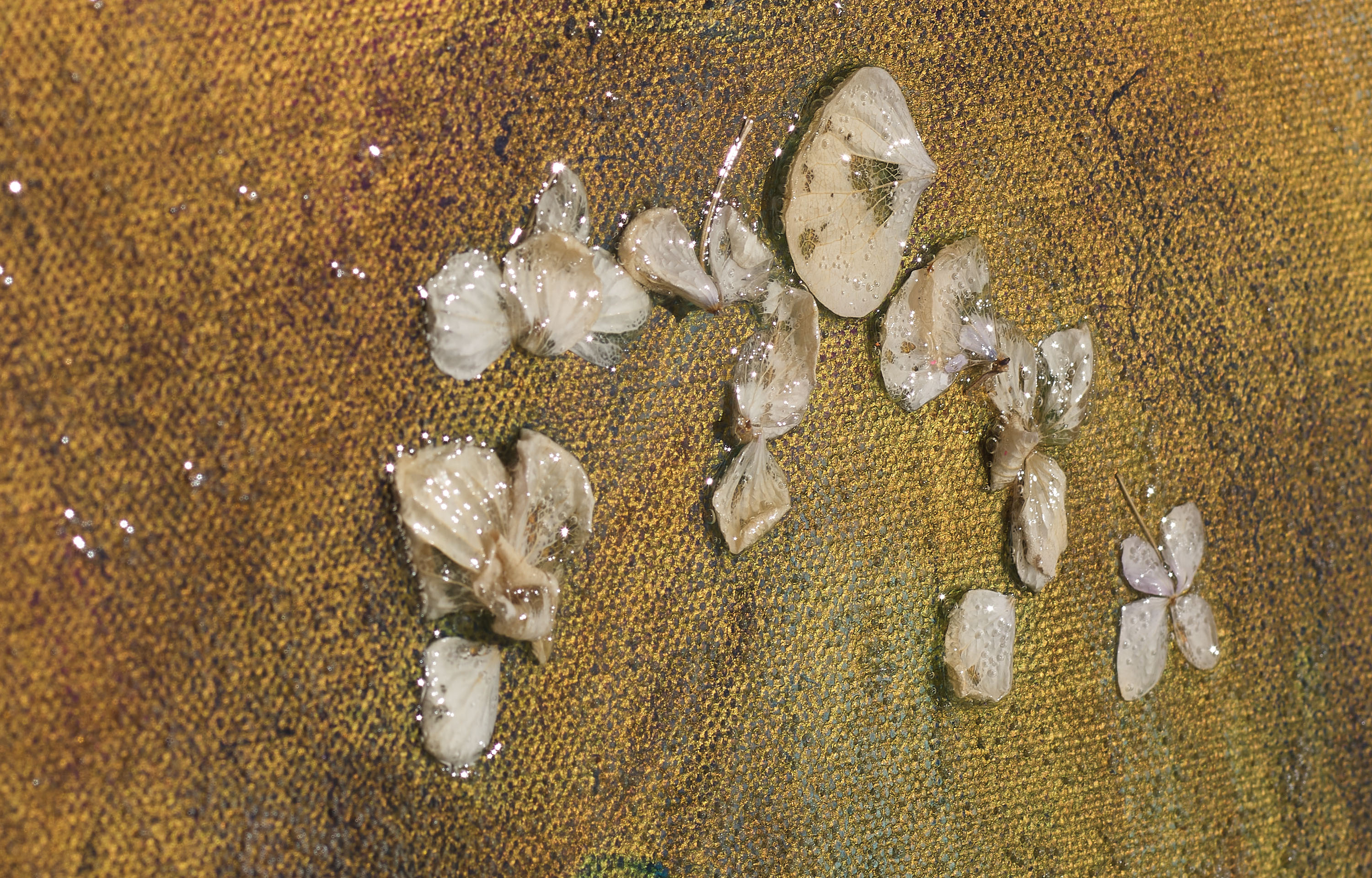 Kupfer und Blüten mit UHU auf Naturleinwänden